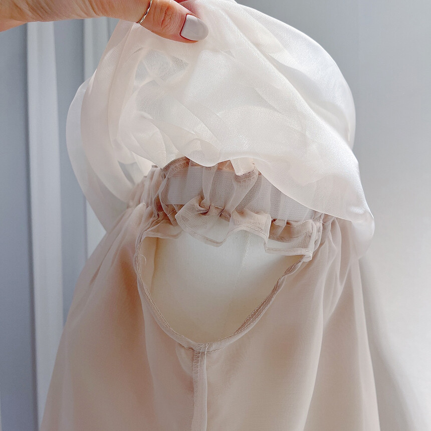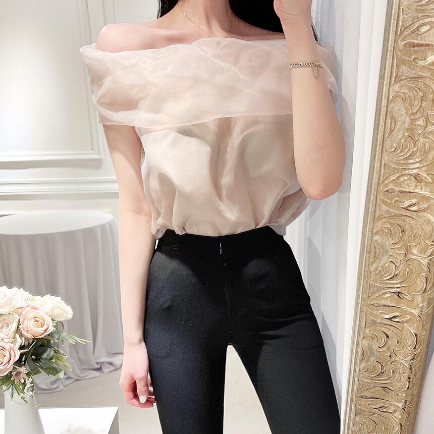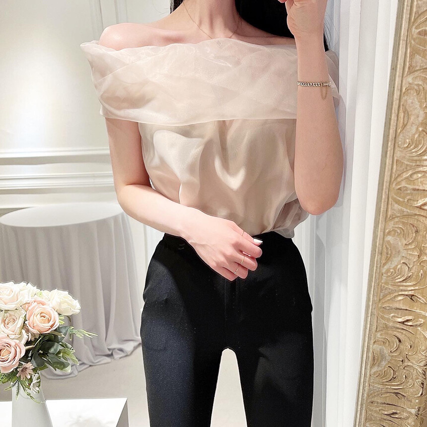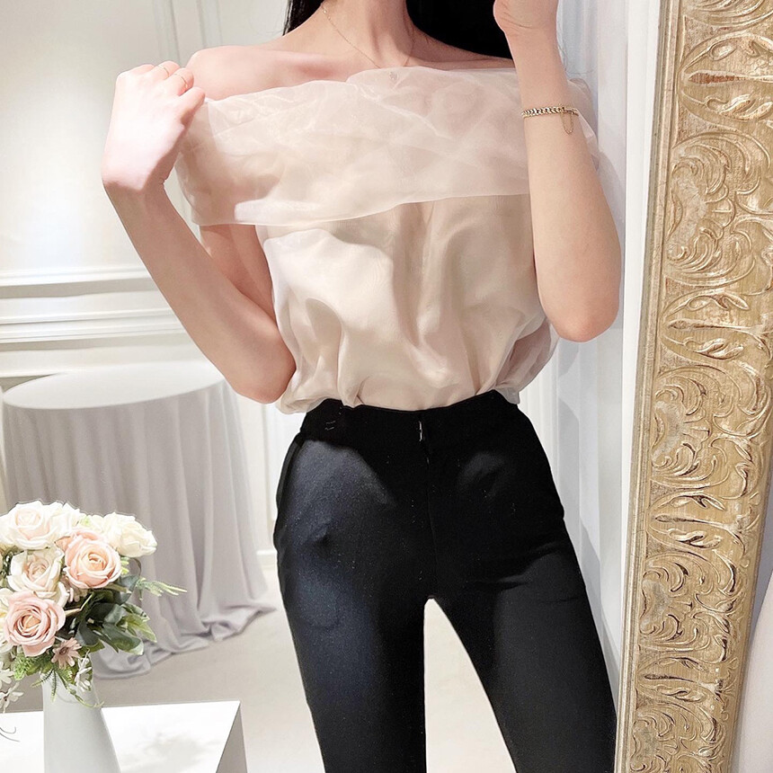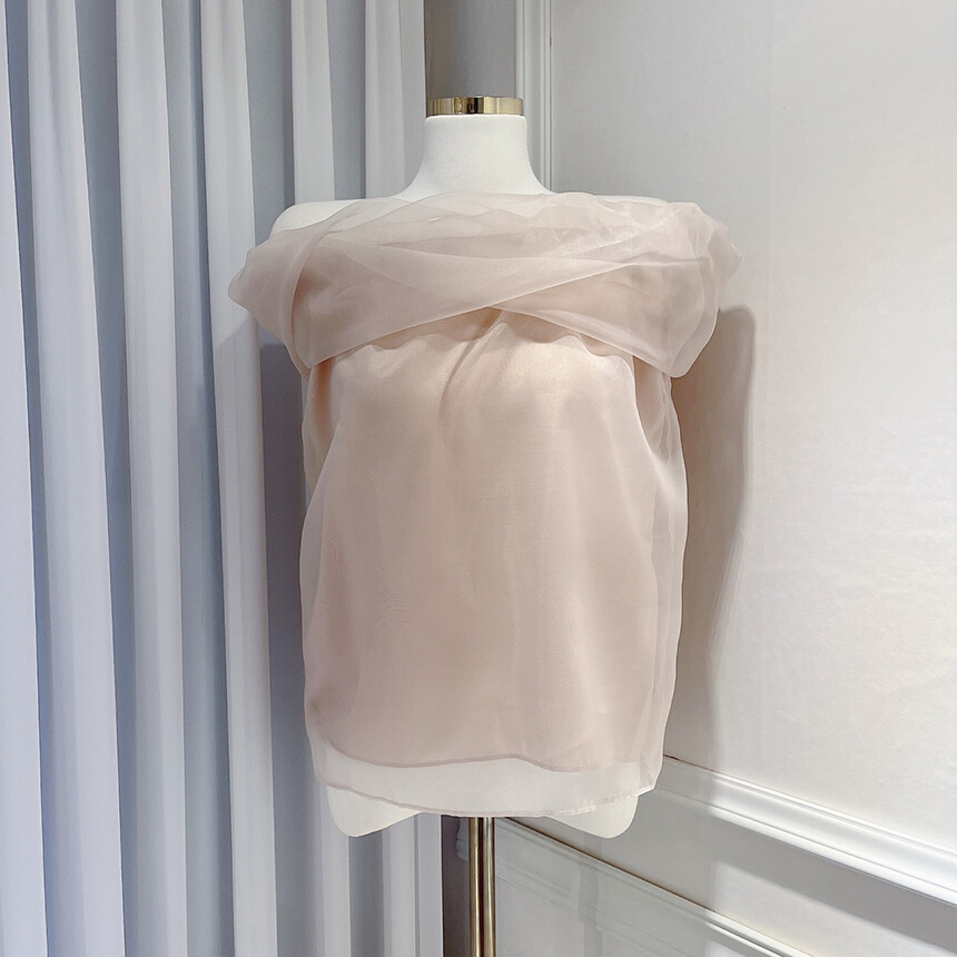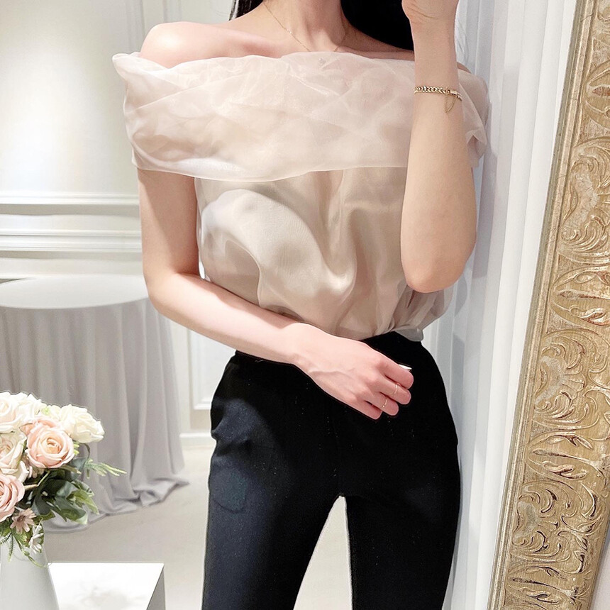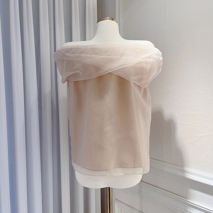 (고퀄리티) 민소매 노방 오간자 시스루 오프숄더 블라우스