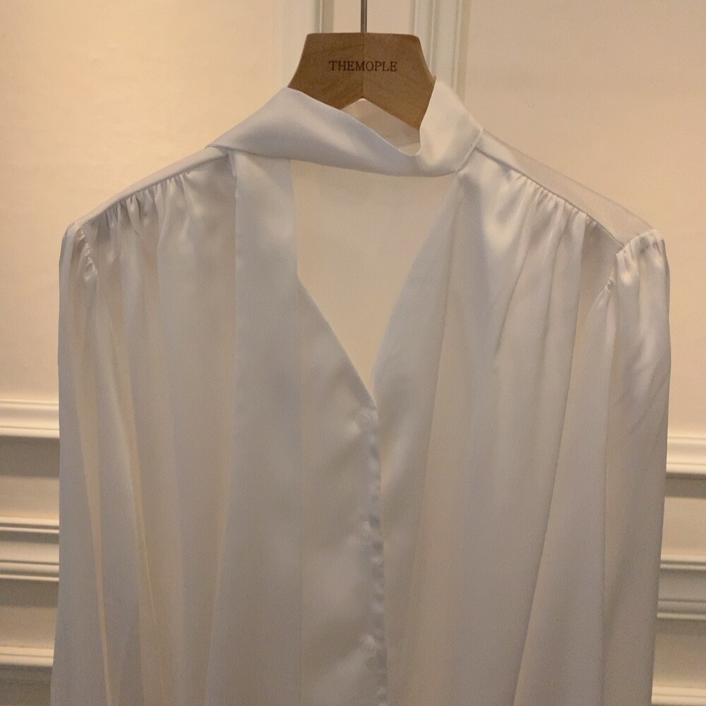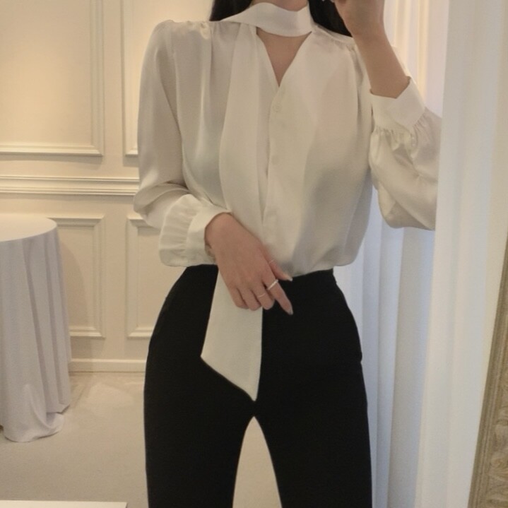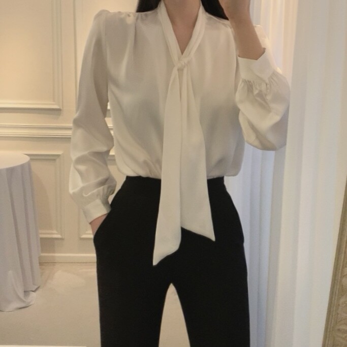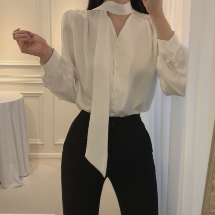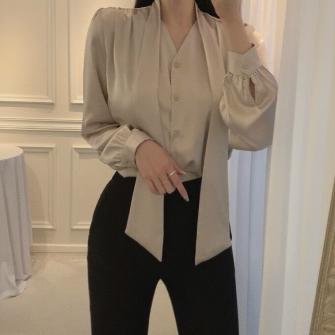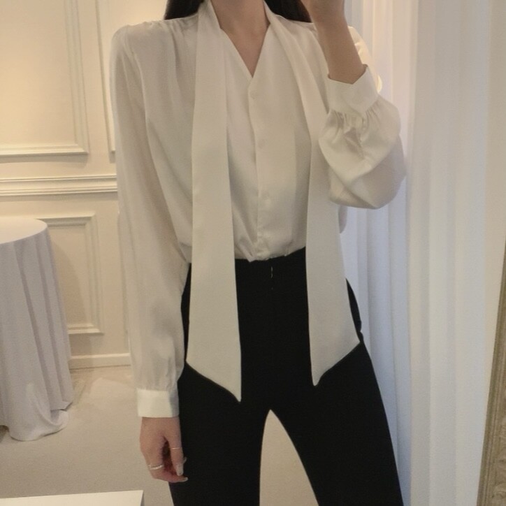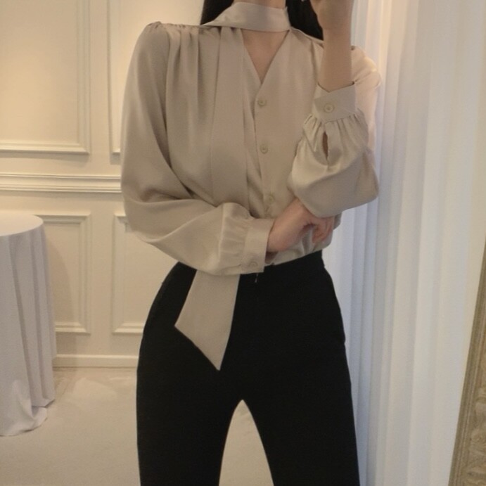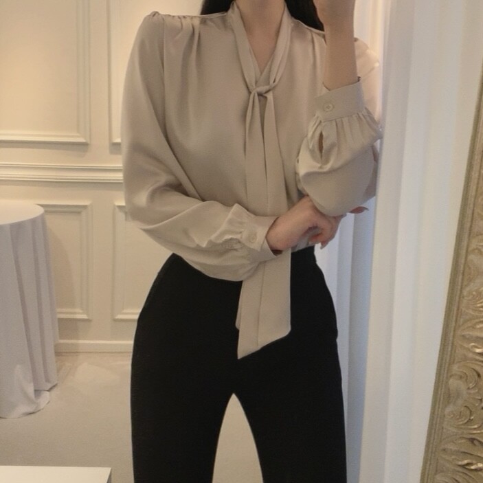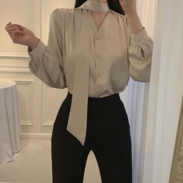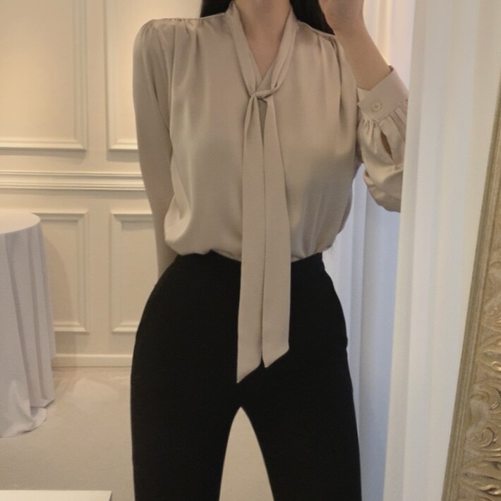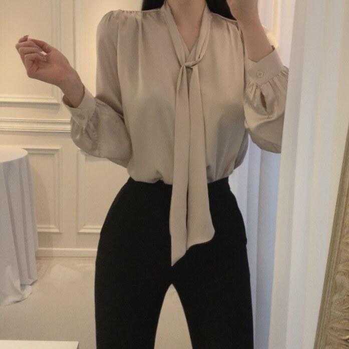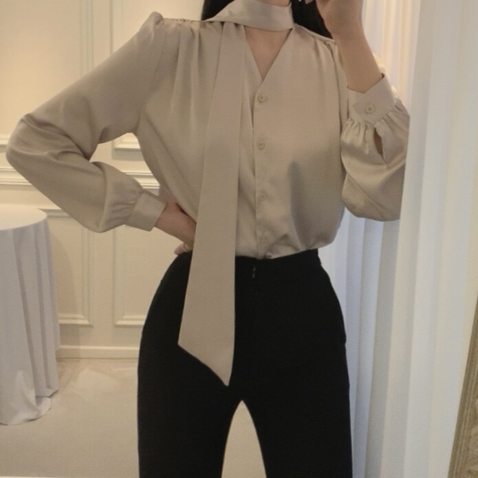 샤틴 실크 럭셔리 스카프 타이 단추 블라우스 (하객룩 오피스룩 결혼식)