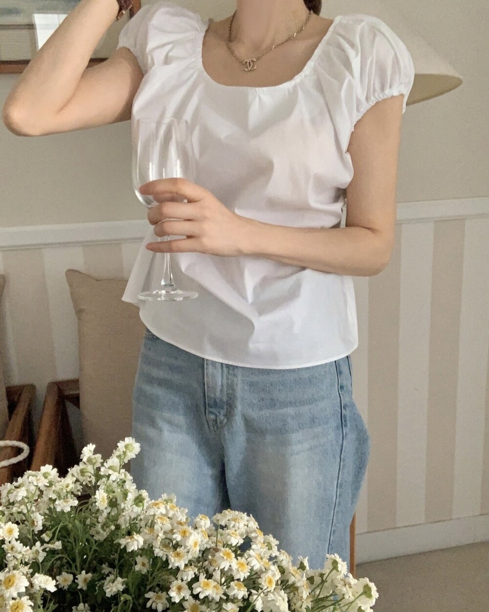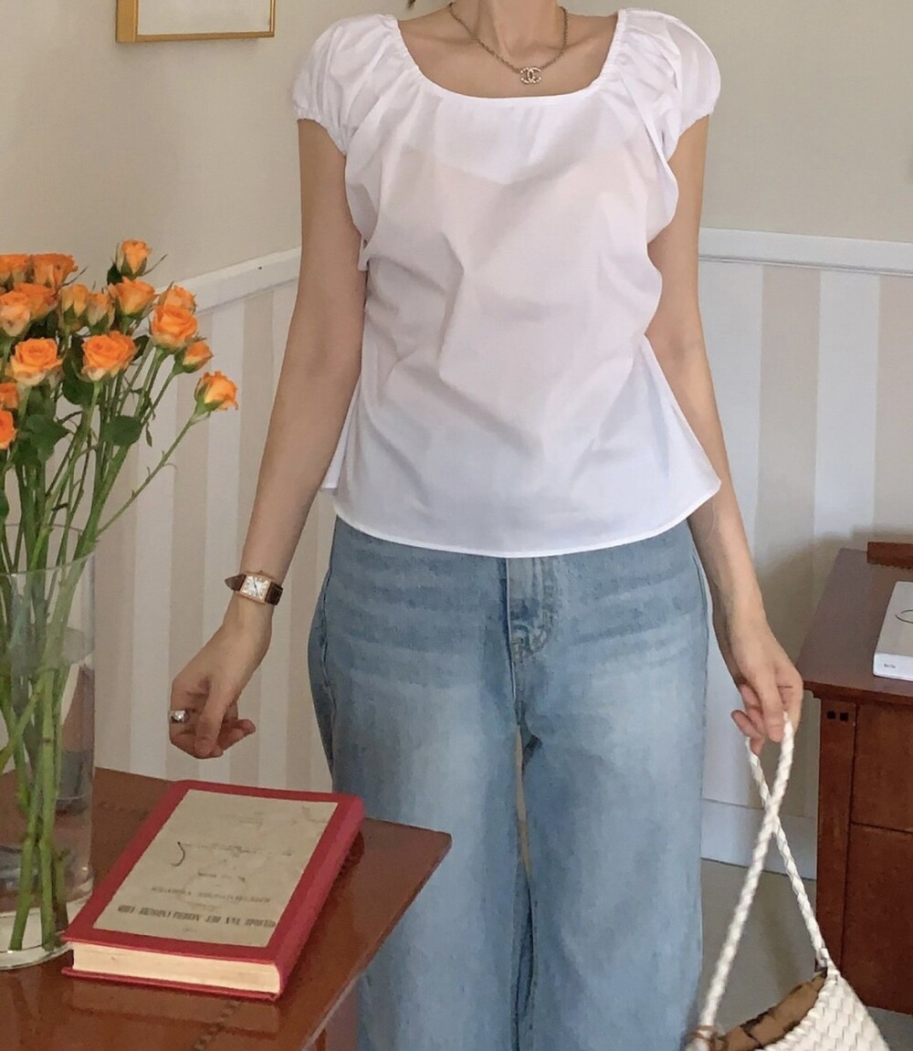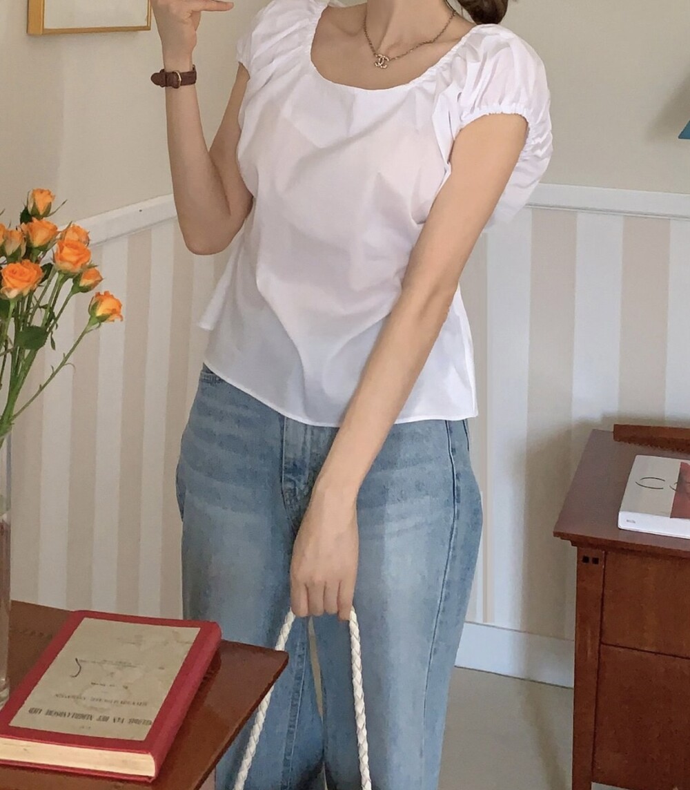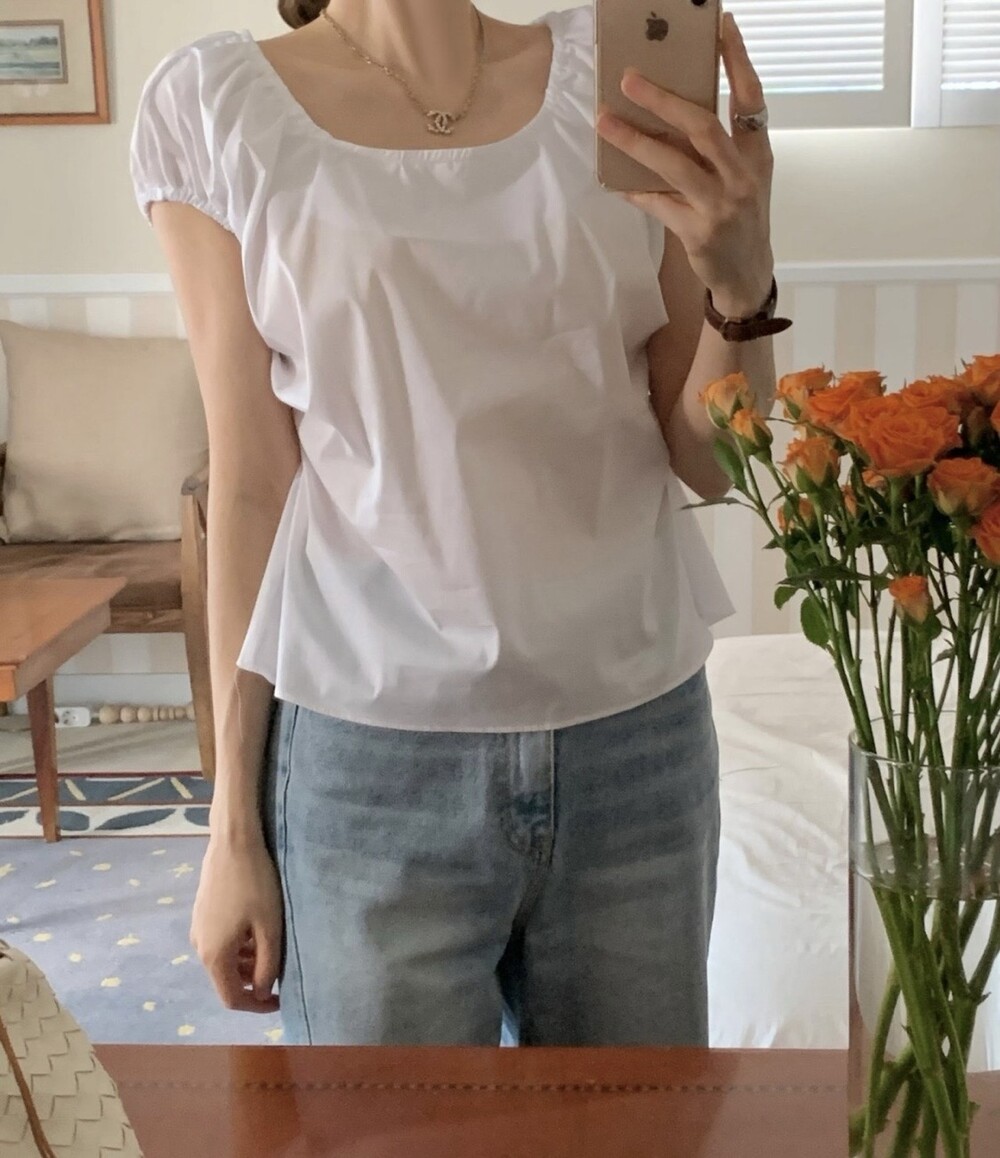 캡소매 퍼프 벌룬 소매 뒷밴딩 여리 블라우스 (하객룩 데이트룩 데일리룩)