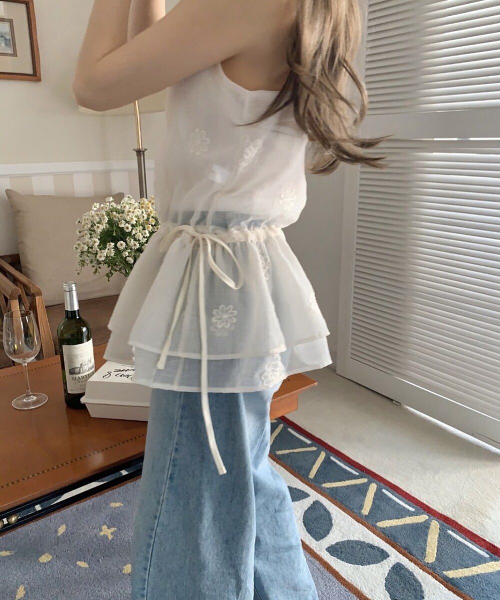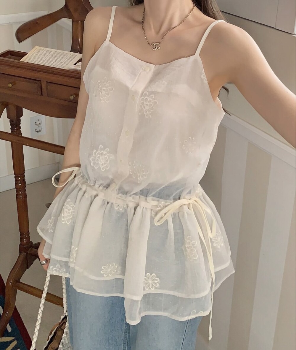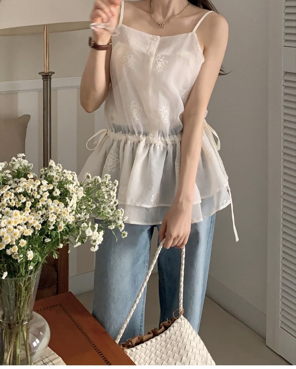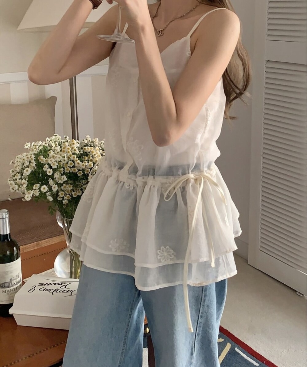 끈나시 민소매 꽃 자수 허리끈 스트링 레이어드 프릴 원피스 블라우스 (데이트룩 여행룩)