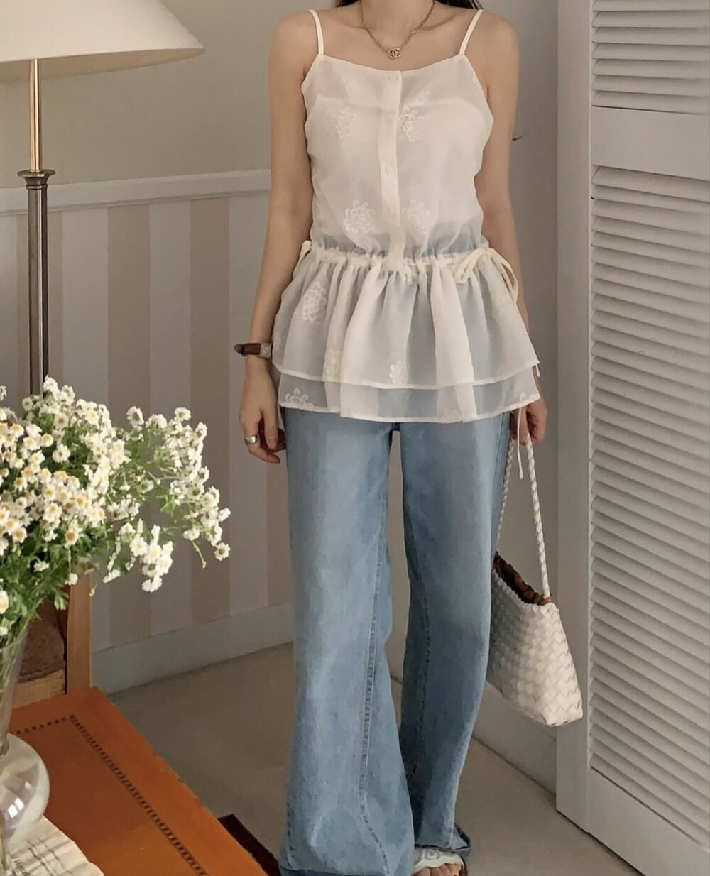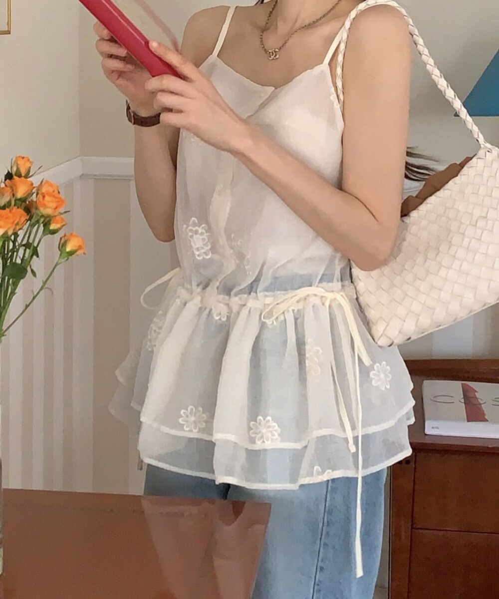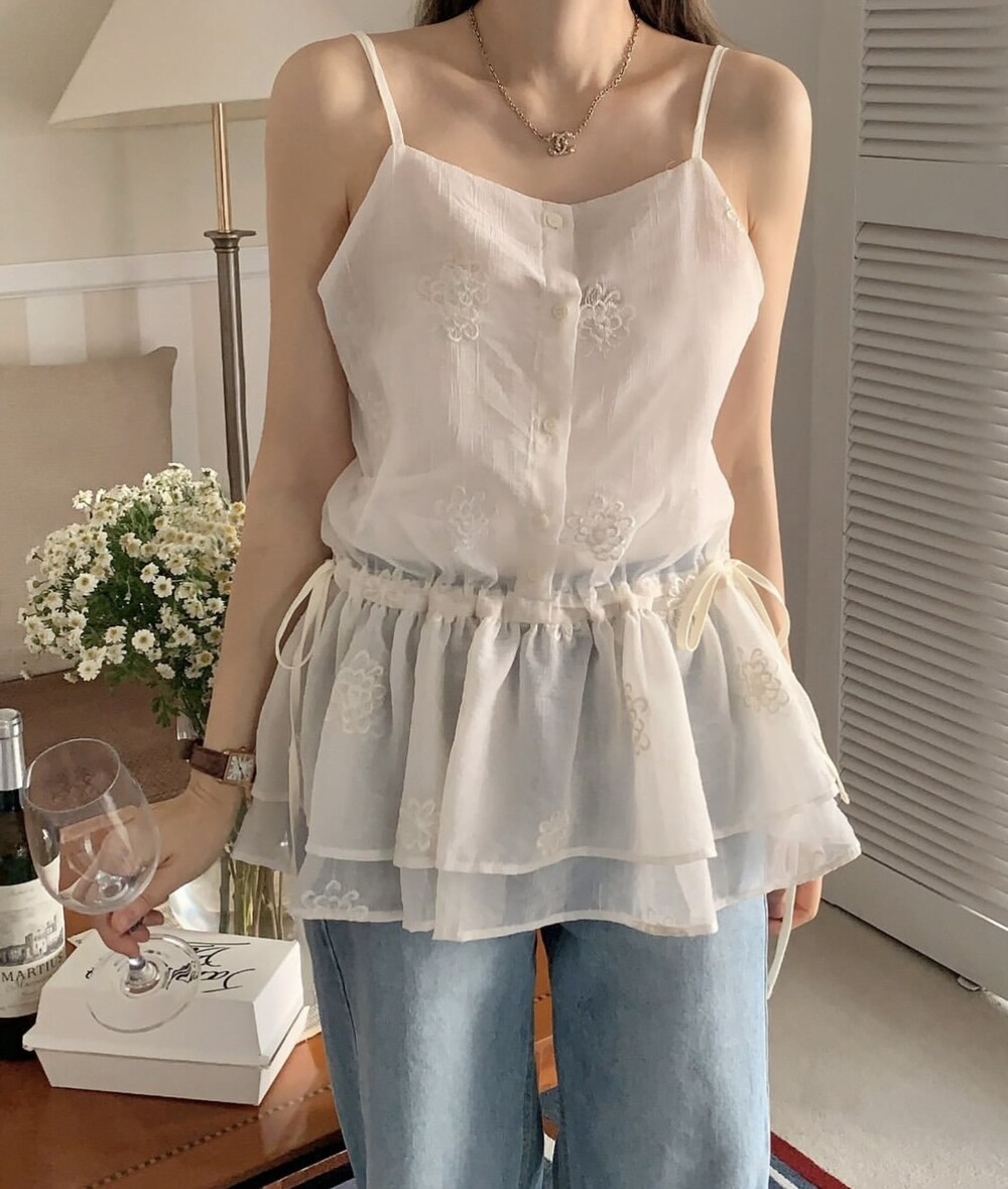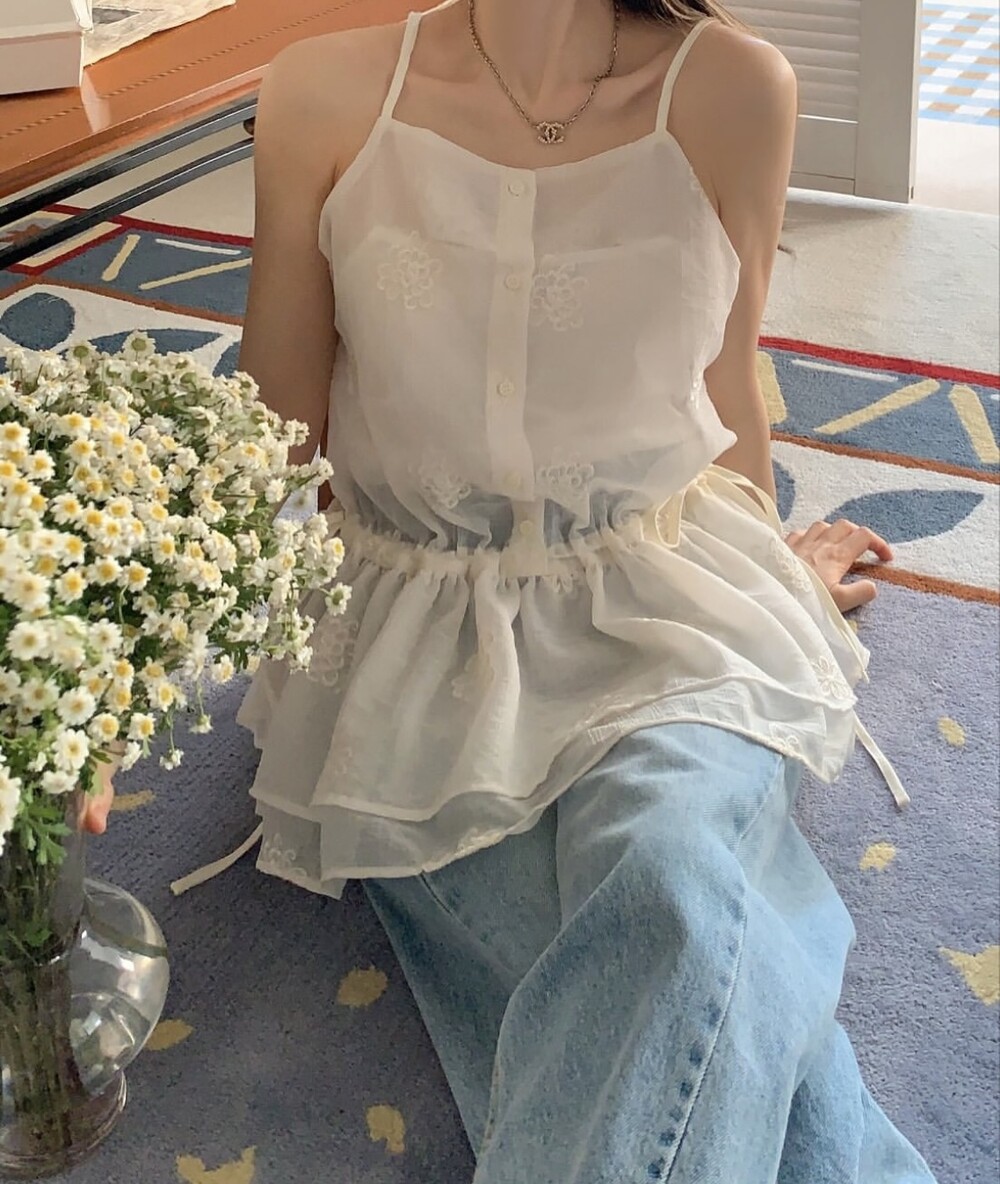 끈나시 민소매 꽃 자수 허리끈 스트링 레이어드 프릴 원피스 블라우스 (데이트룩 여행룩)