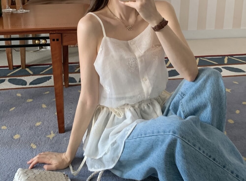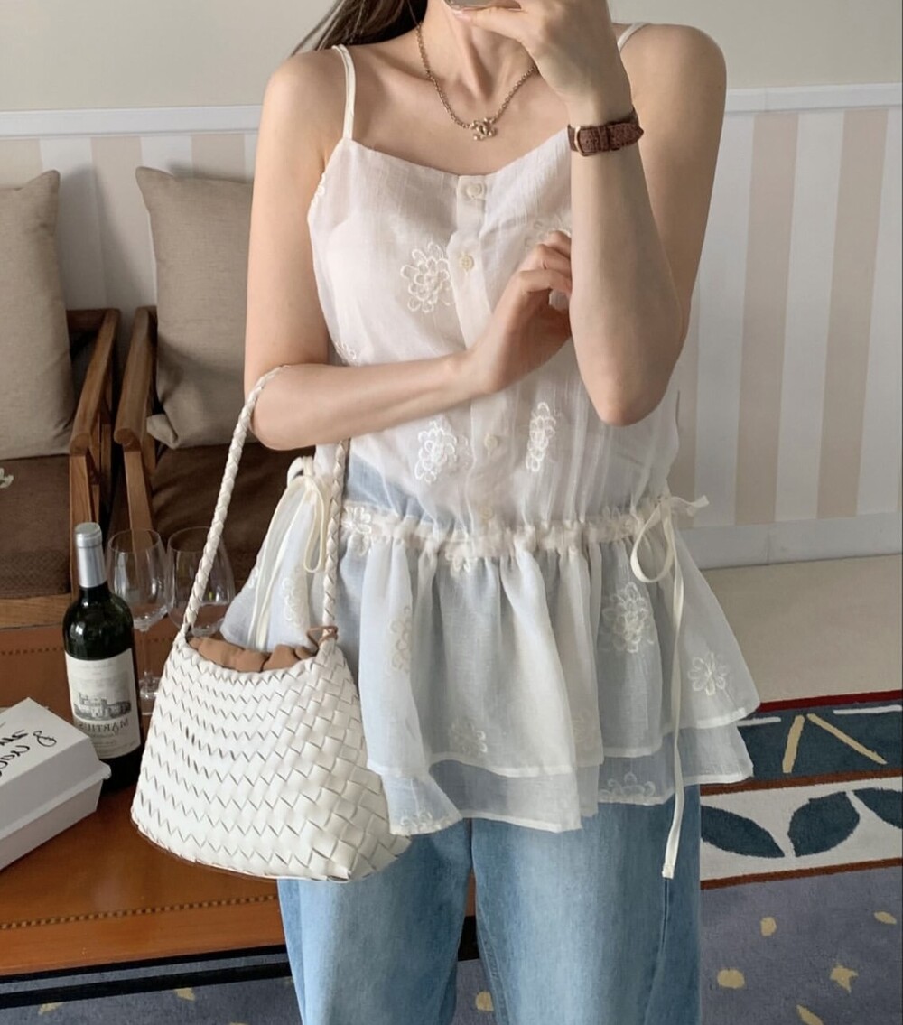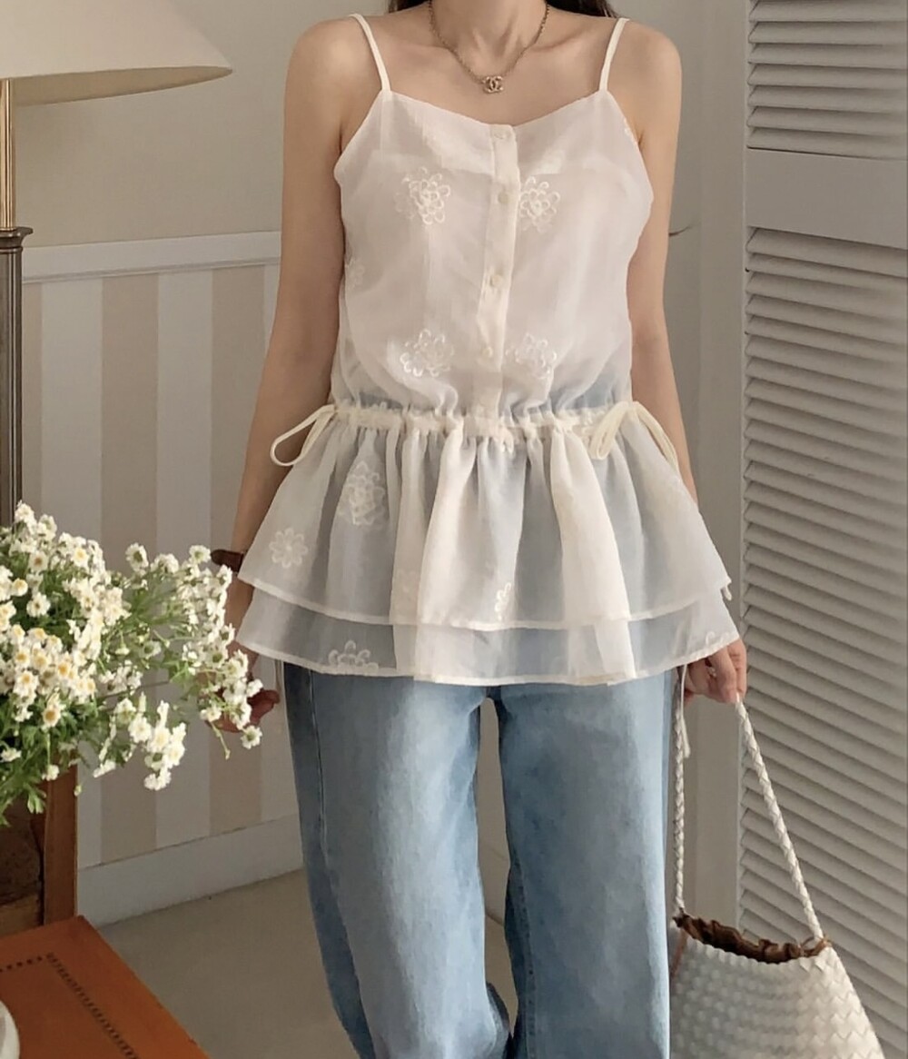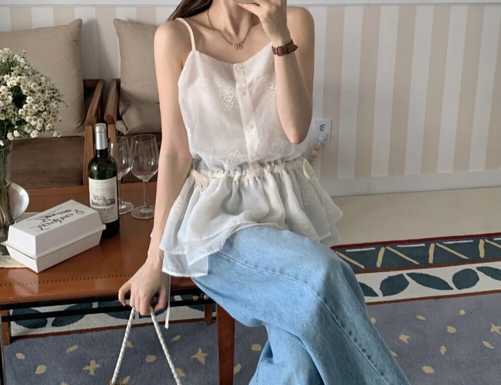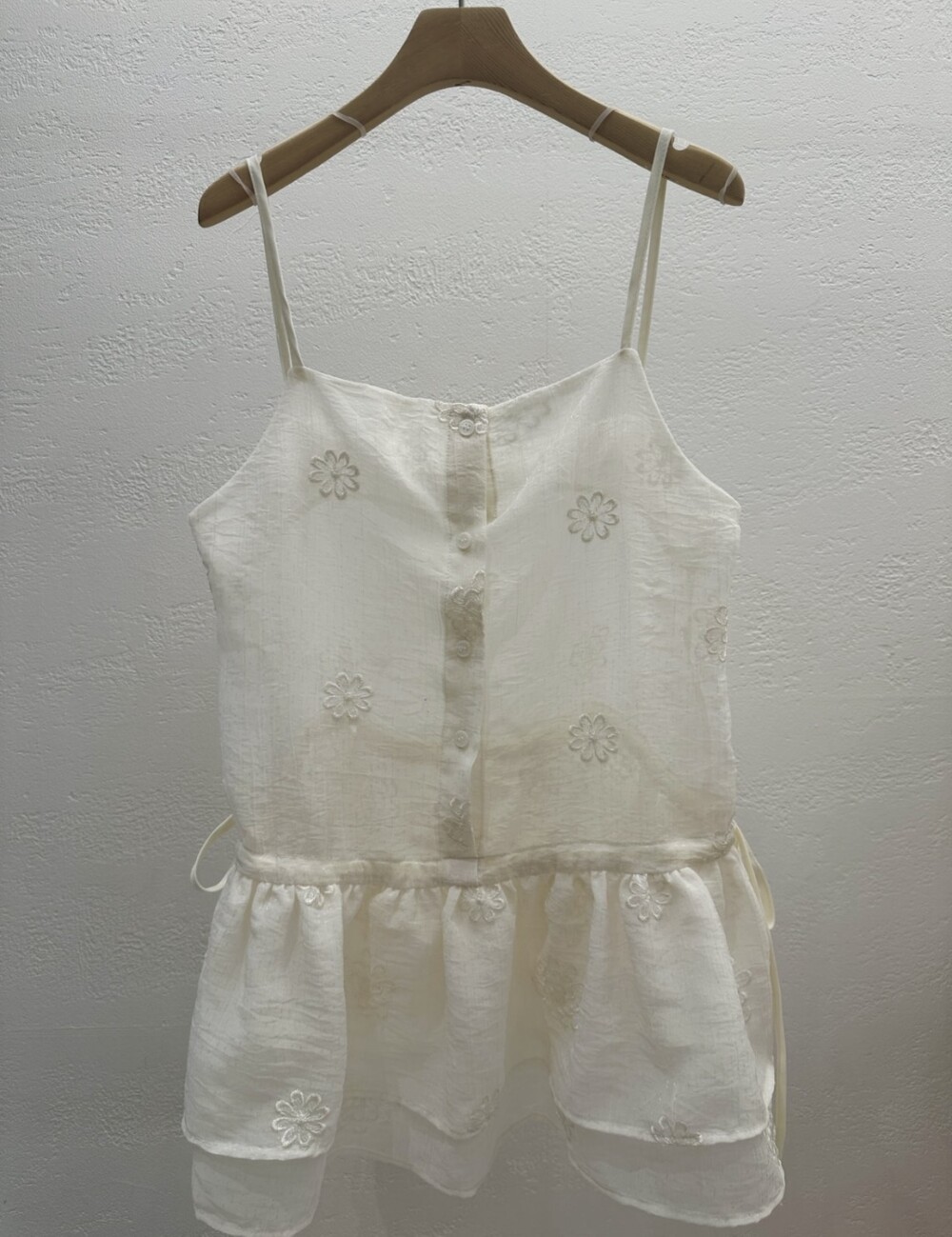 끈나시 민소매 꽃 자수 허리끈 스트링 레이어드 프릴 원피스 블라우스 (데이트룩 여행룩)