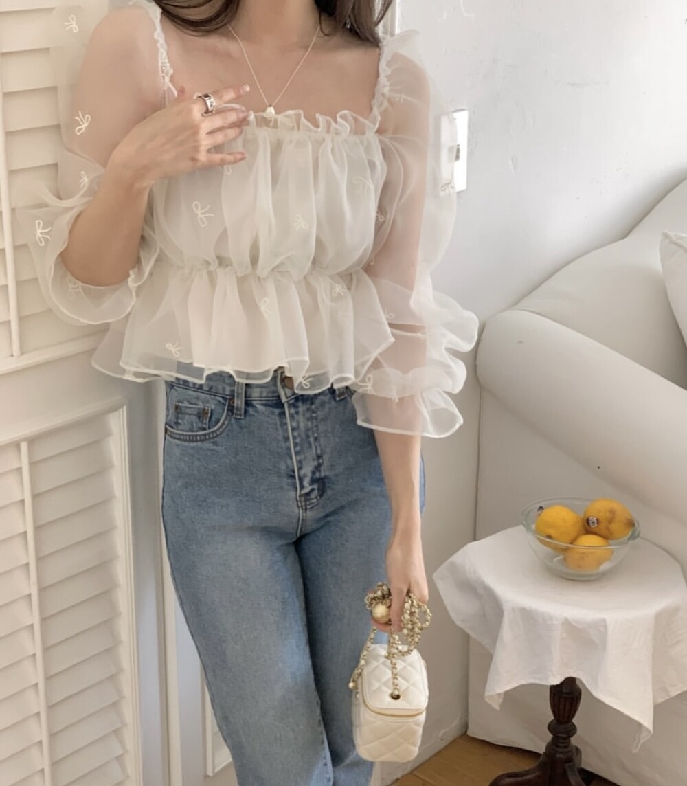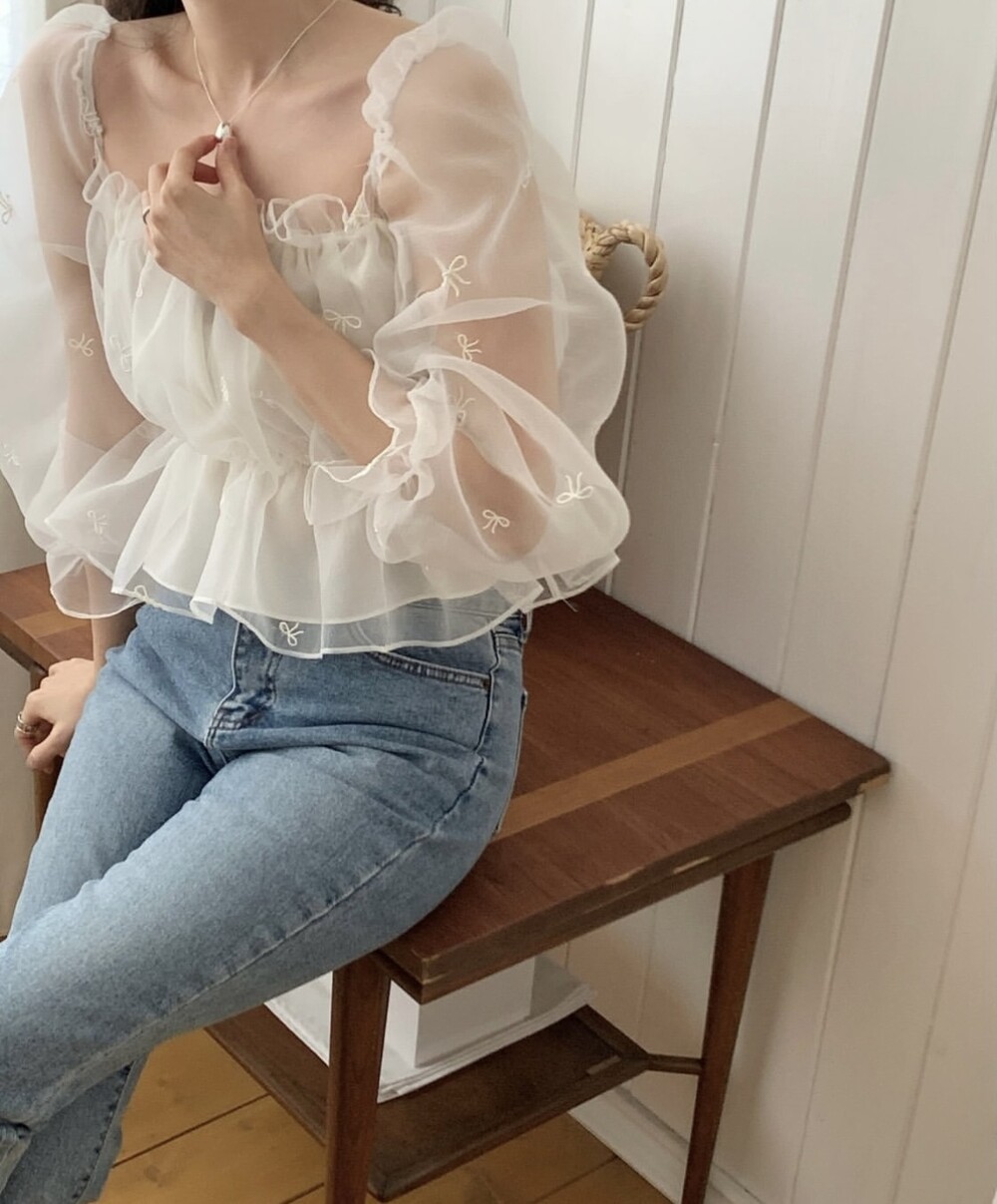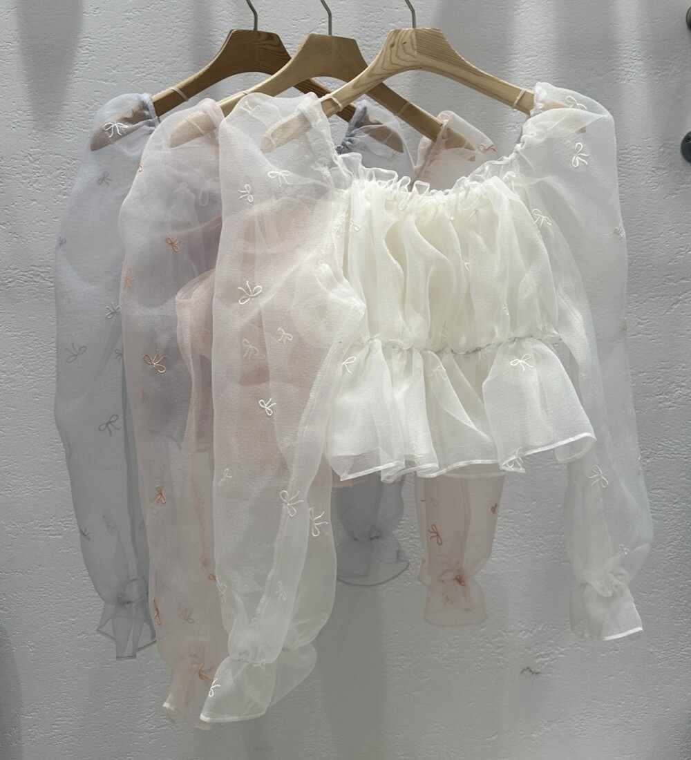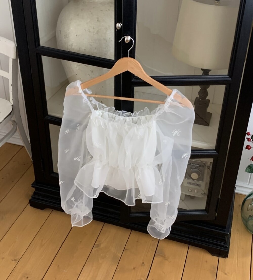 리본 자수 노방 오간자 시스루 스퀘어넥 숏 플레어 블라우스 (데이트룩 파티룩 특별한날)