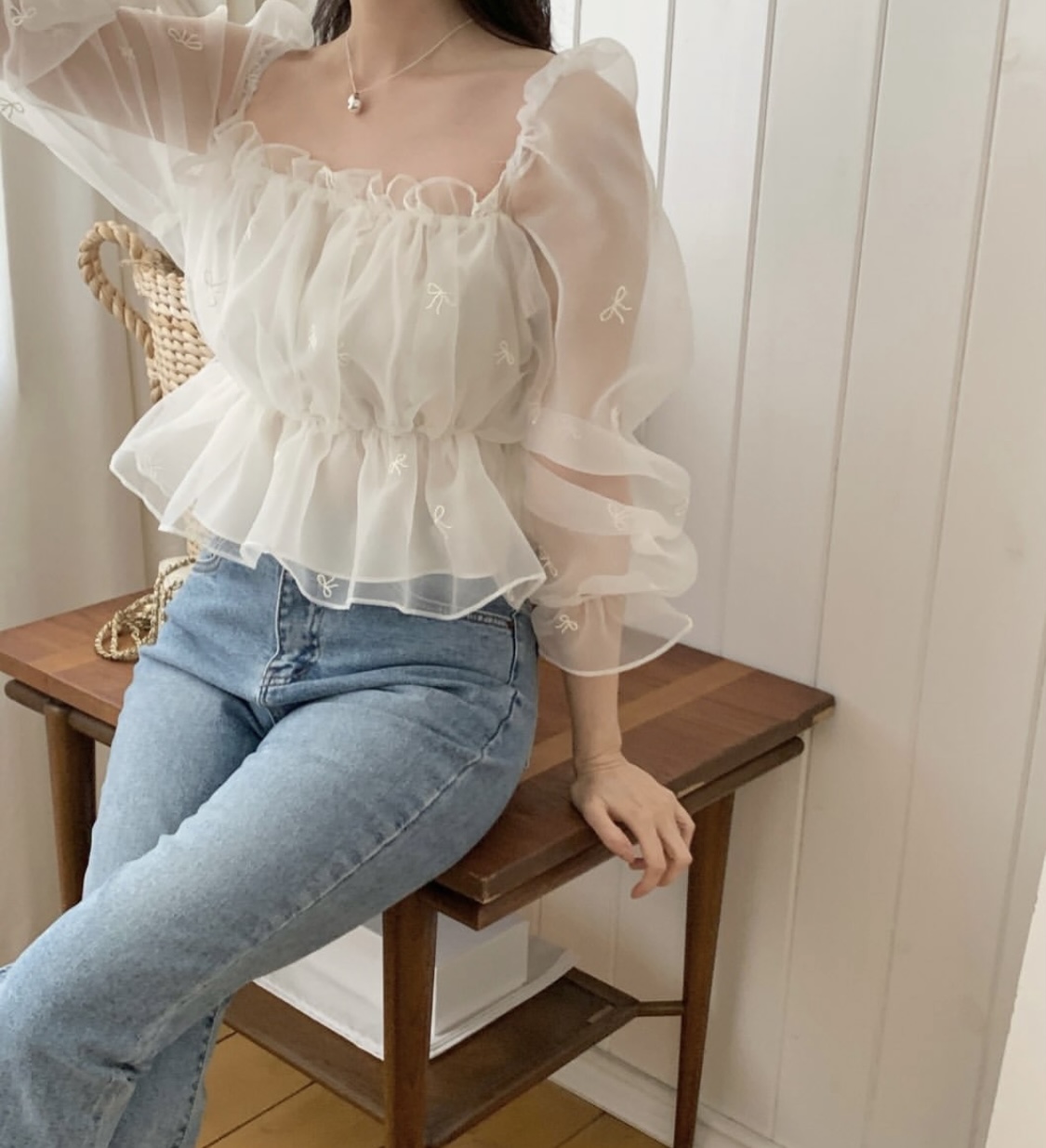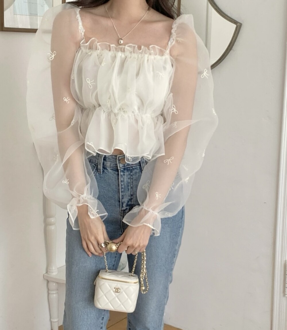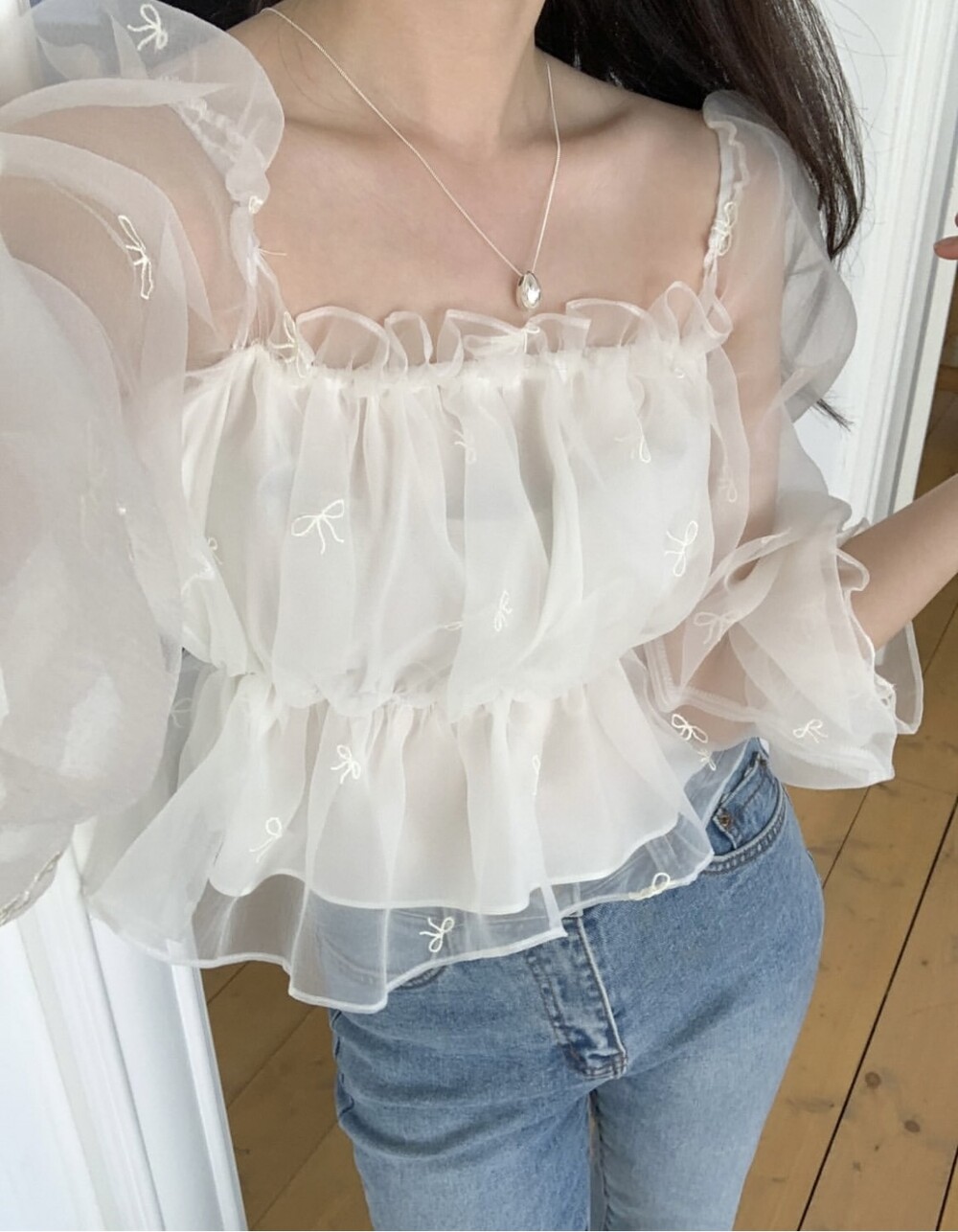리본 자수 노방 오간자 시스루 스퀘어넥 숏 플레어 블라우스 (데이트룩 파티룩 특별한날)