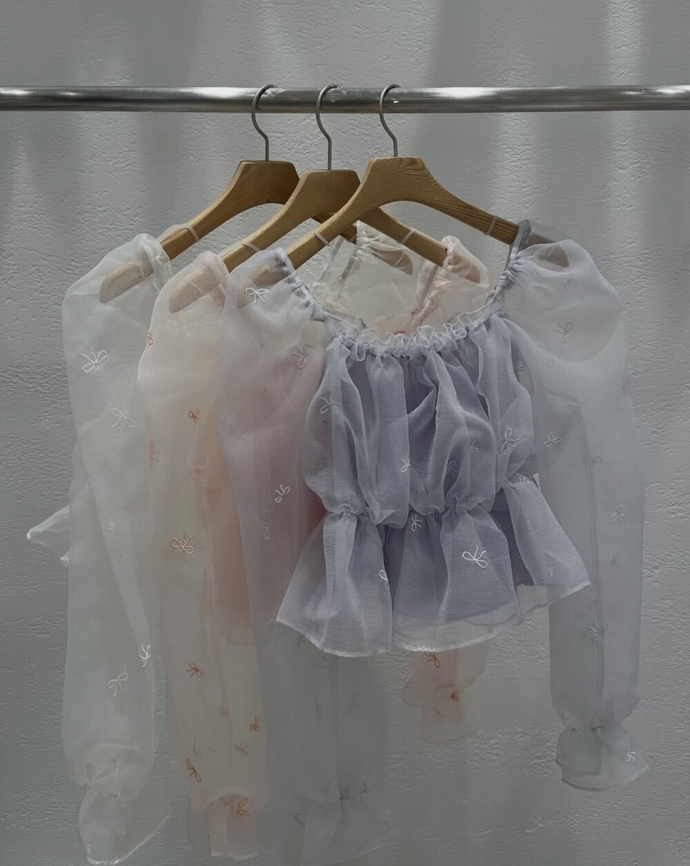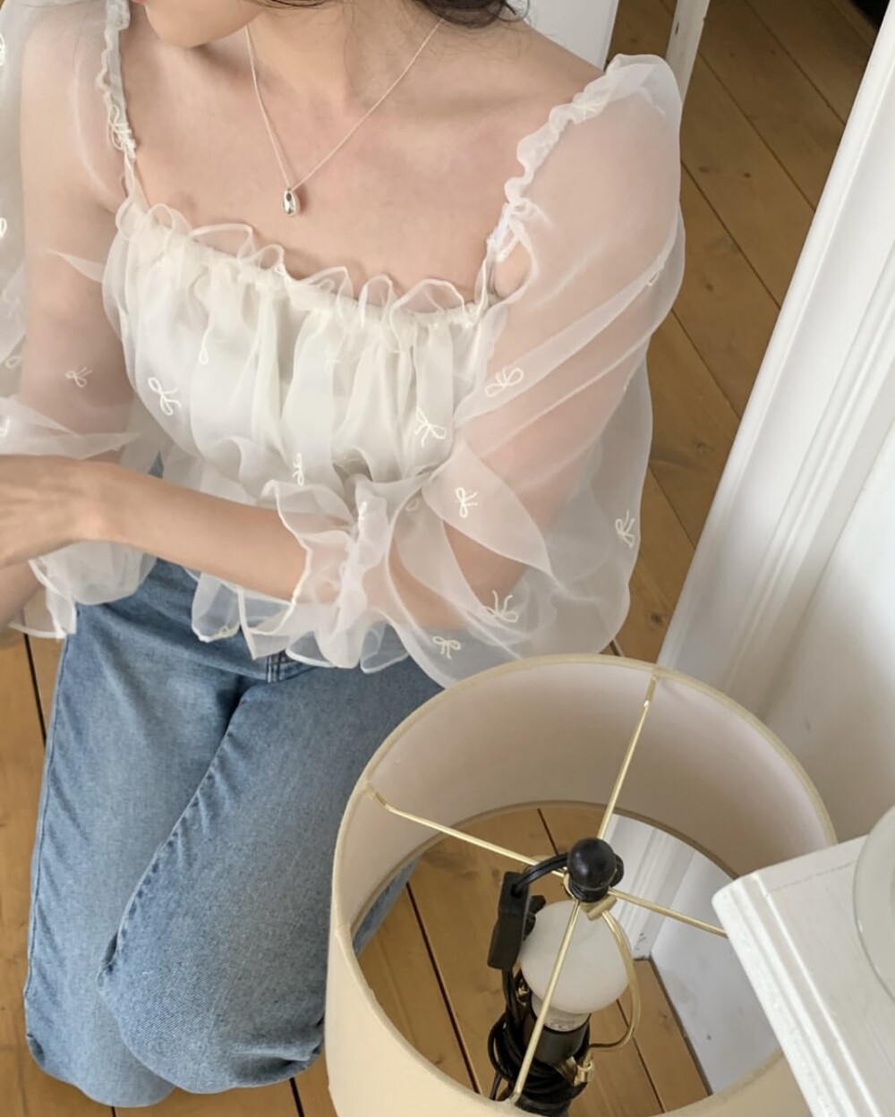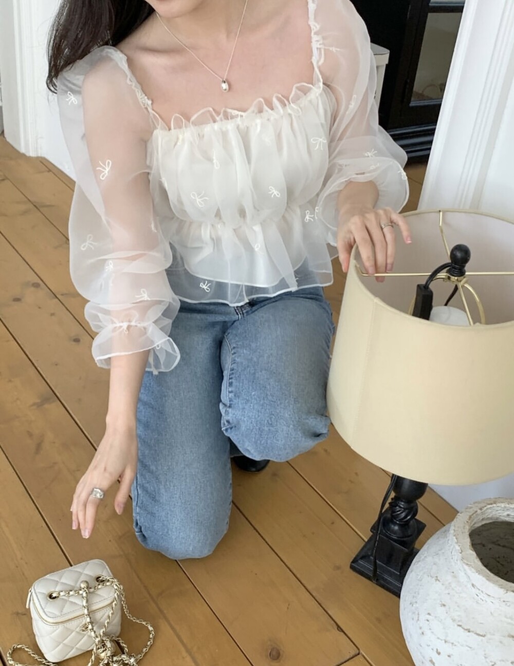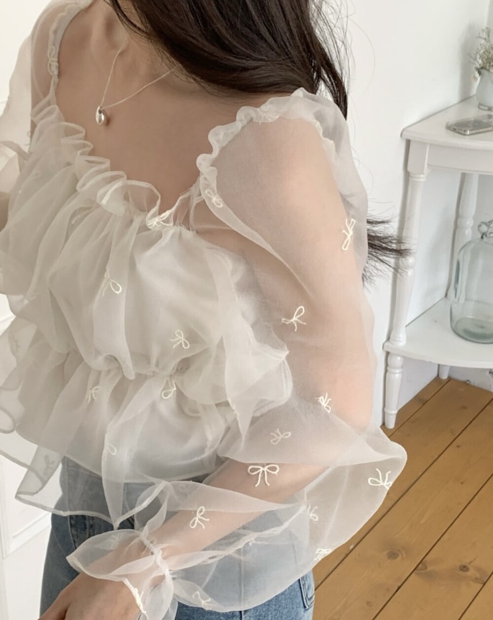 리본 자수 노방 오간자 시스루 스퀘어넥 숏 플레어 블라우스 (데이트룩 파티룩 특별한날)