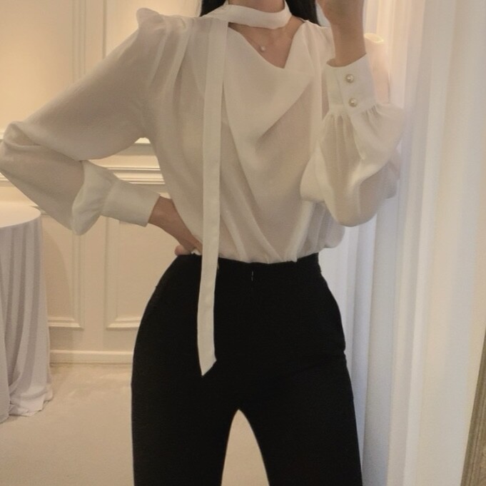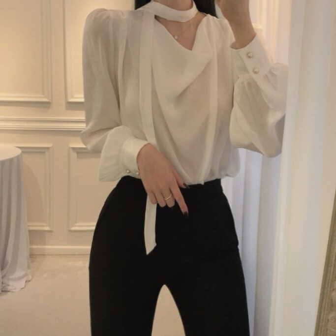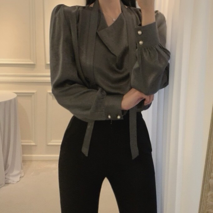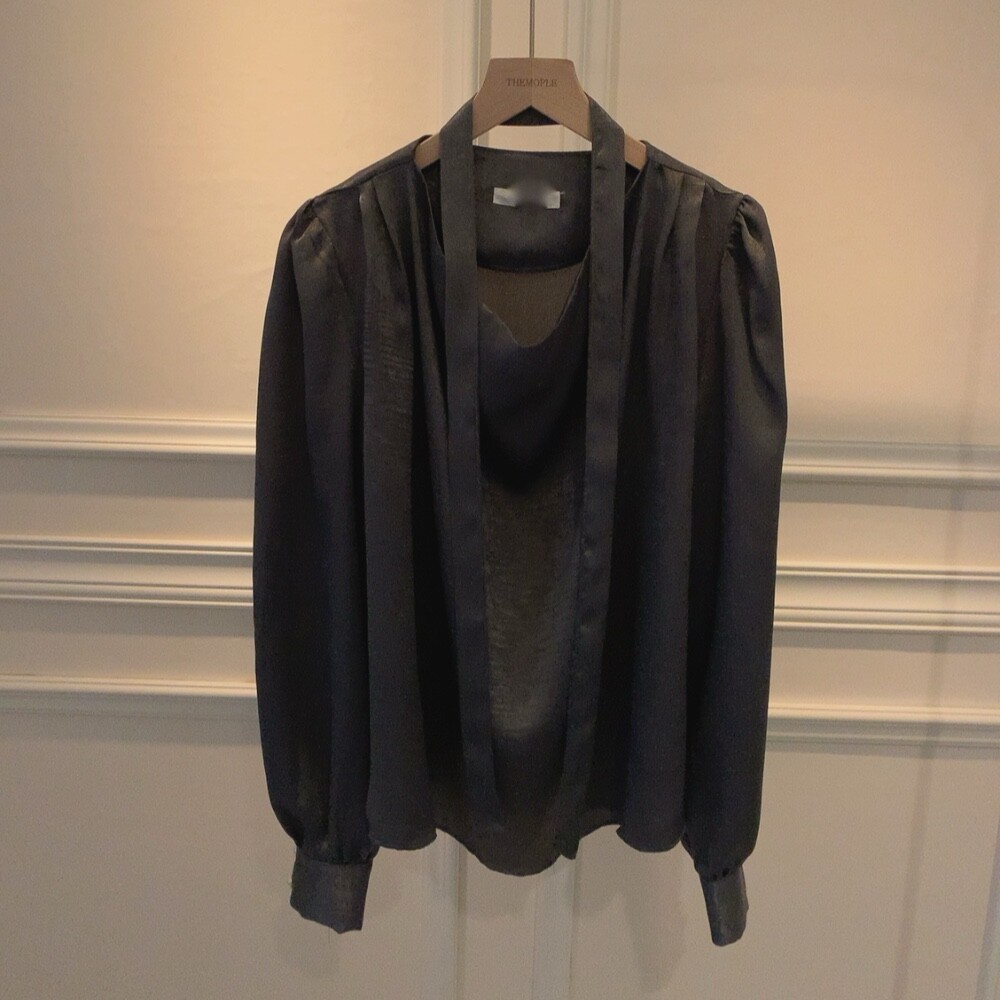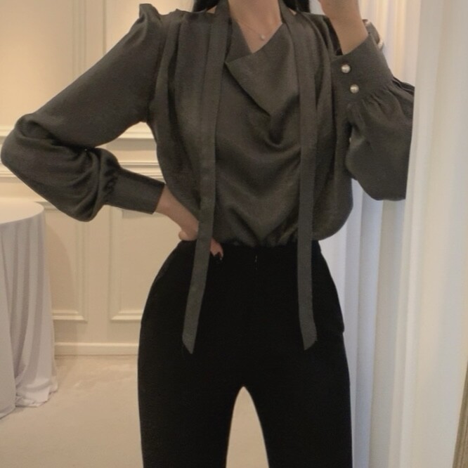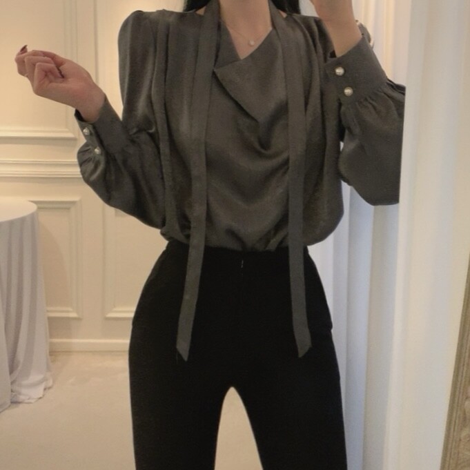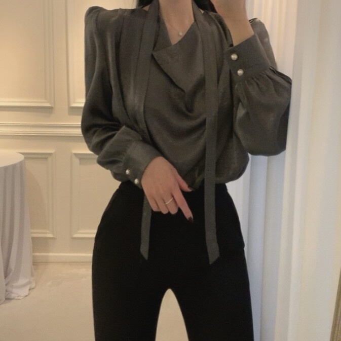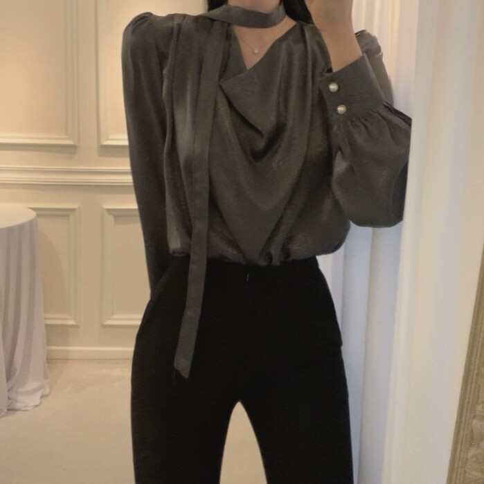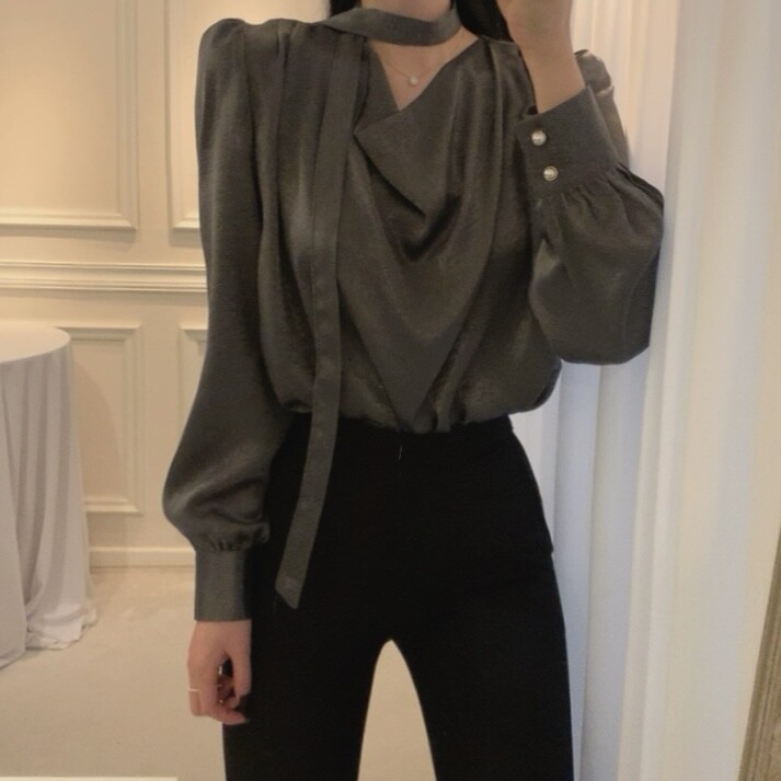 터들넥 샤틴 드레이프 셔링 주름 타이 스카프 세트 블라우스 (하객룩 럭셔리룩 모임룩)