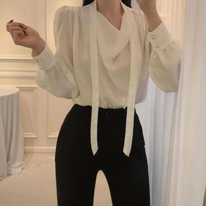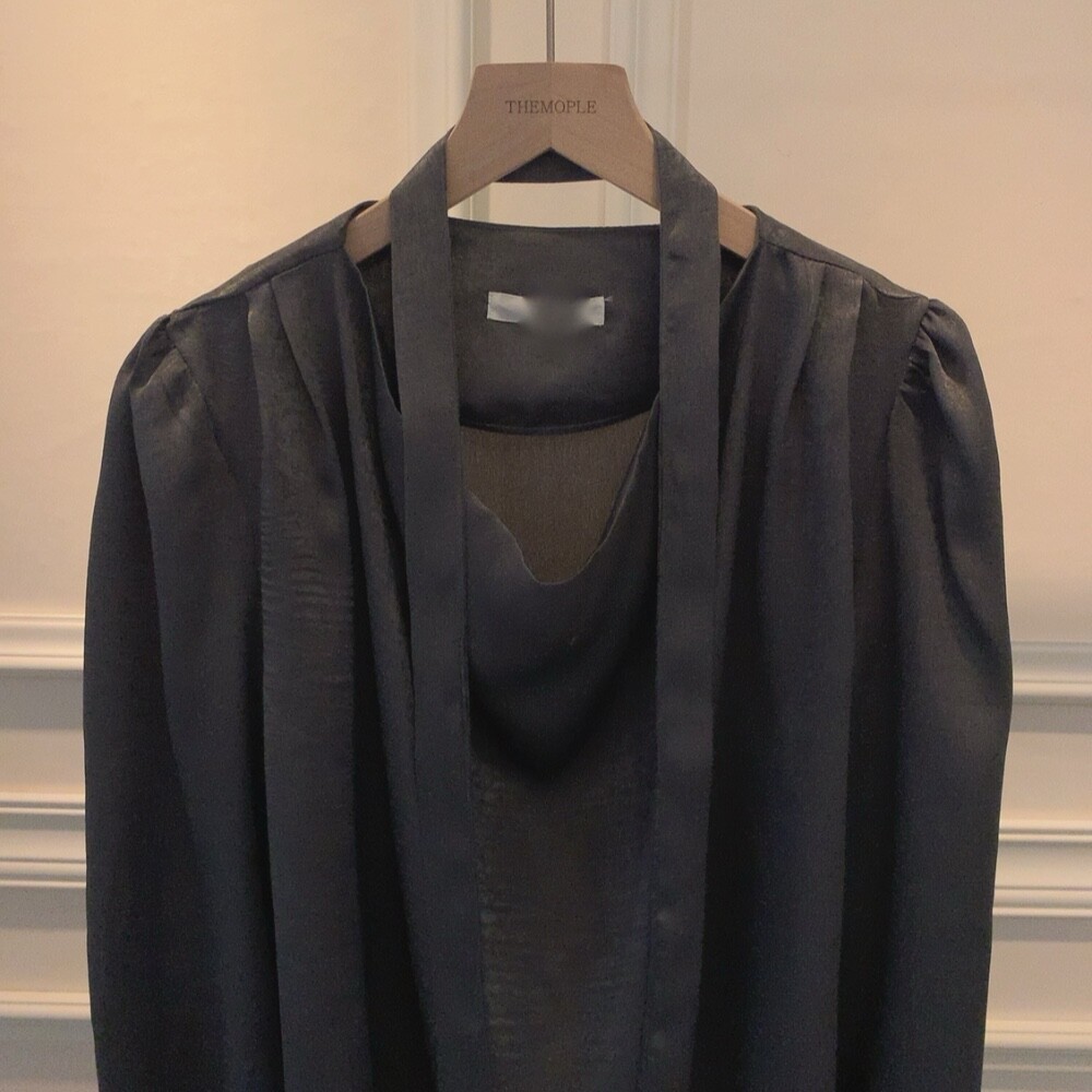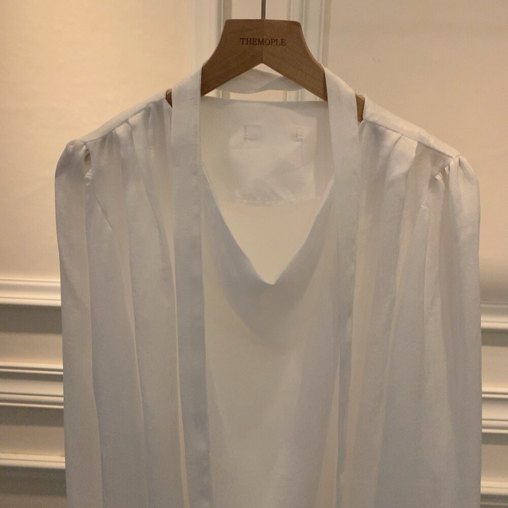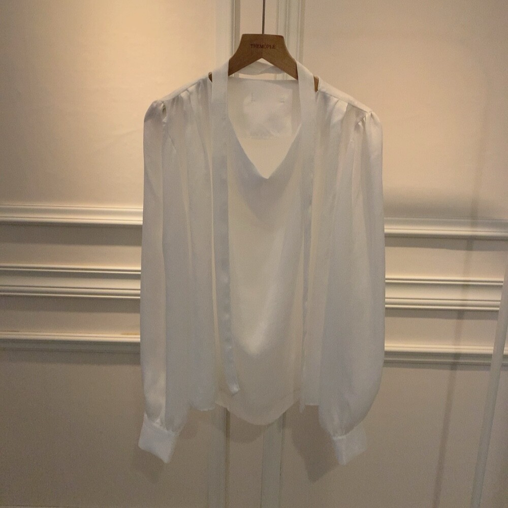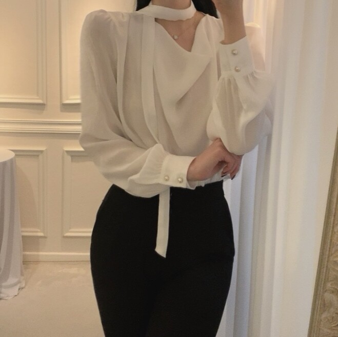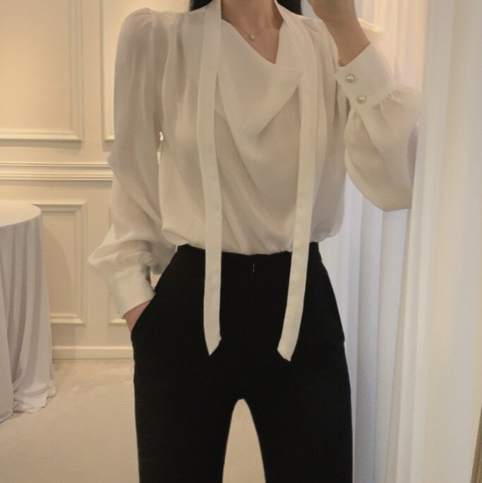 터들넥 샤틴 드레이프 셔링 주름 타이 스카프 세트 블라우스 (하객룩 럭셔리룩 모임룩)