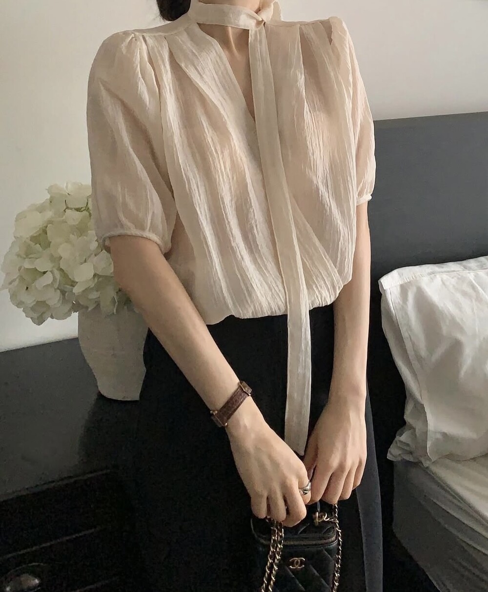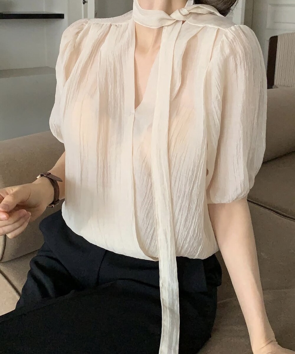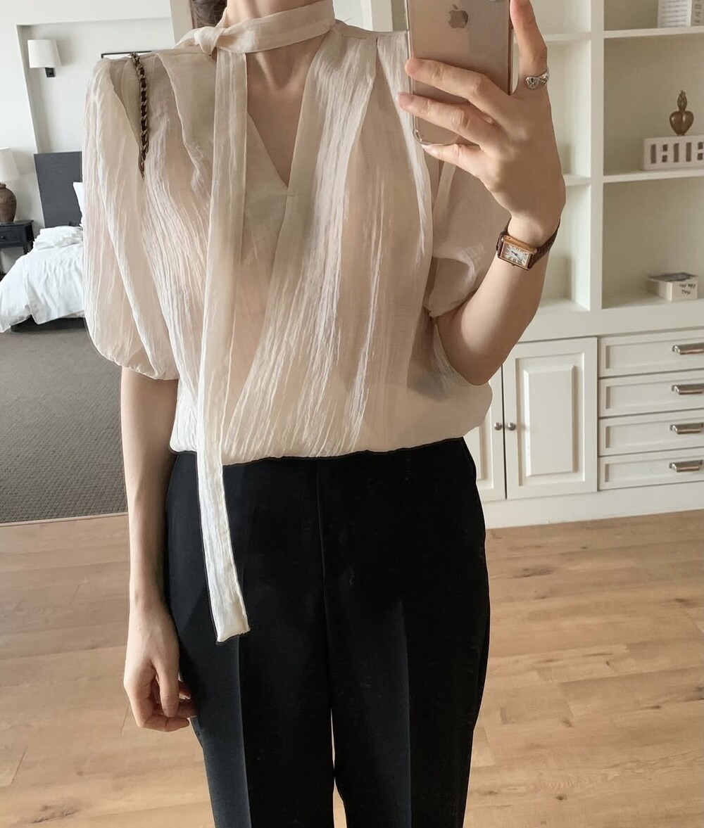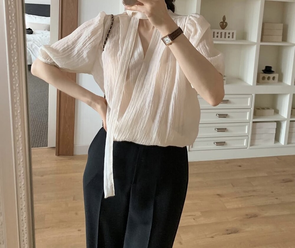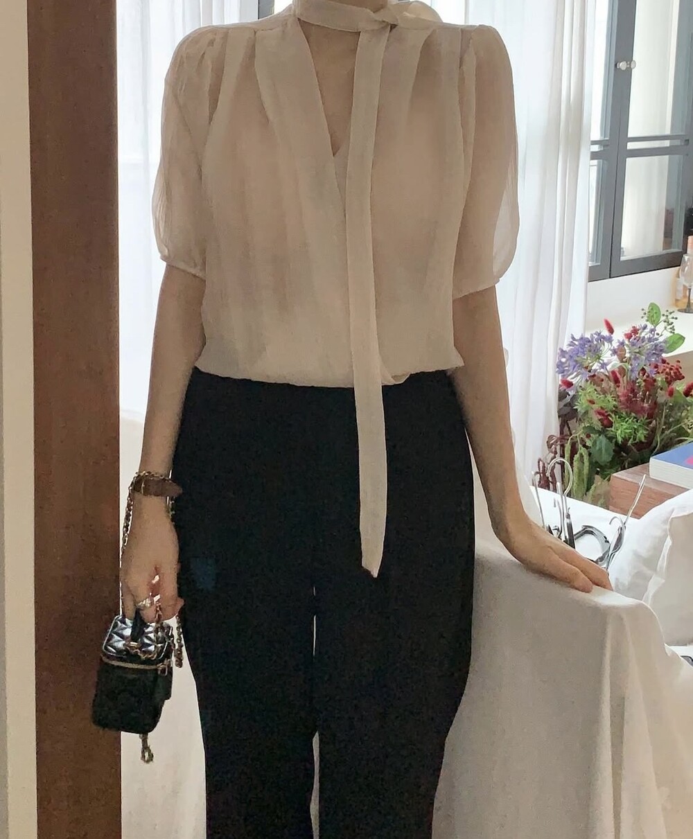 텐셀 반팔 퍼프 소매 스카프 타이 블라우스 (하객룩 결혼식 데이트룩)