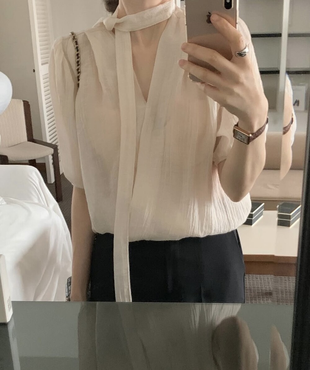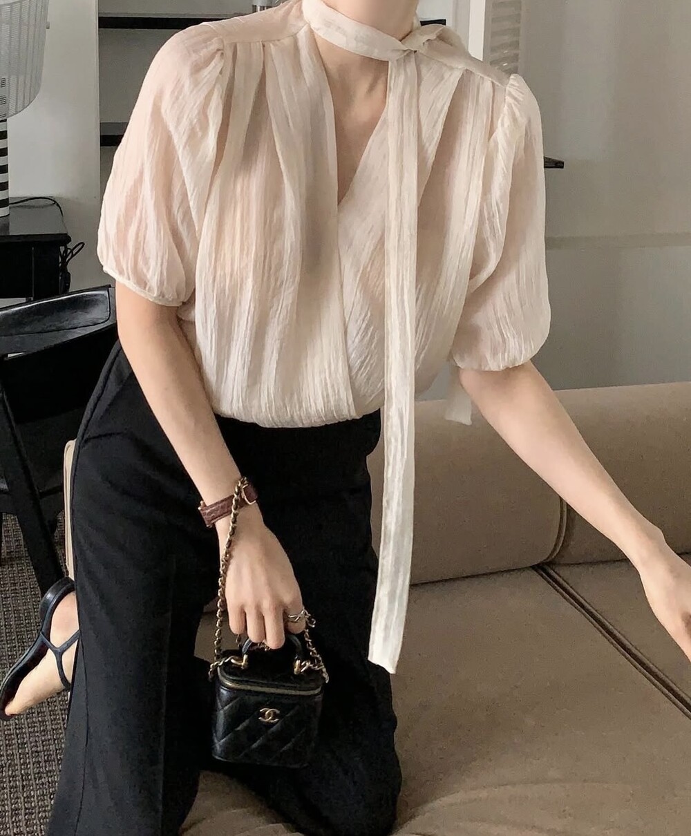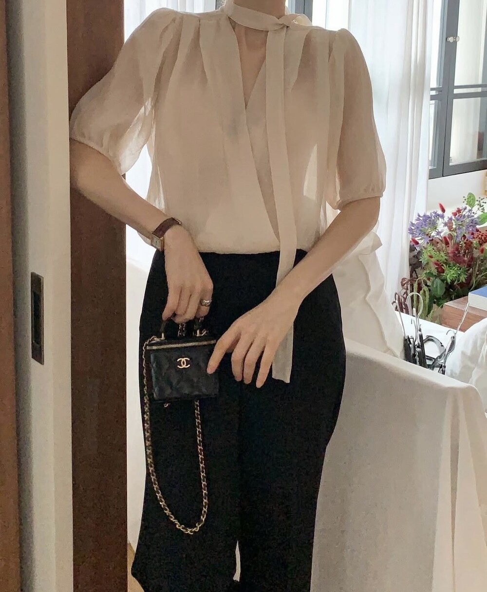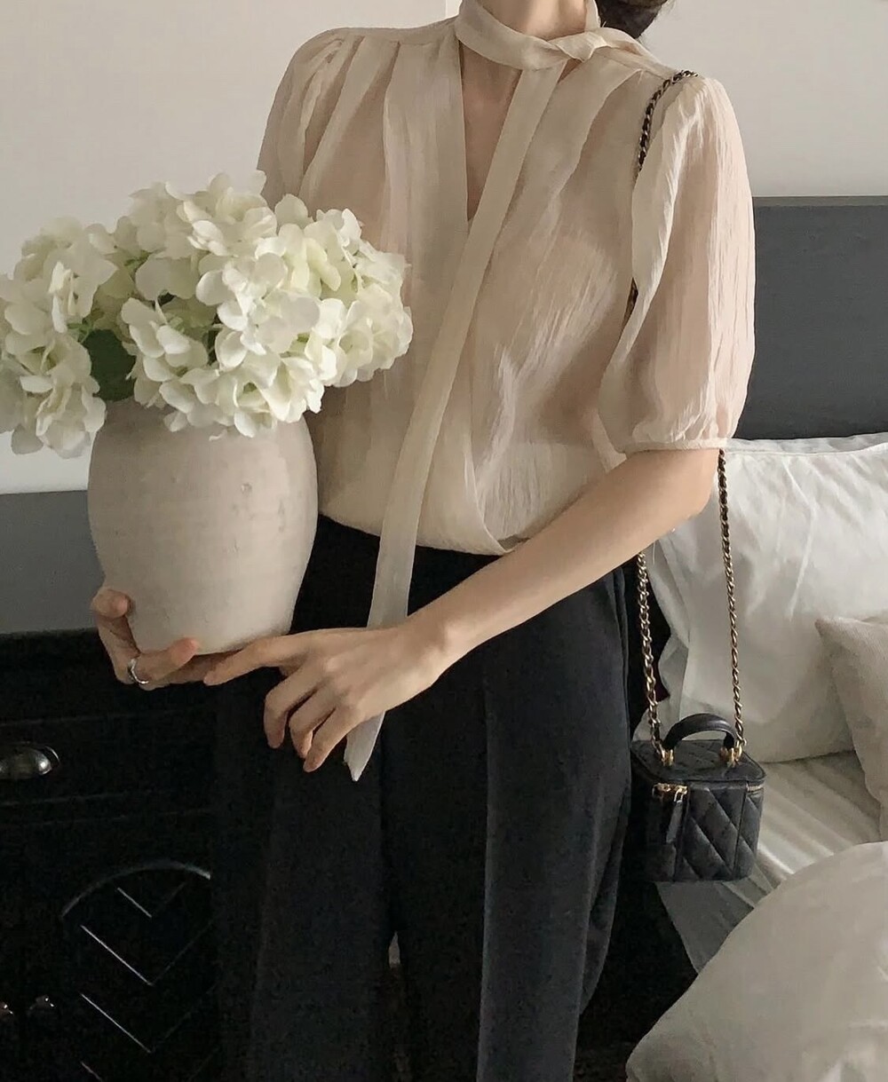 텐셀 반팔 퍼프 소매 스카프 타이 블라우스 (하객룩 결혼식 데이트룩)