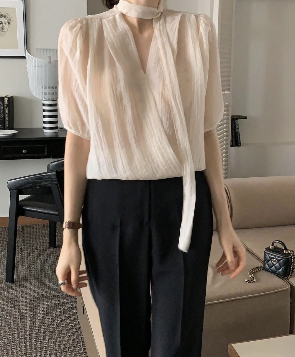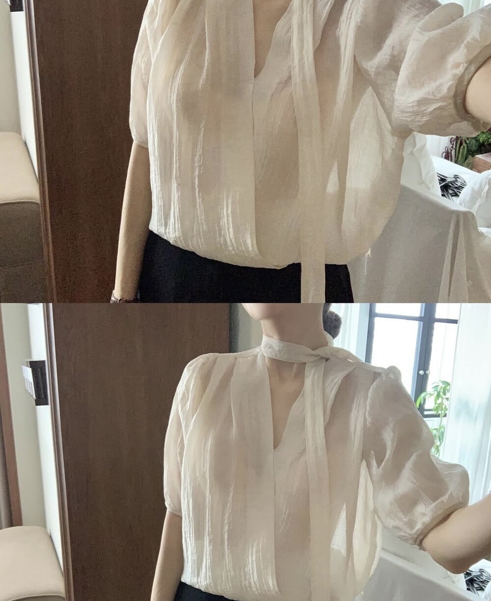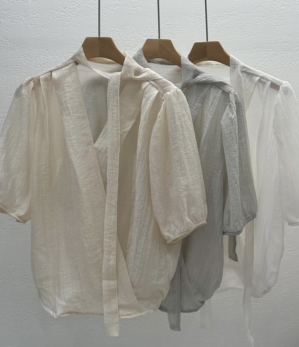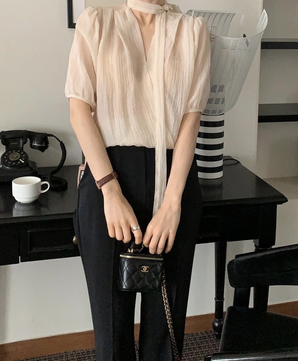 텐셀 반팔 퍼프 소매 스카프 타이 블라우스 (하객룩 결혼식 데이트룩)