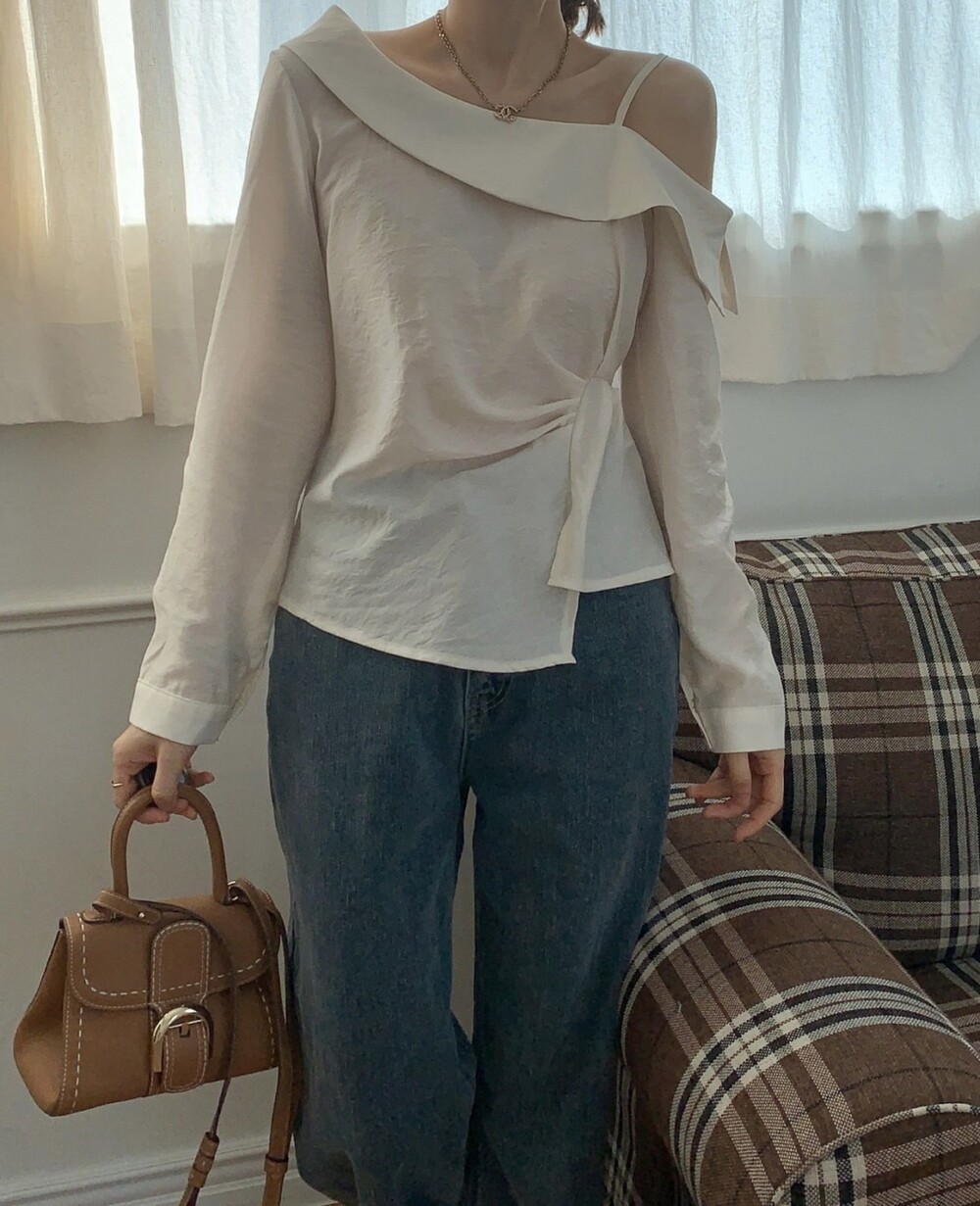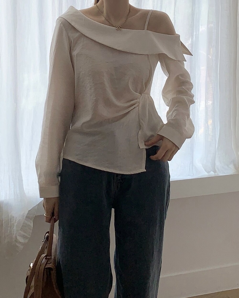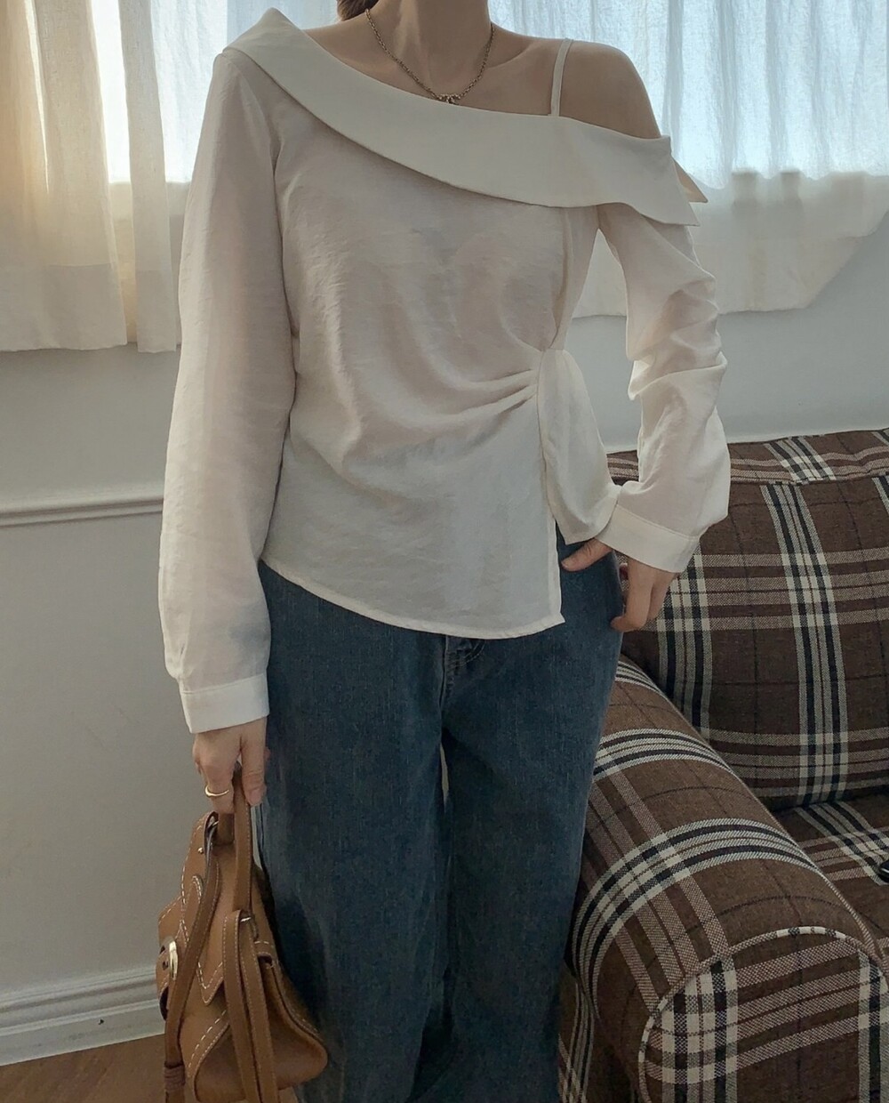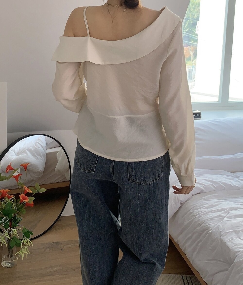 언발란스 어깨 끈 오프숄더 여리여리 셔링 주름 긴팔 블라우스 (데이트룩 파티룩 여행코디)