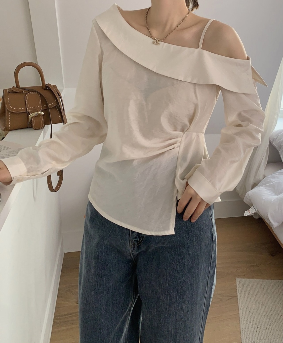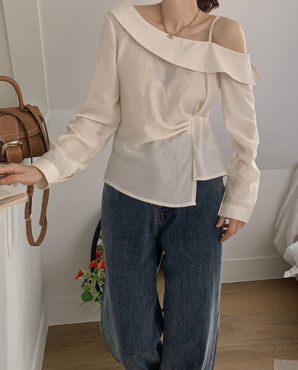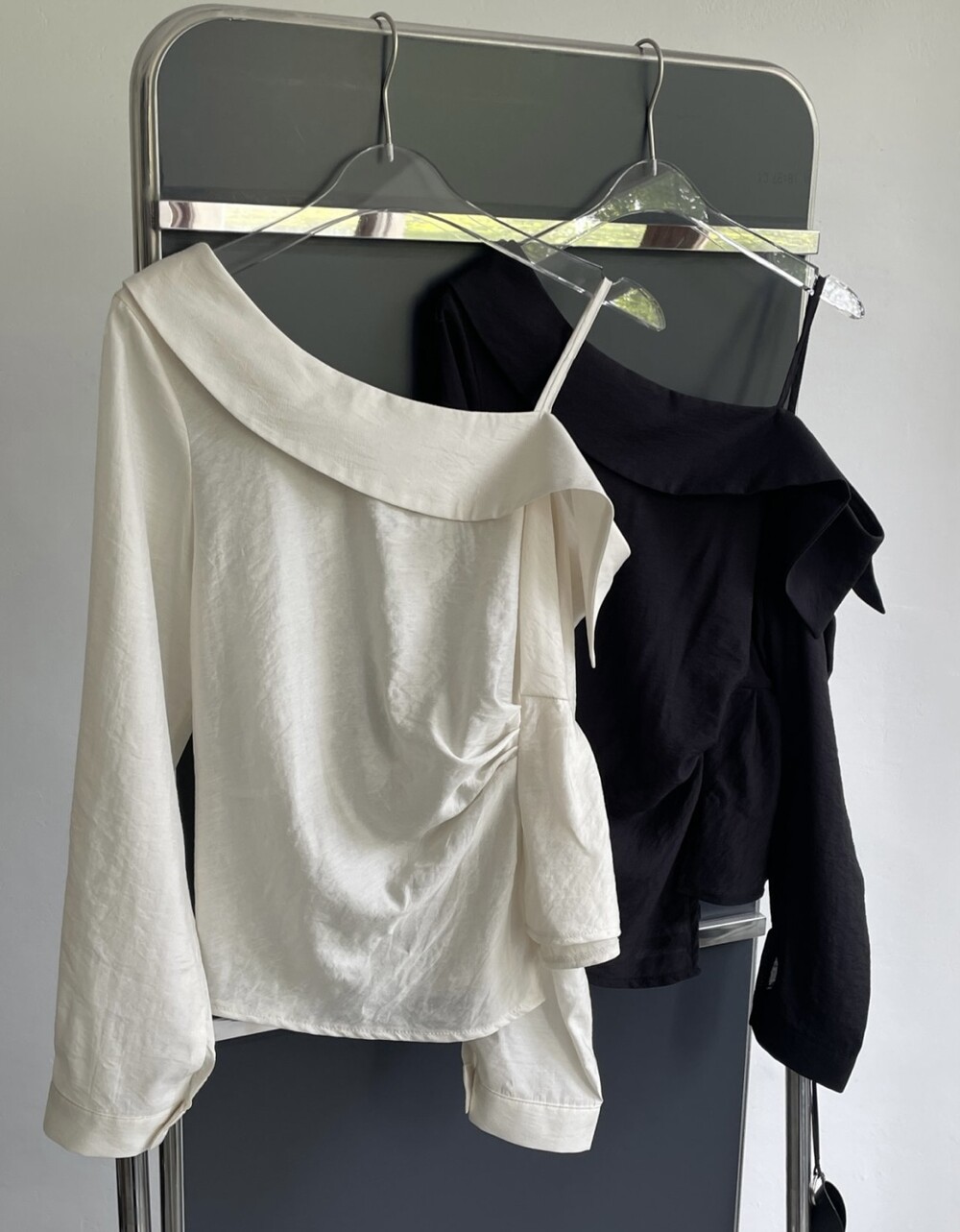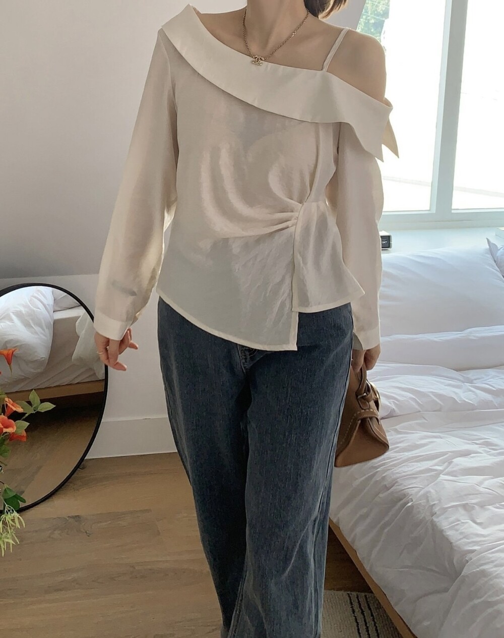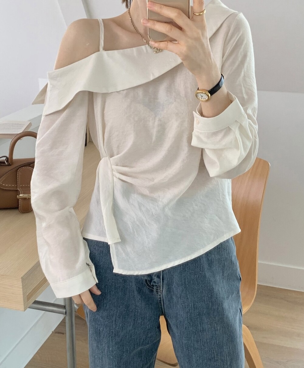언발란스 어깨 끈 오프숄더 여리여리 셔링 주름 긴팔 블라우스 (데이트룩 파티룩 여행코디)