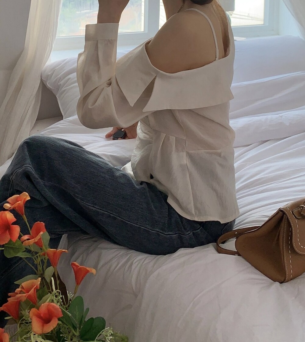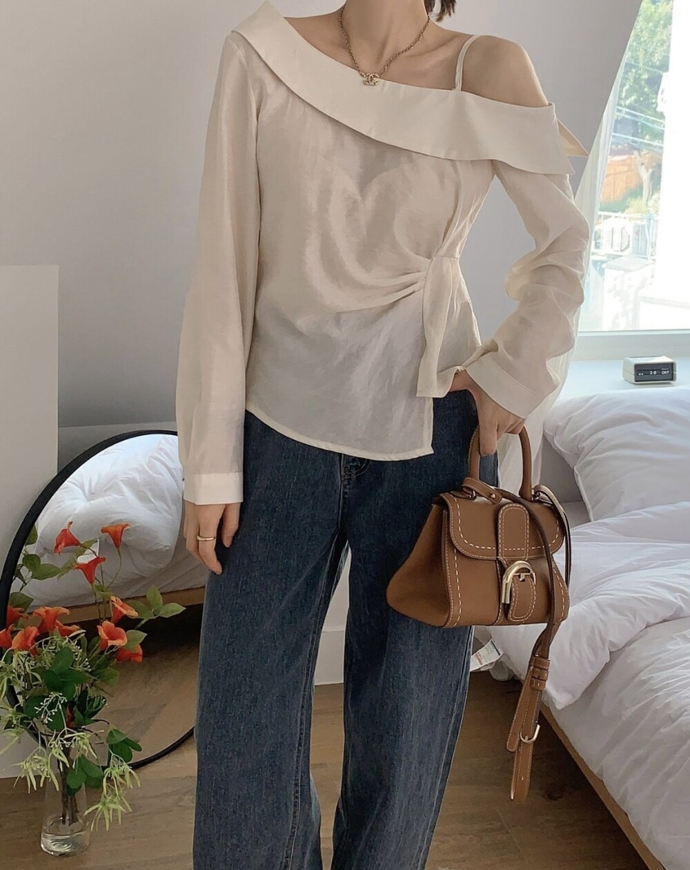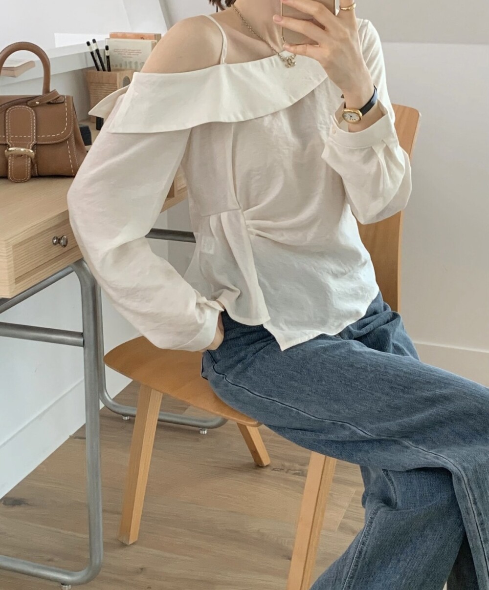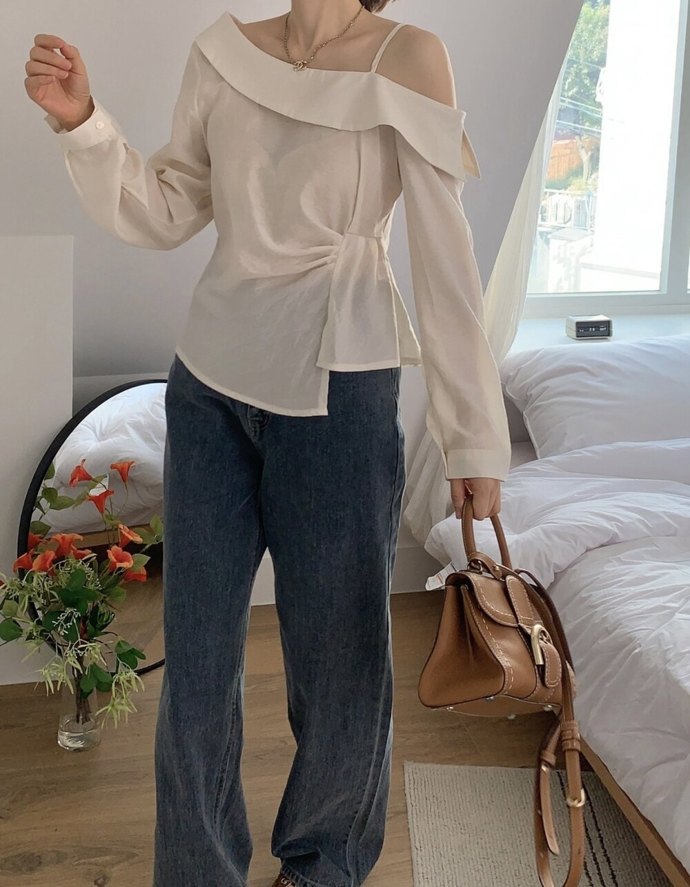 언발란스 어깨 끈 오프숄더 여리여리 셔링 주름 긴팔 블라우스 (데이트룩 파티룩 여행코디)
