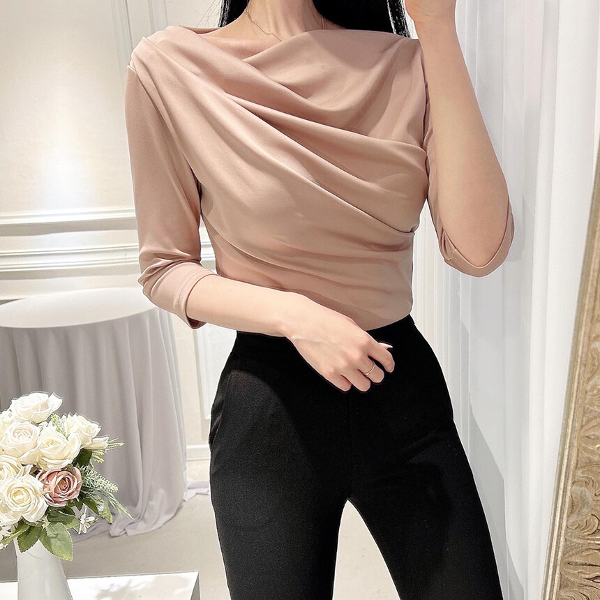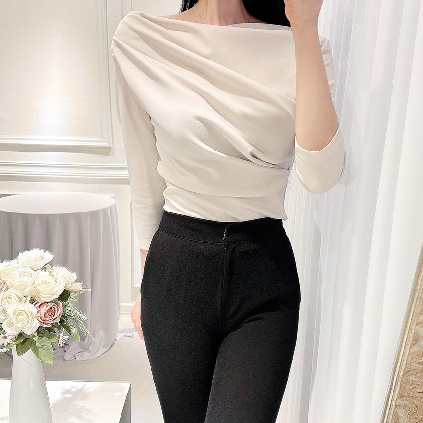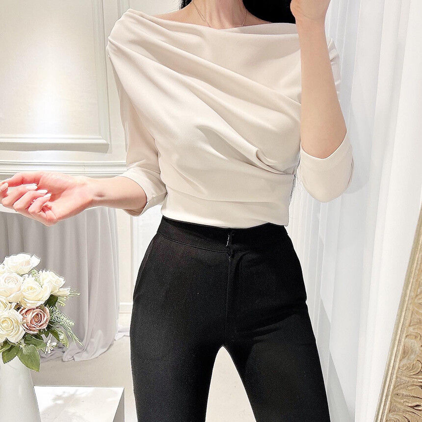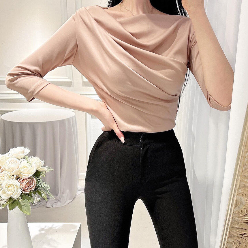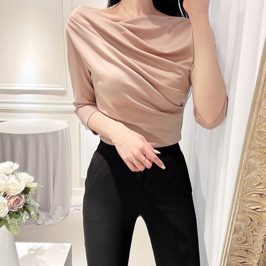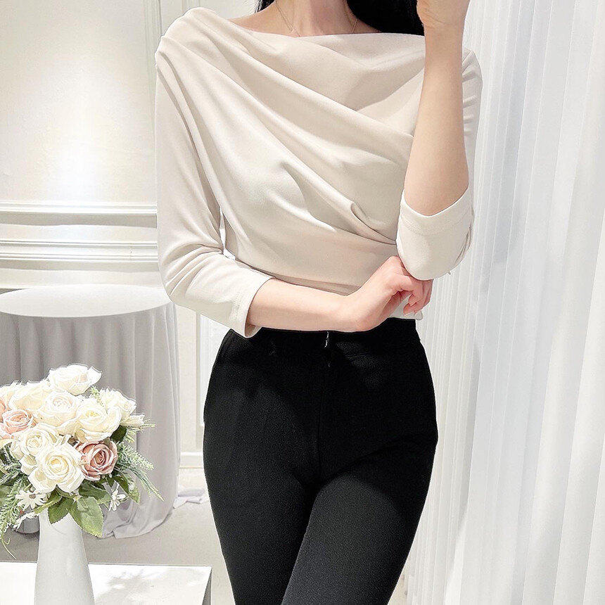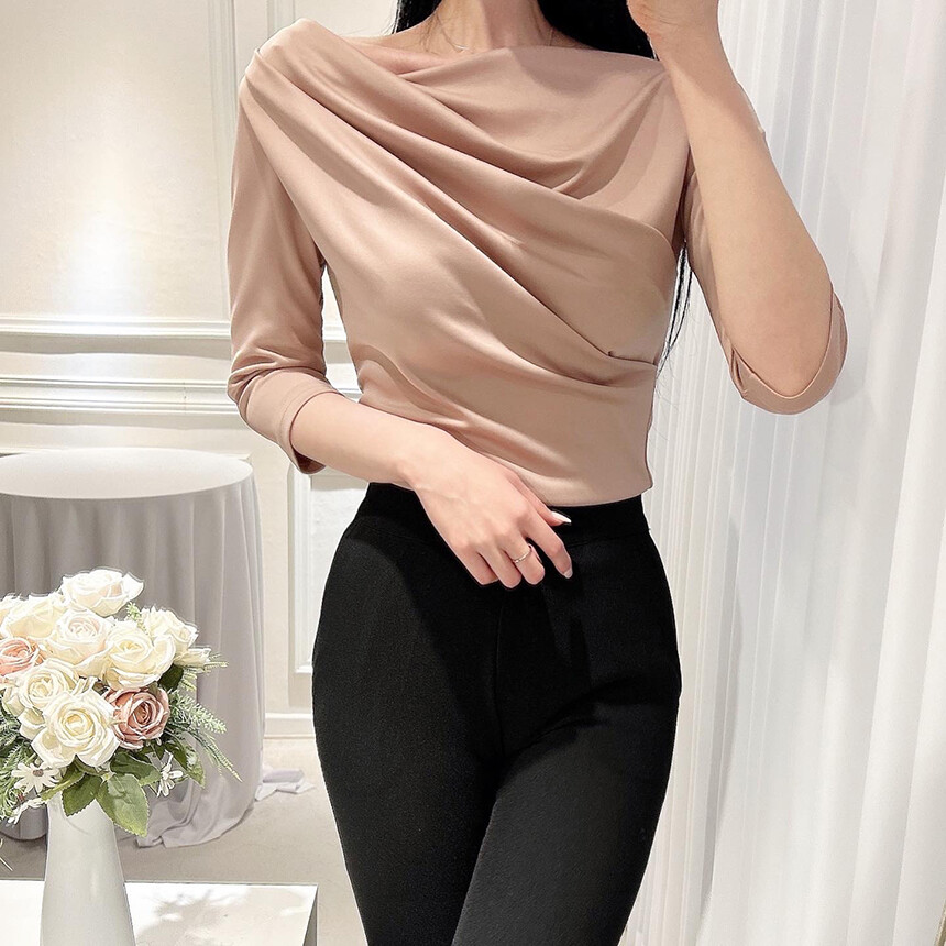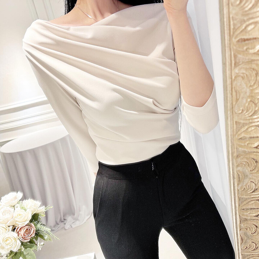 7부 소매 셔링 실키 오프숄더 입술넥 드레이프 주름 스판 져지 블라우스