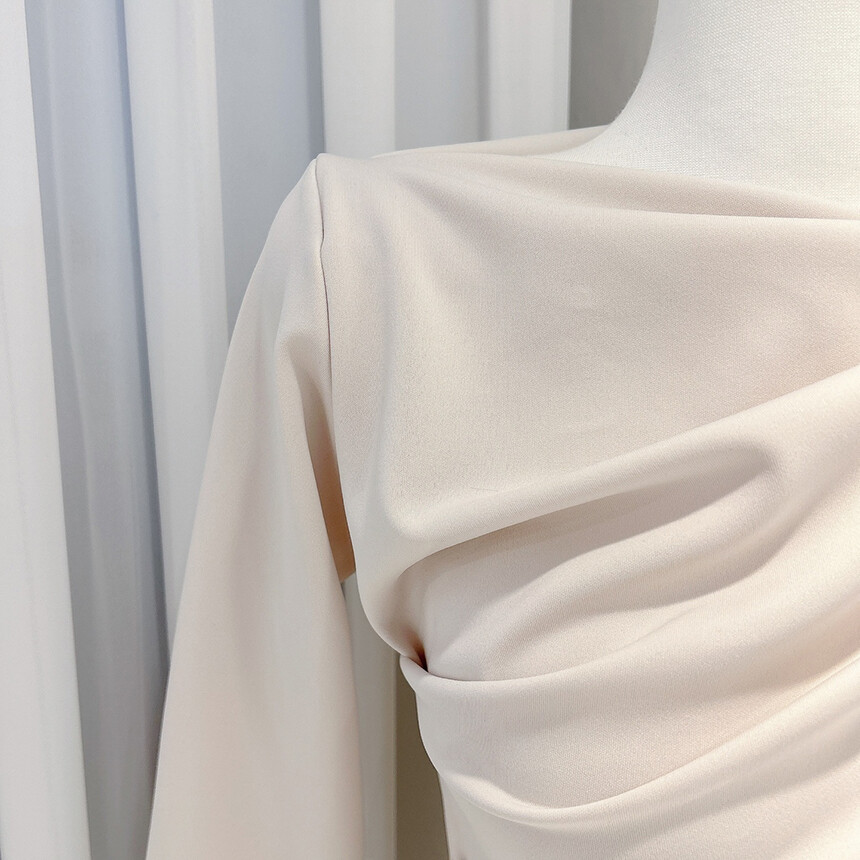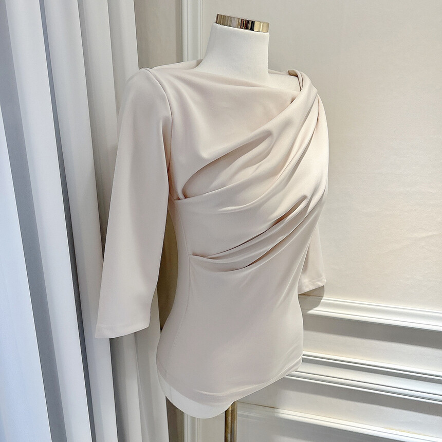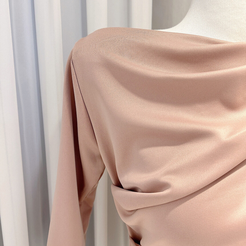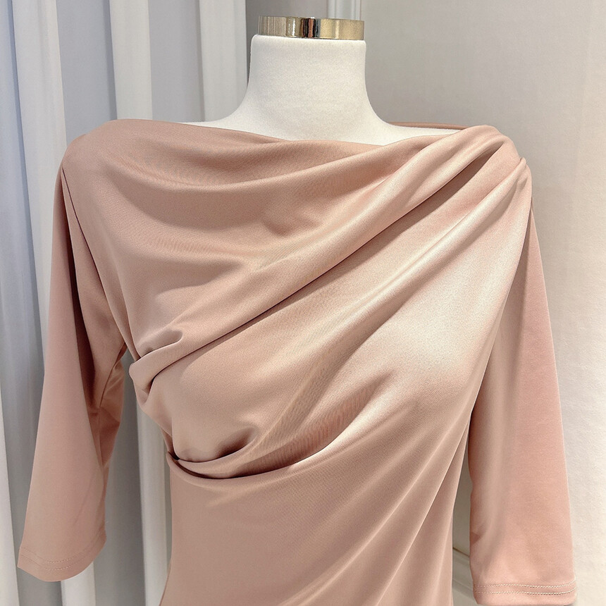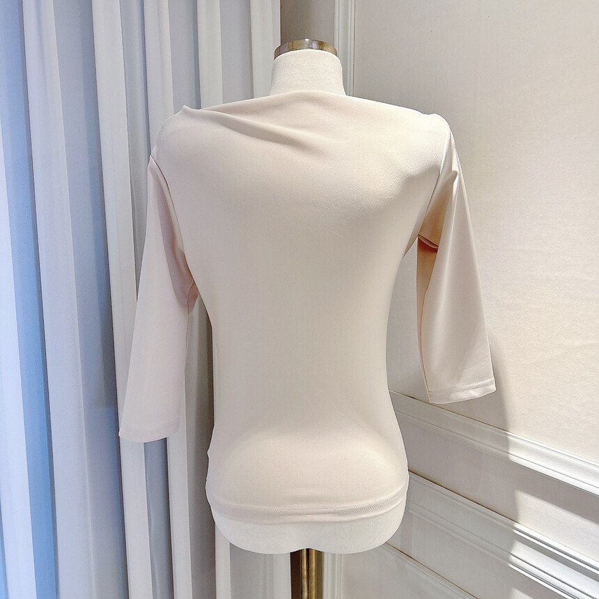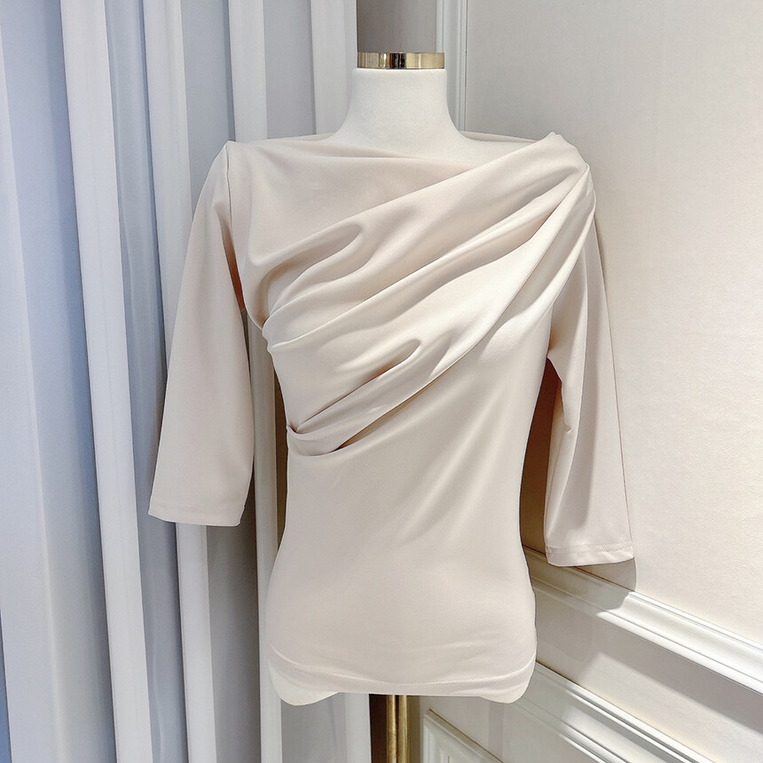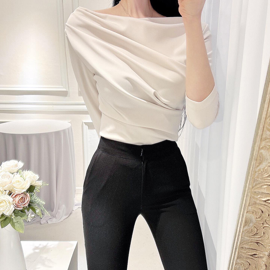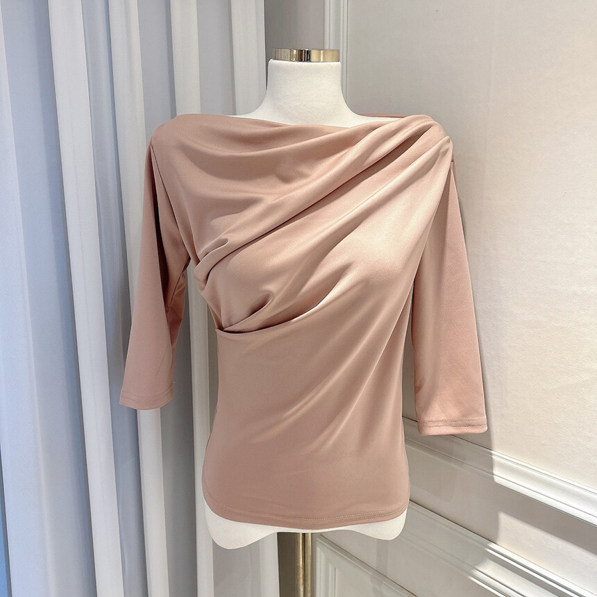 7부 소매 셔링 실키 오프숄더 입술넥 드레이프 주름 스판 져지 블라우스