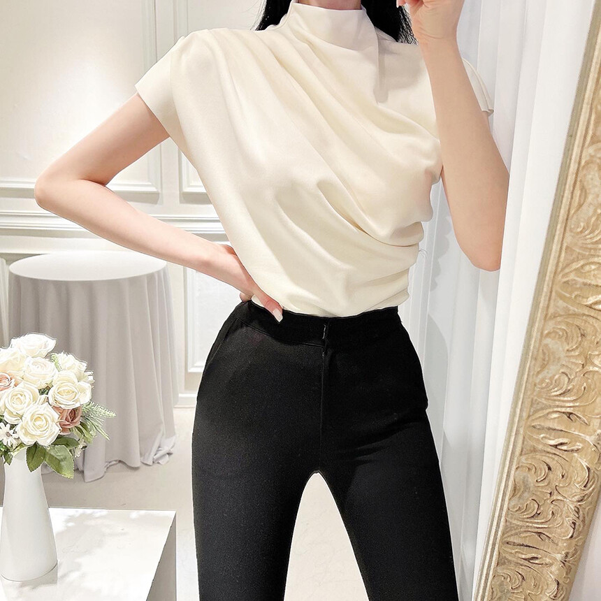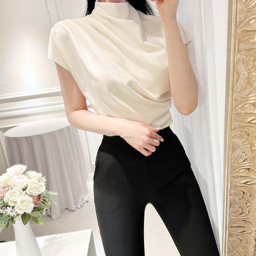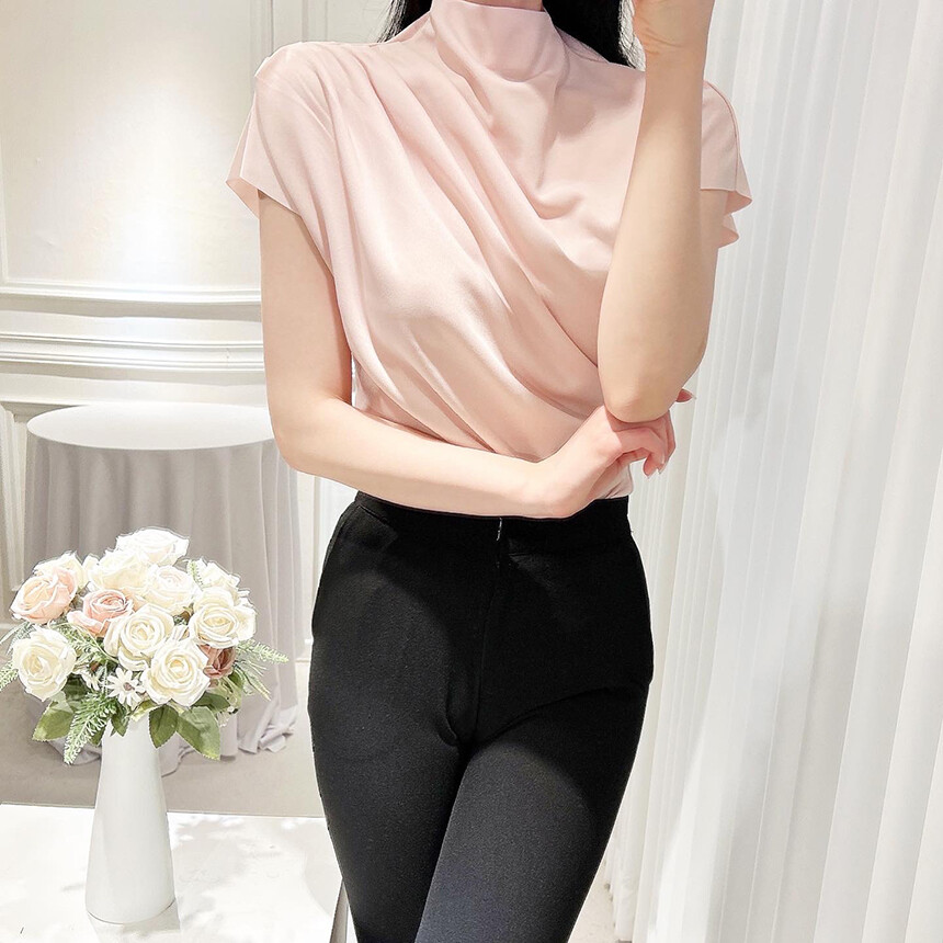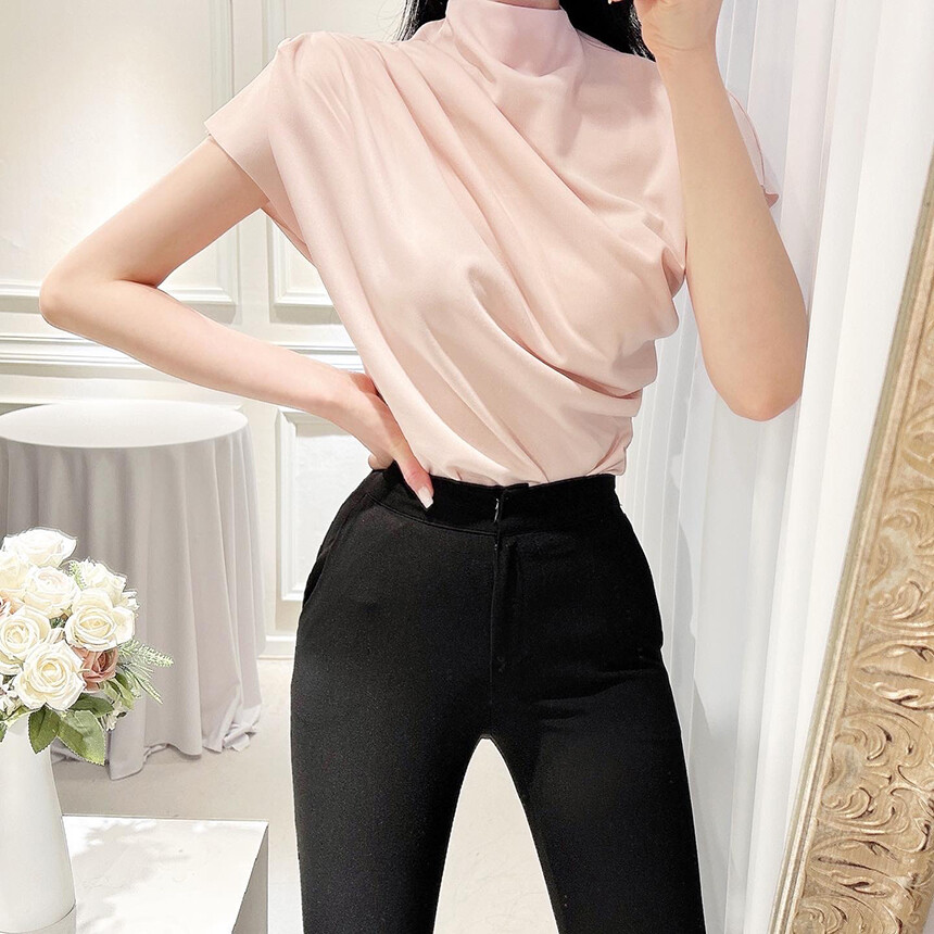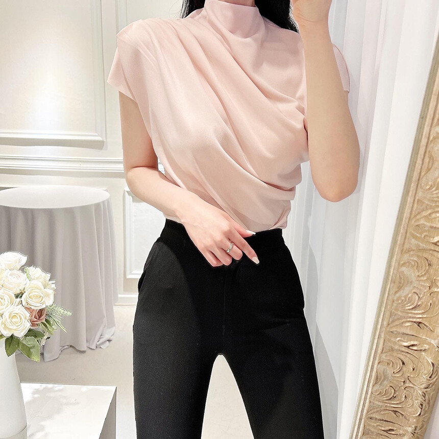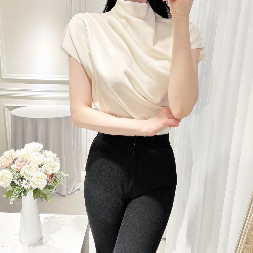 캡소매 반목 실키 새틴 져지 드레이프 주름 여리여리 슬림 블라우스 티셔츠