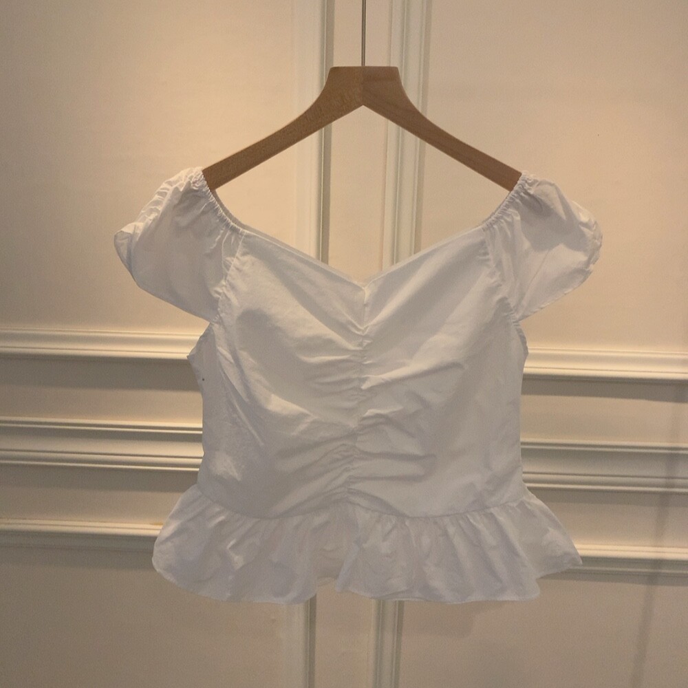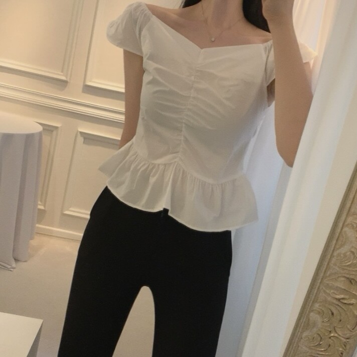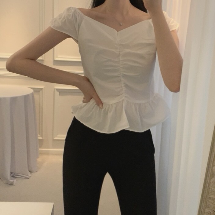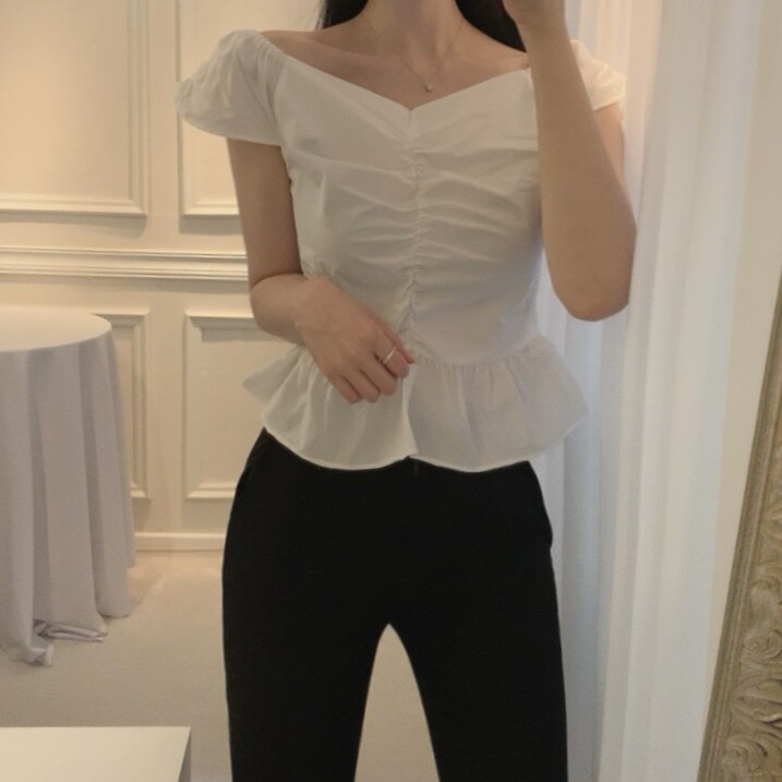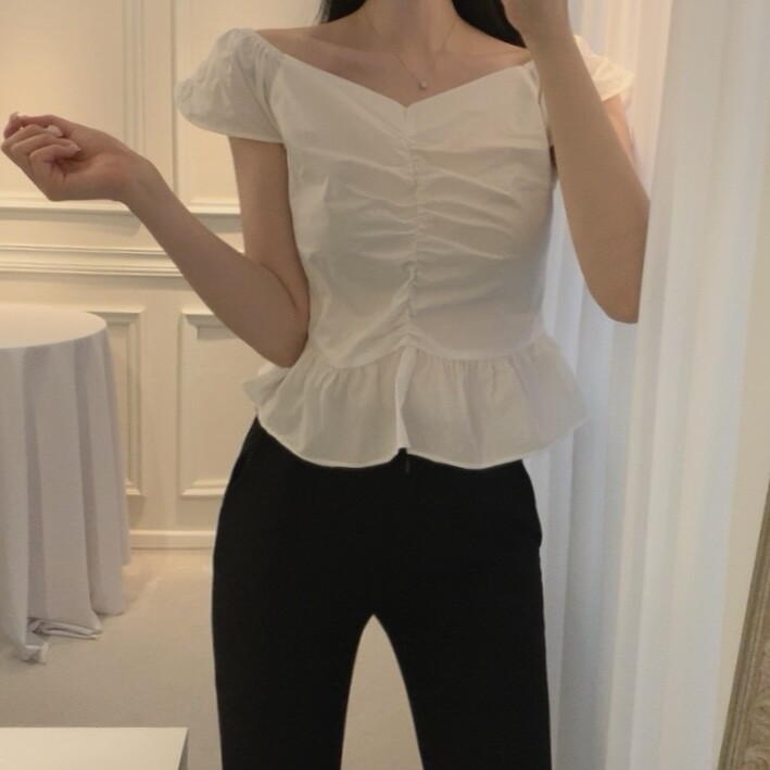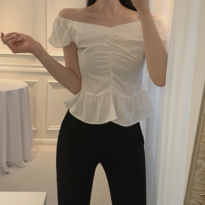 프릴 날개 캡소매 오프숄더 셔링 숏 플레어 블라우스