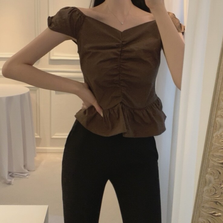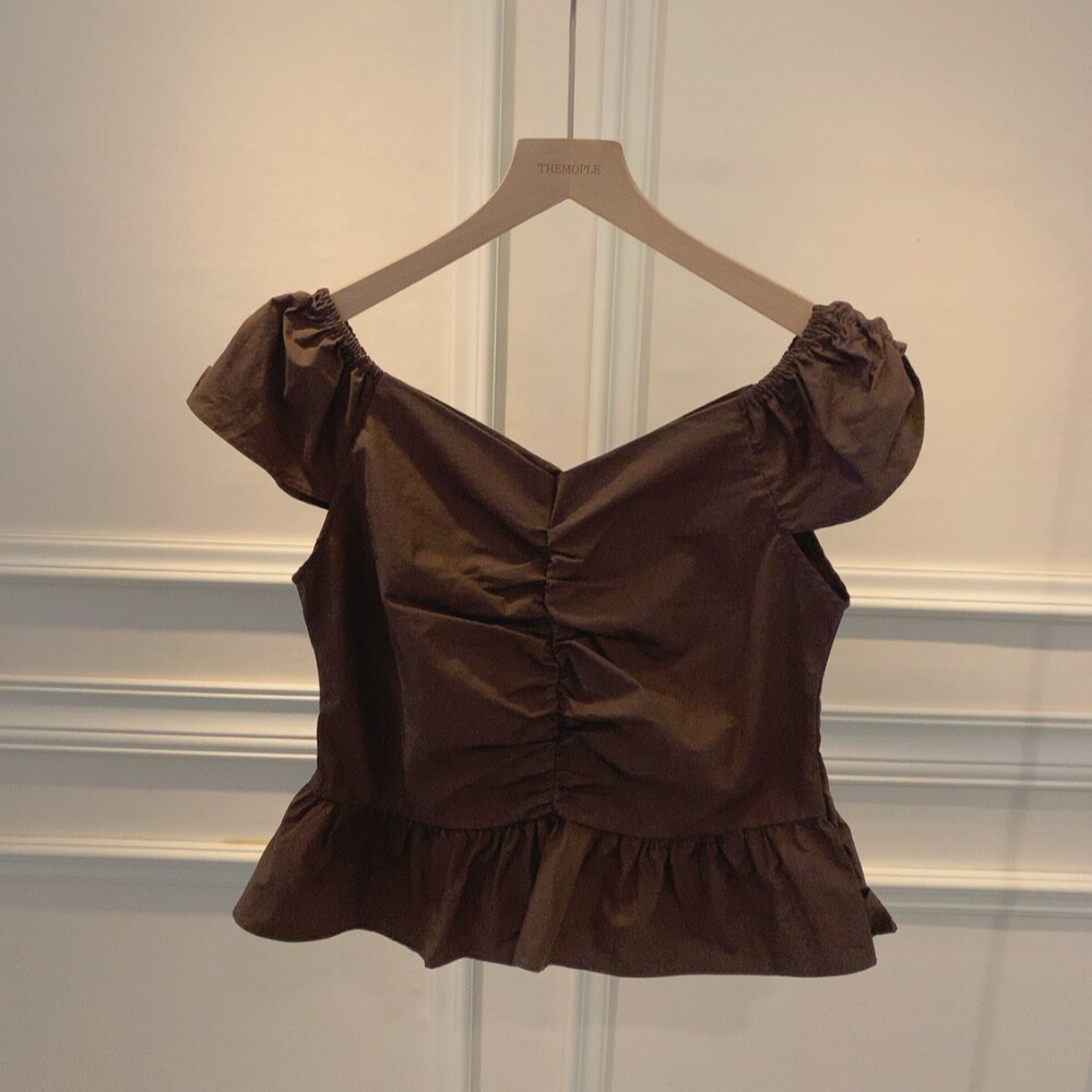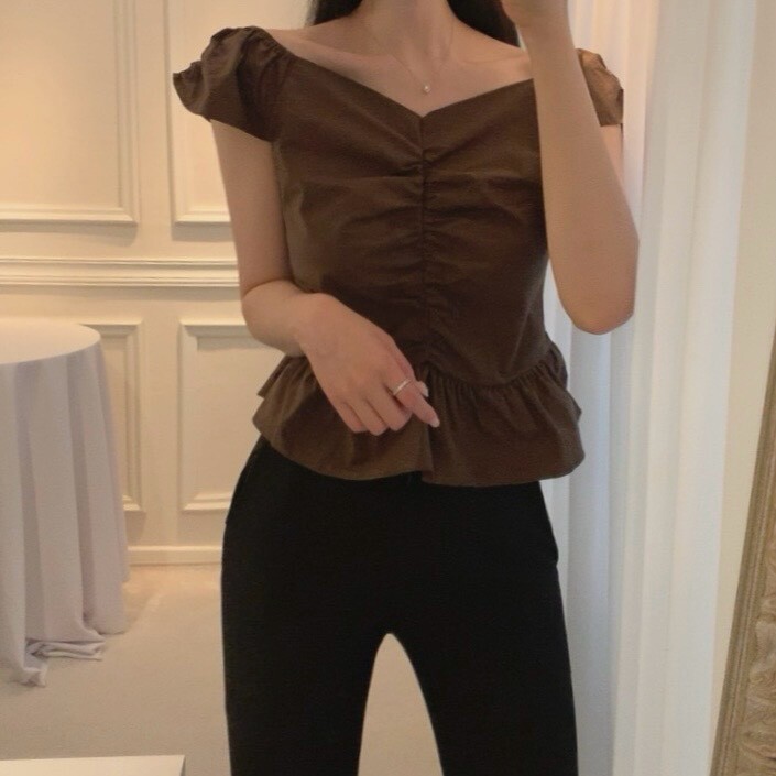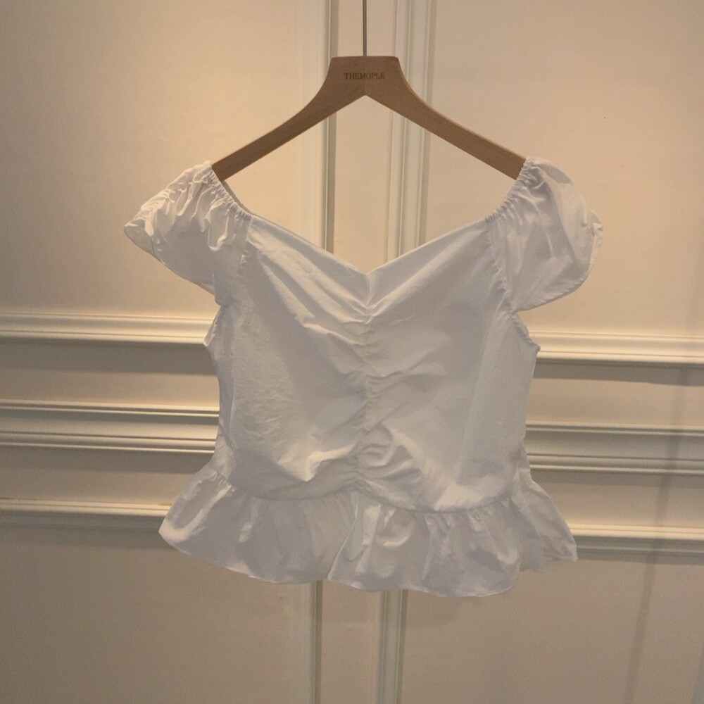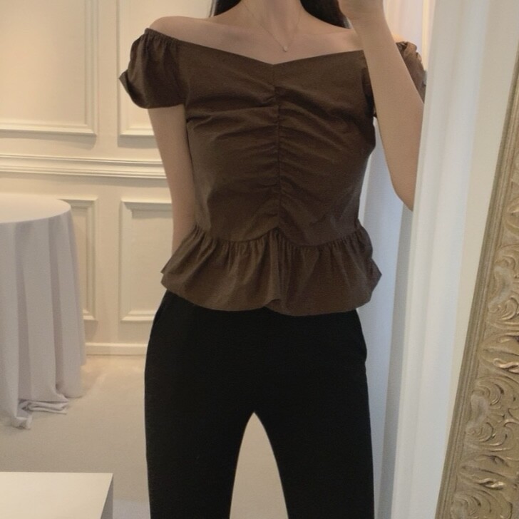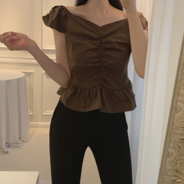 프릴 날개 캡소매 오프숄더 셔링 숏 플레어 블라우스
