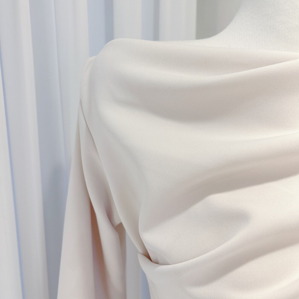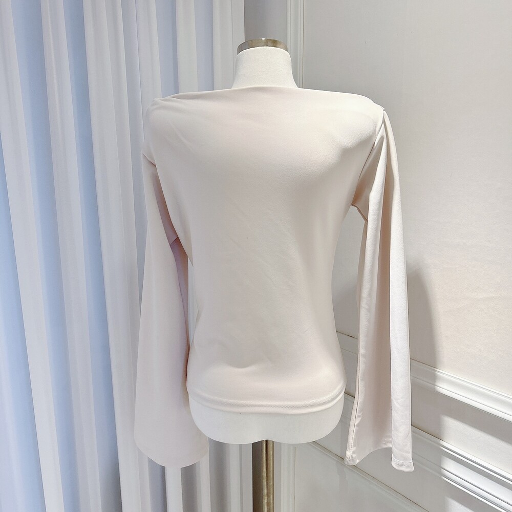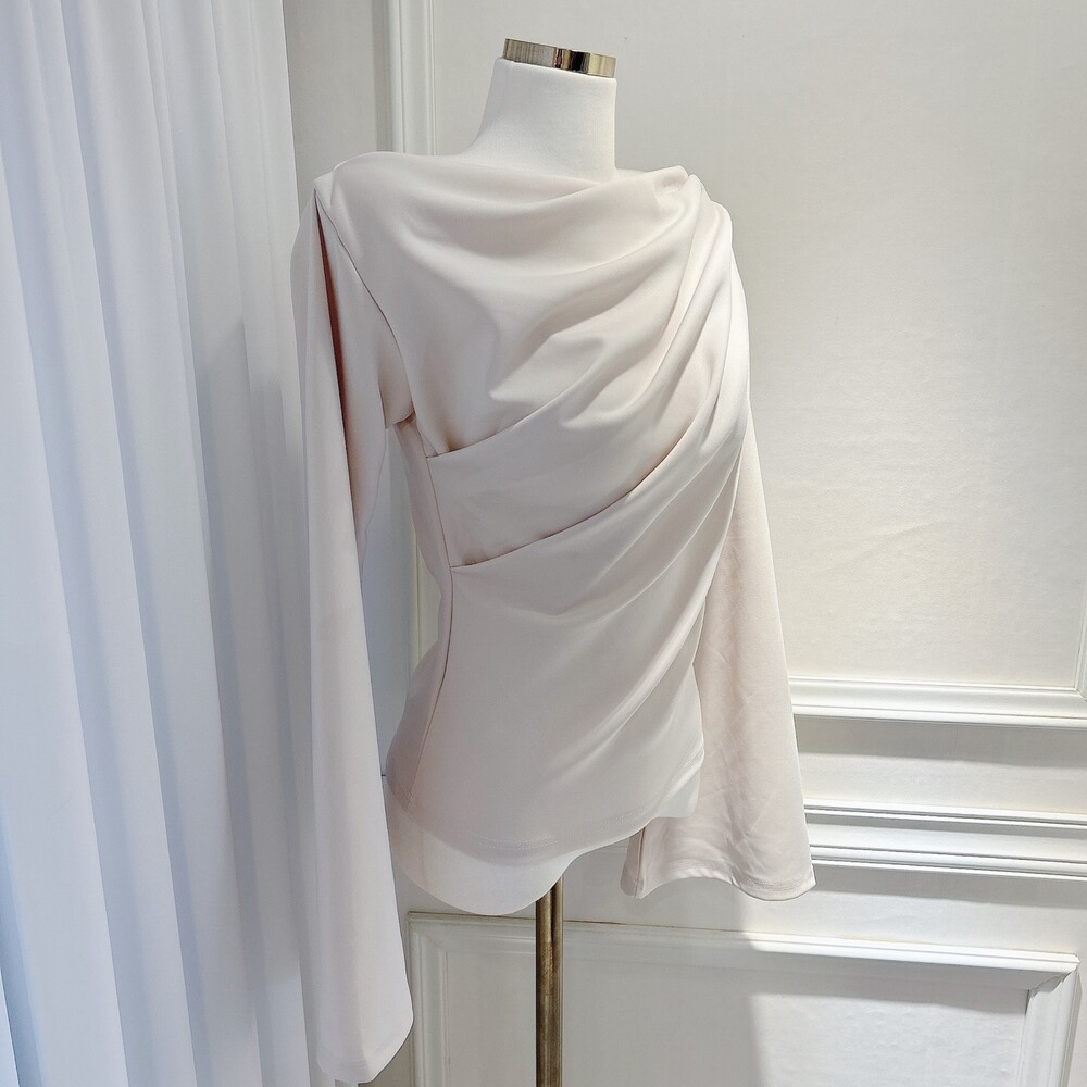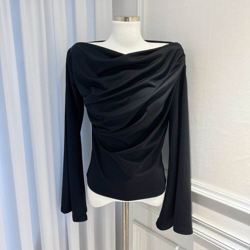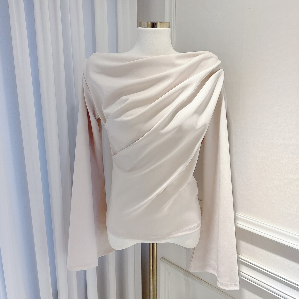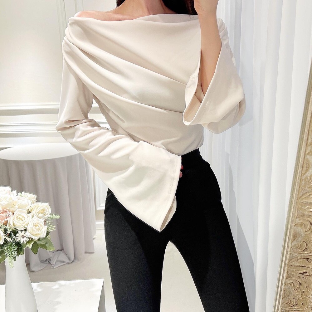 (고퀄리티) 고급 버전 나팔 소매 실키 새틴 드레이프 주름 셔링 오프숄더 보트넥 블라우스