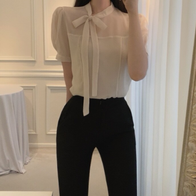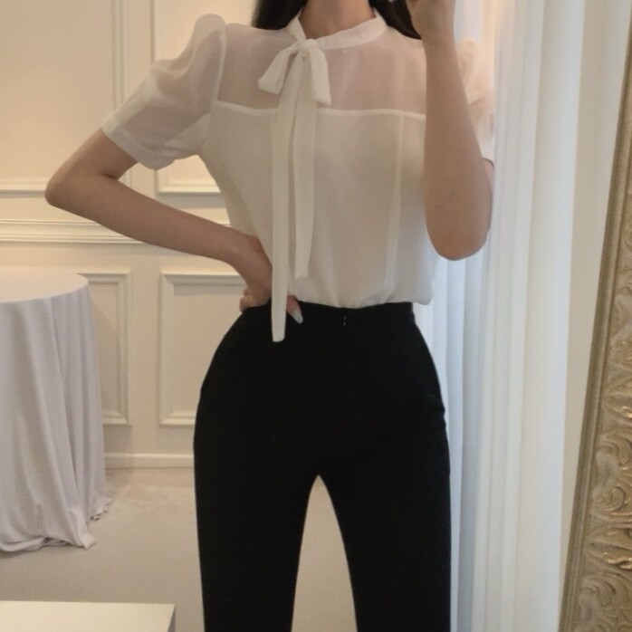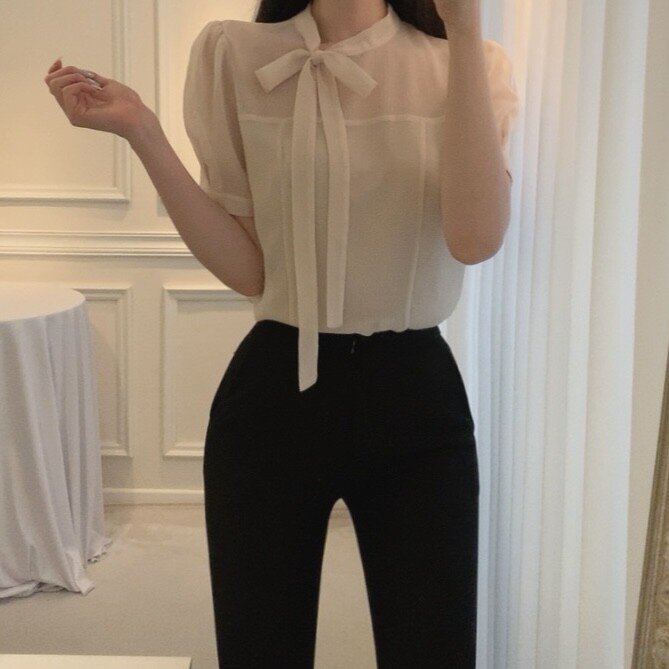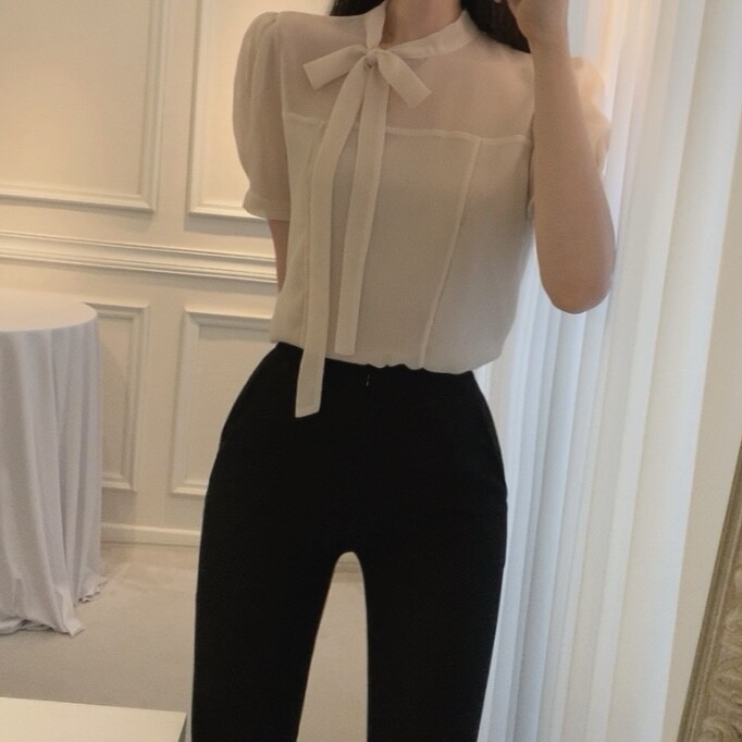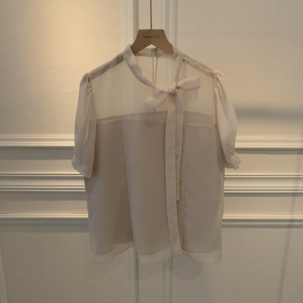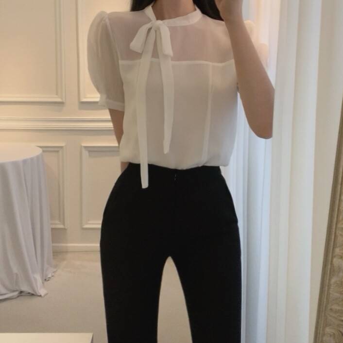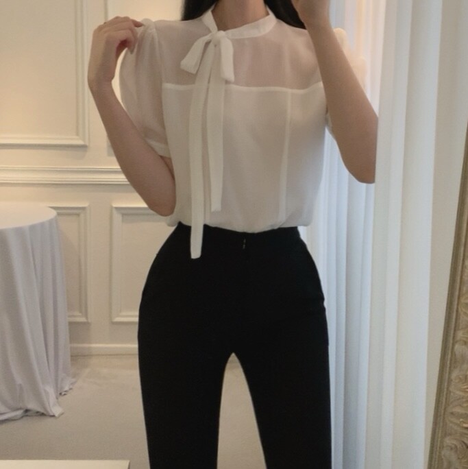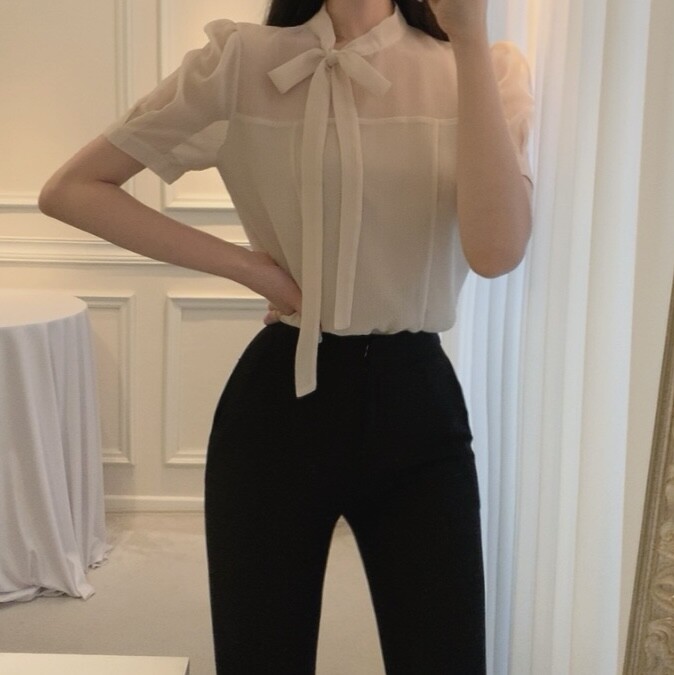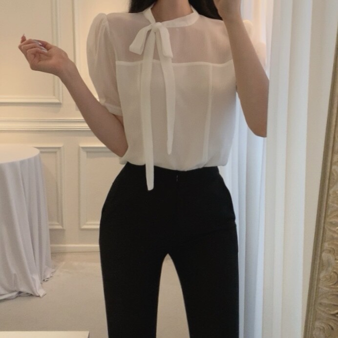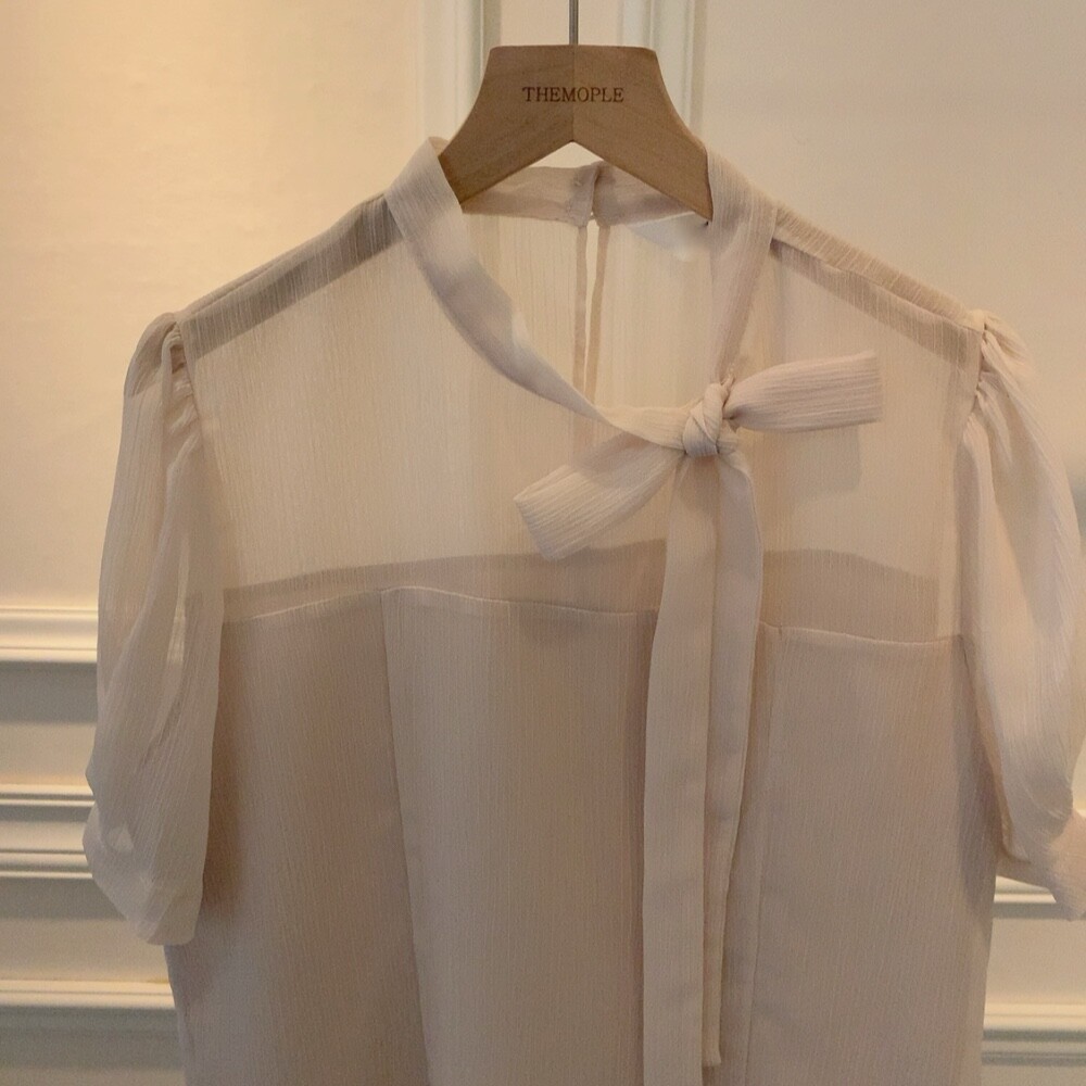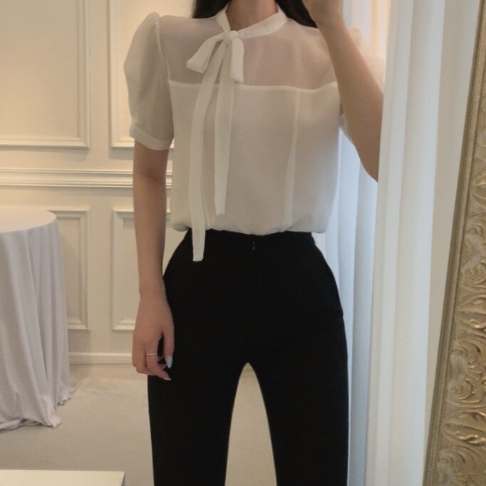요루 시스루 리본 타이 여리 반팔 블라우스 (하객룩 결혼식 오피스룩)