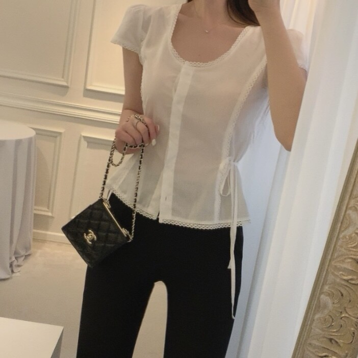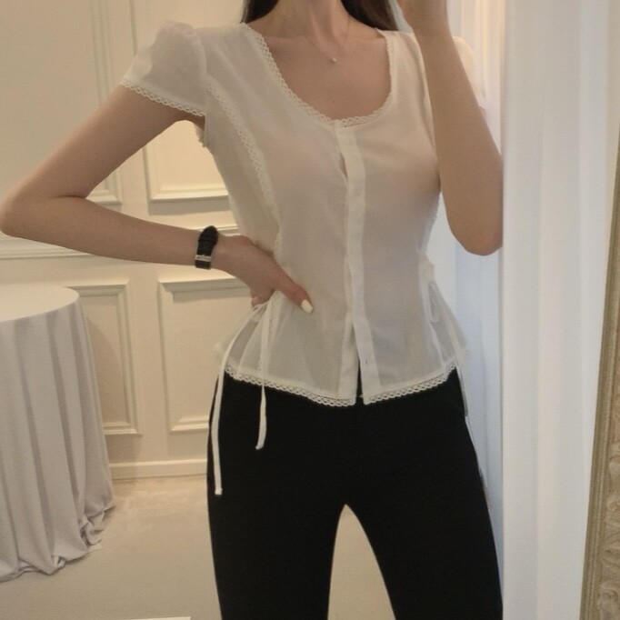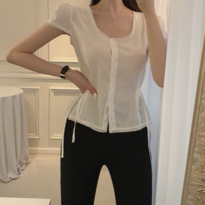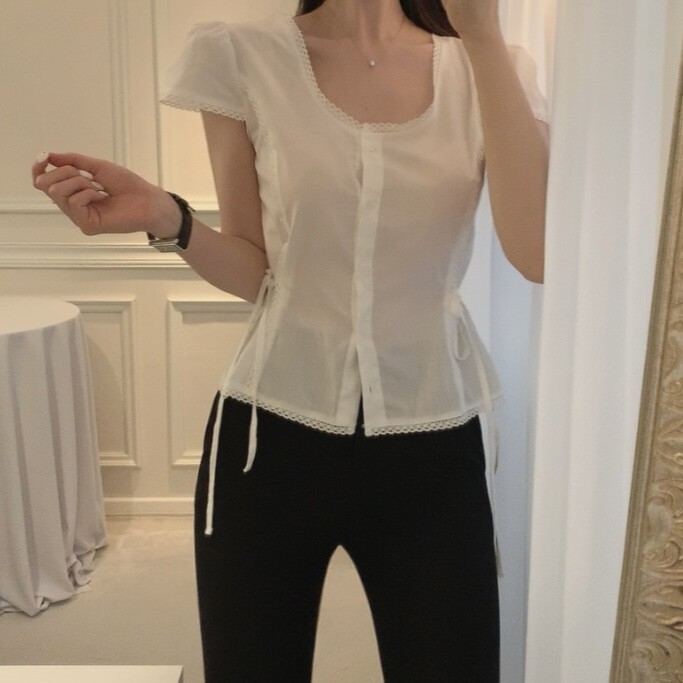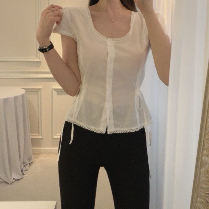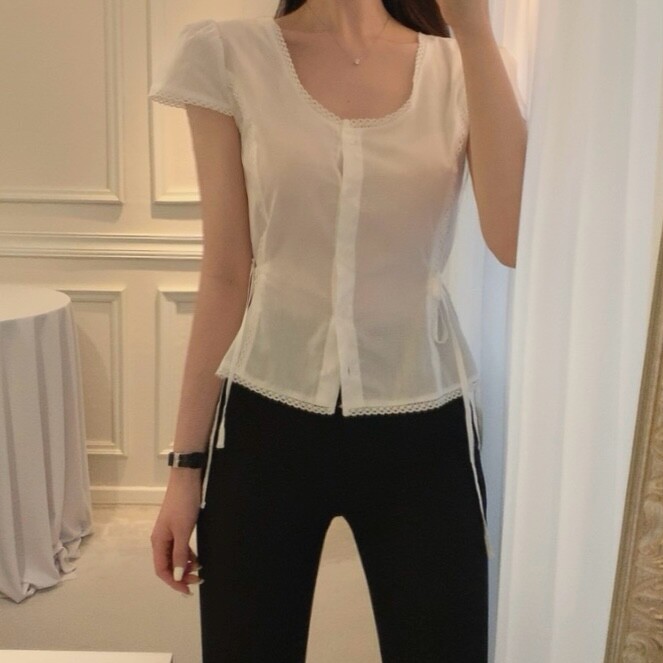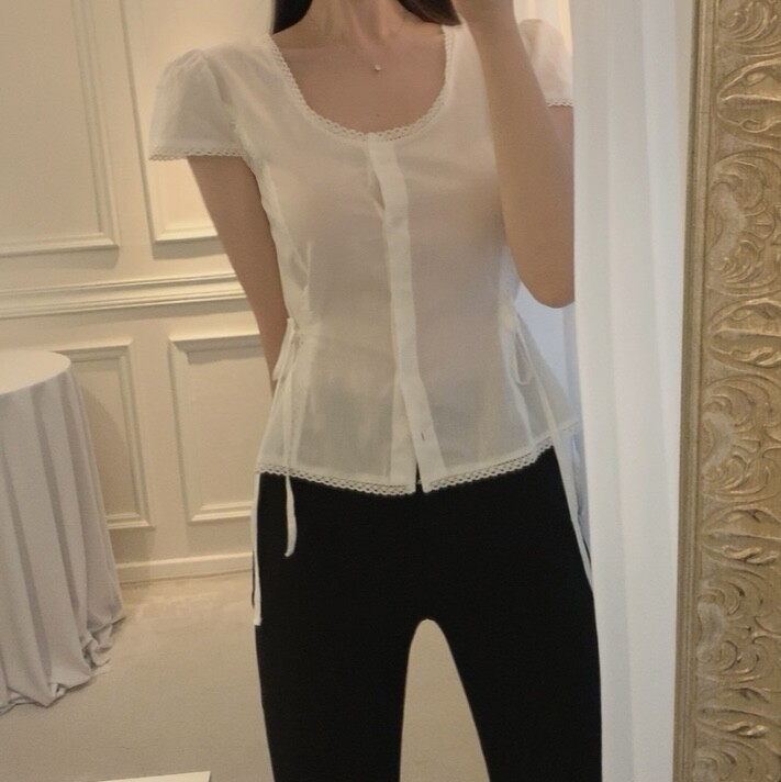 캡소매 반팔 레이스 허리끈 단추 숏 여신 블라우스 (데이트룩 여행코디 바캉스룩)