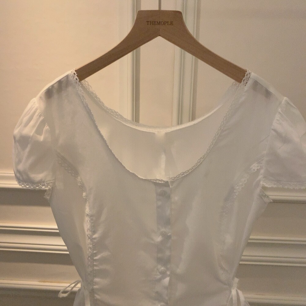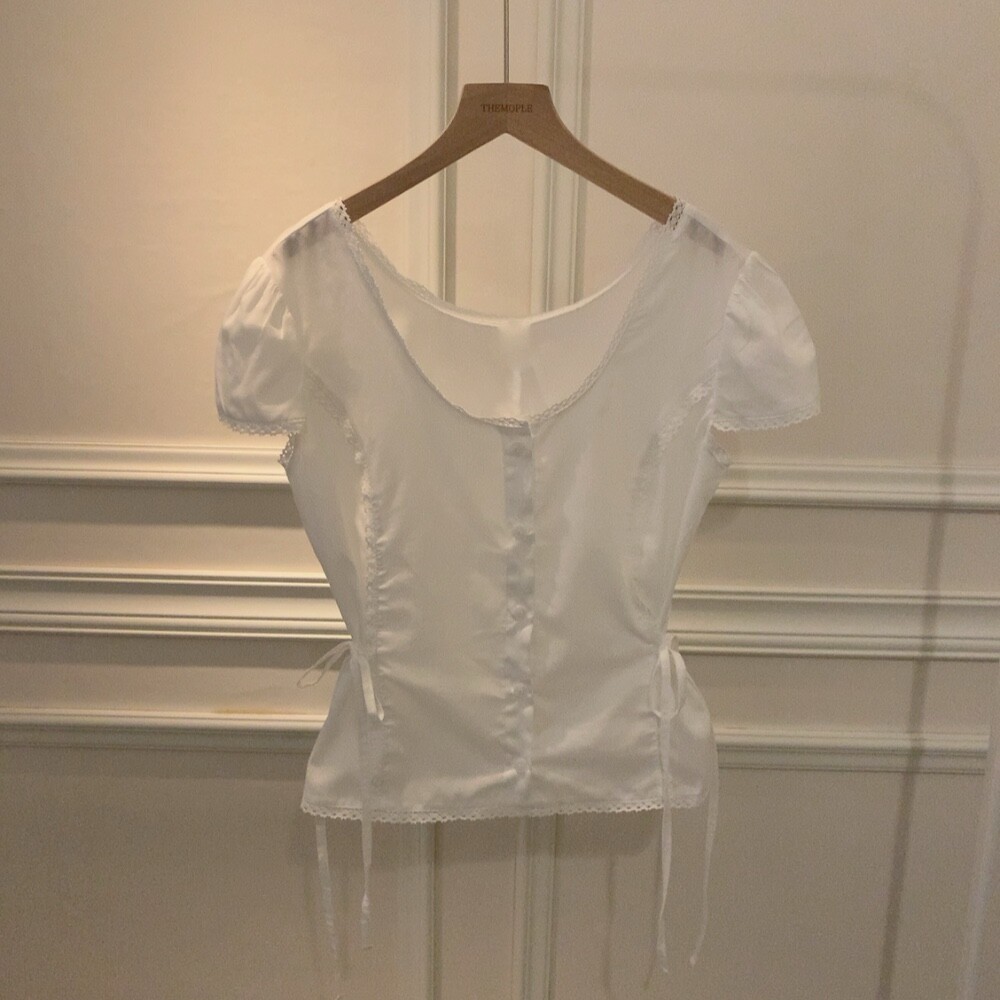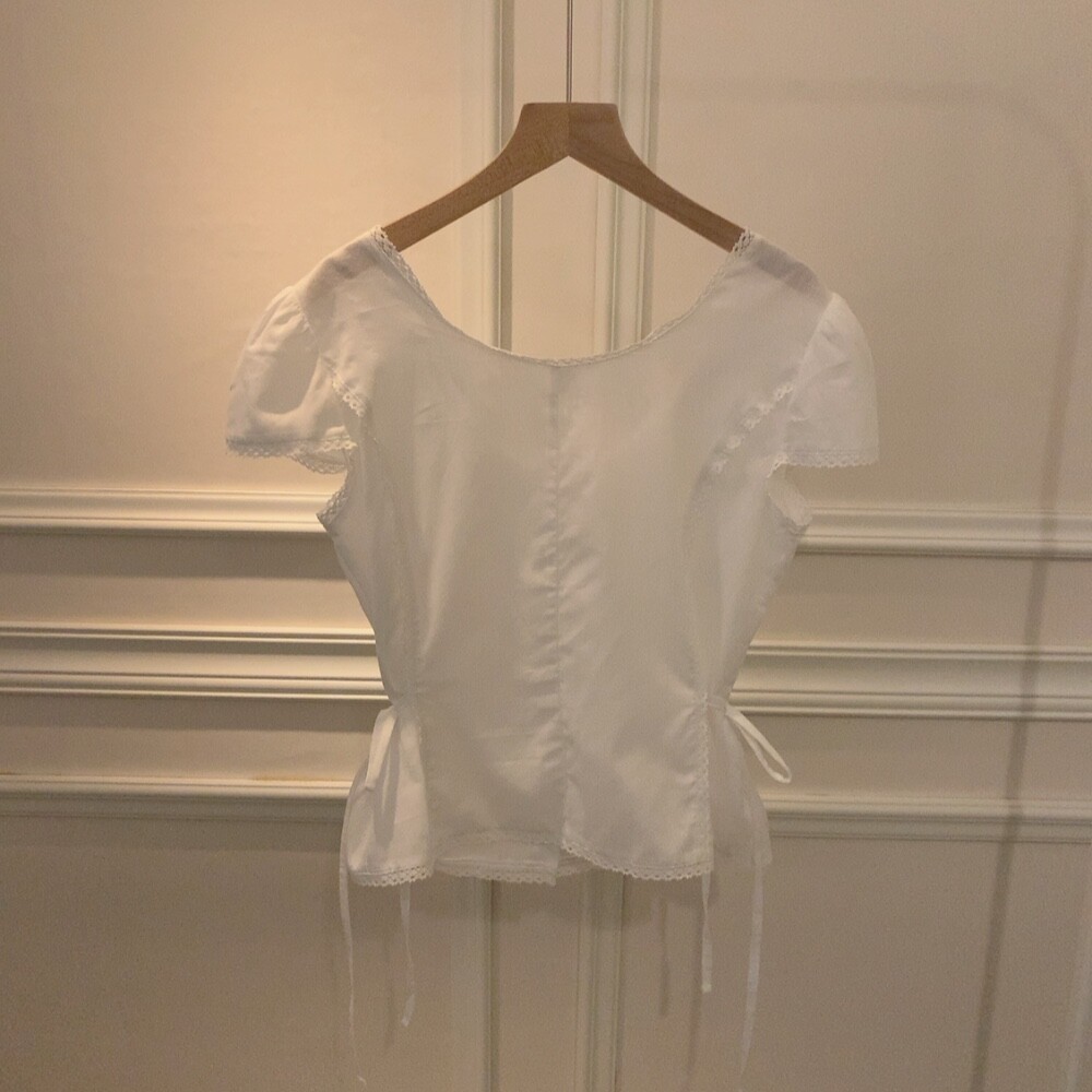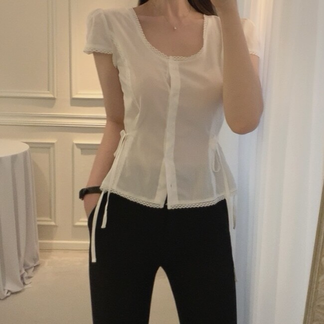 캡소매 반팔 레이스 허리끈 단추 숏 여신 블라우스 (데이트룩 여행코디 바캉스룩)
