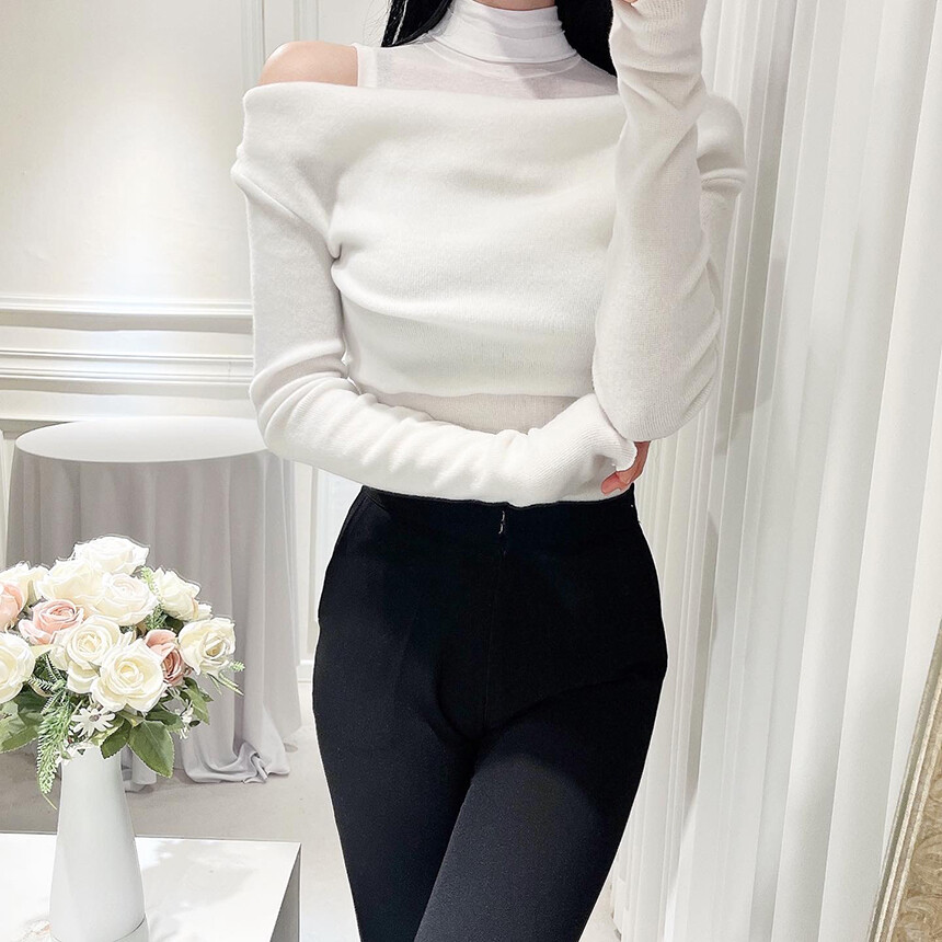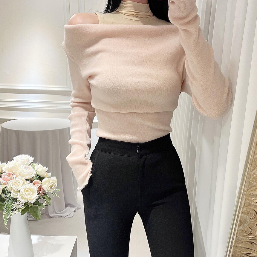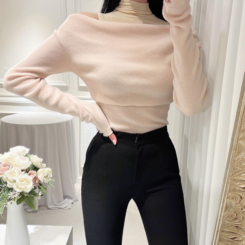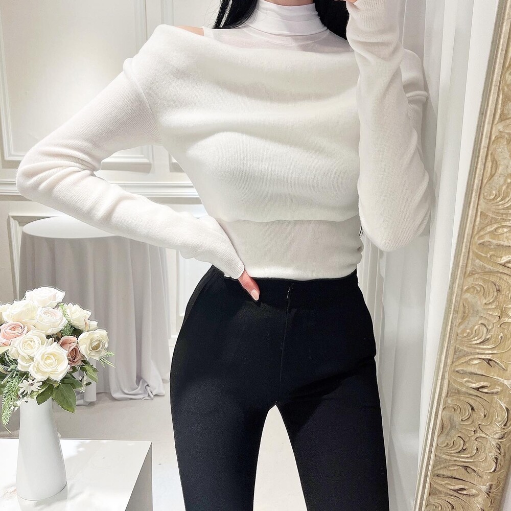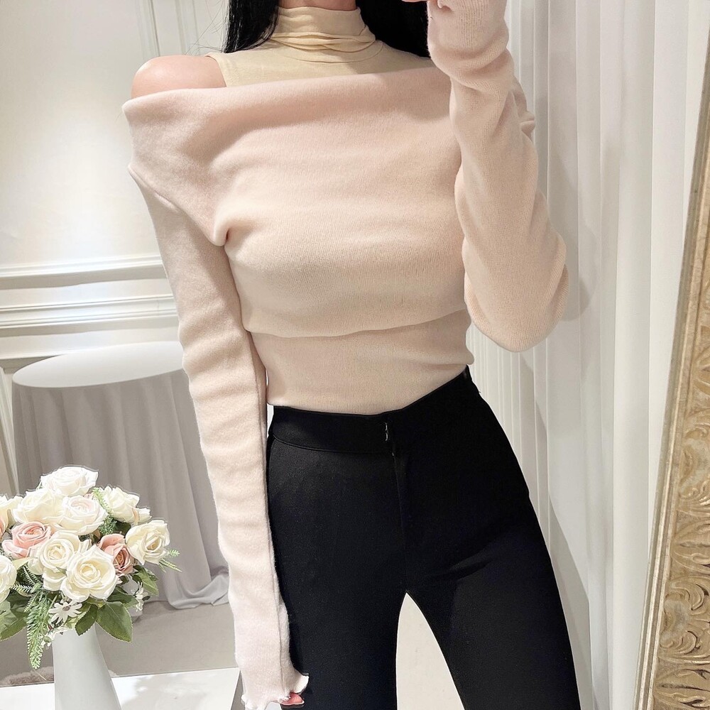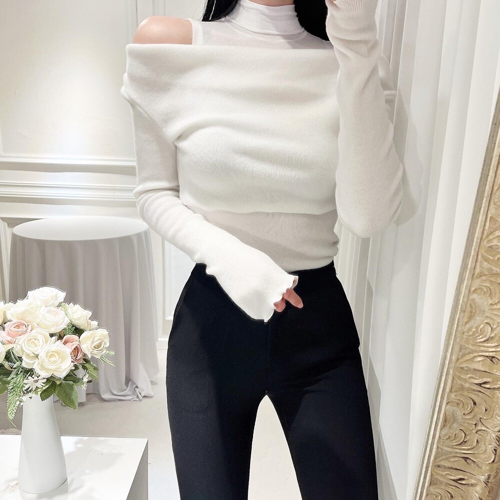[SALE 원가이하 세일] 폴라 민소매 레이어드 어깨 트임 기모 슬림핏 니트 티셔츠