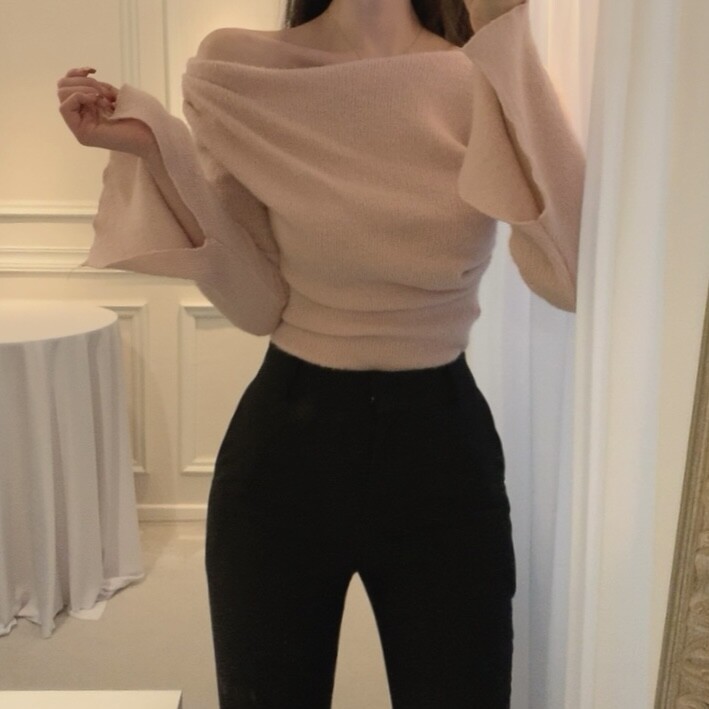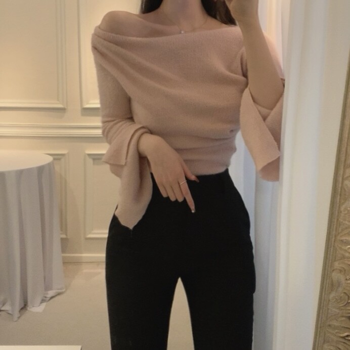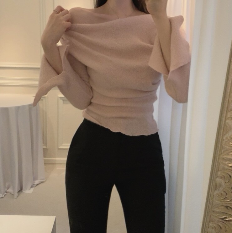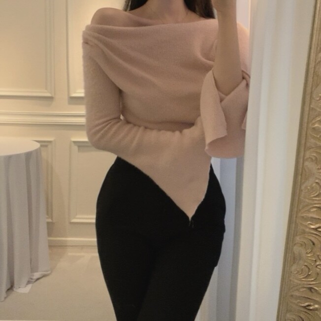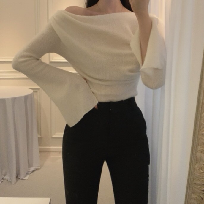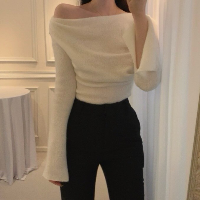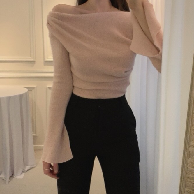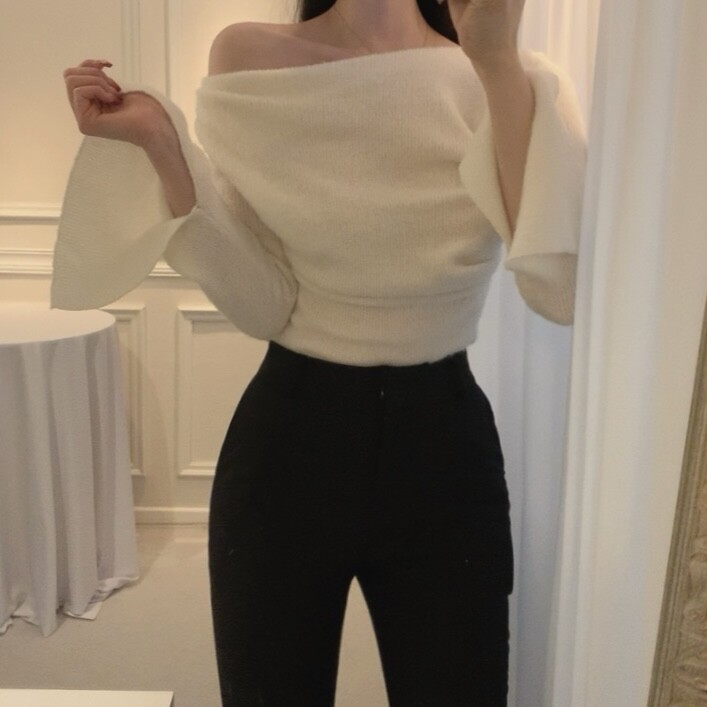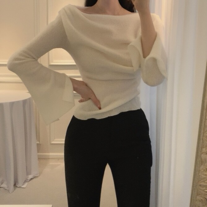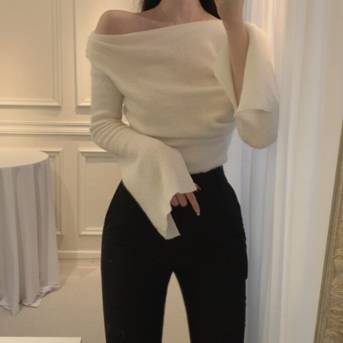 [원가이하 세일*당일출고] 울 소매 나팔 트임 여리여리 드레이프 주름 오프숄더 셔링 앙고라 니트