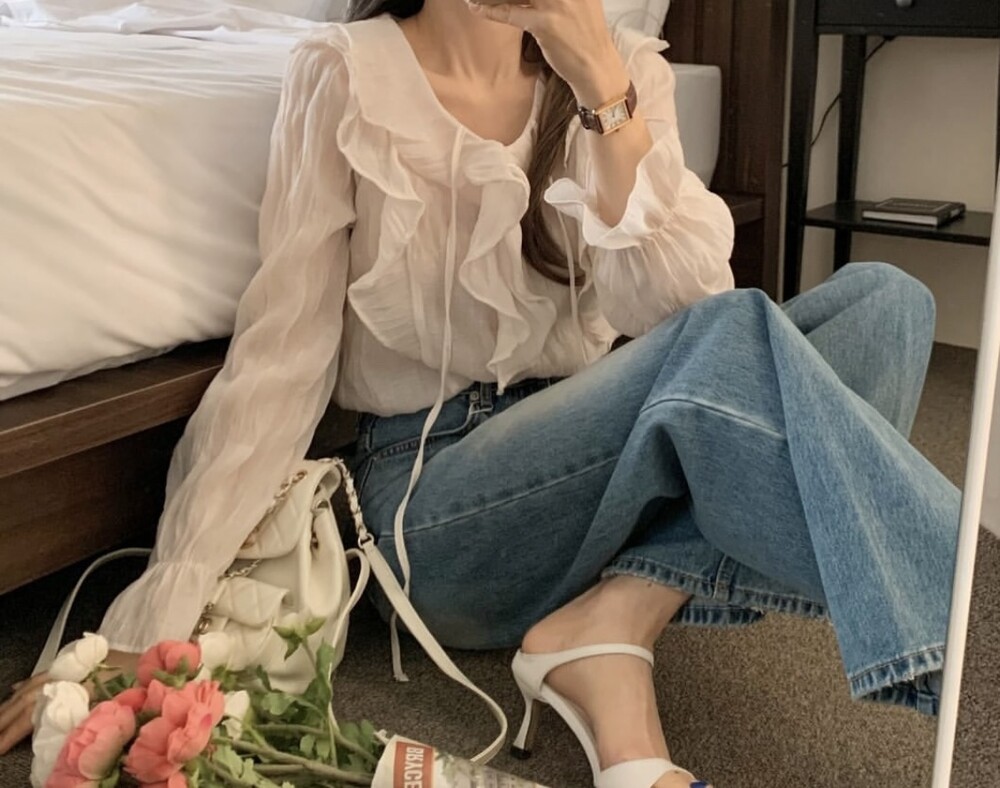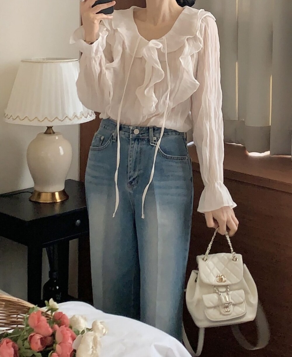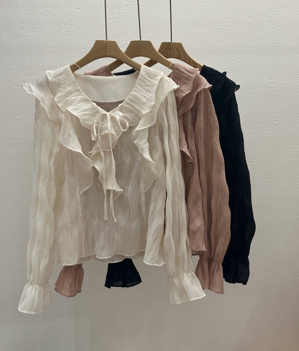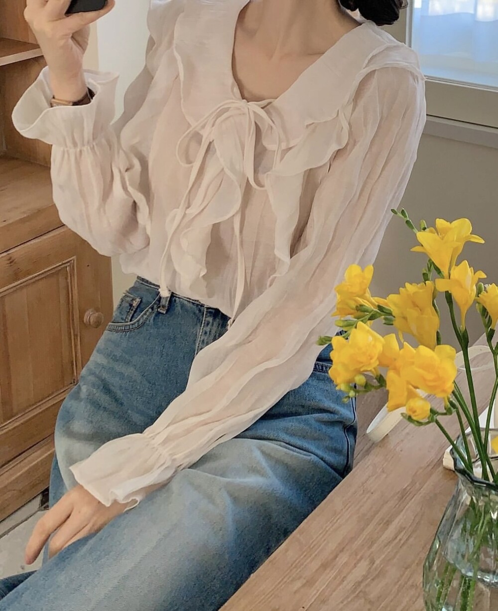 셔링 주름 프릴 끈 리본 여리여리 봄 블라우스 (데이트룩 하객룩 여행코디)