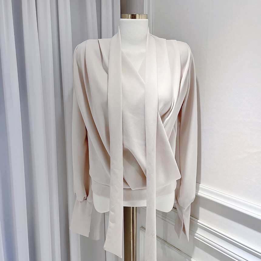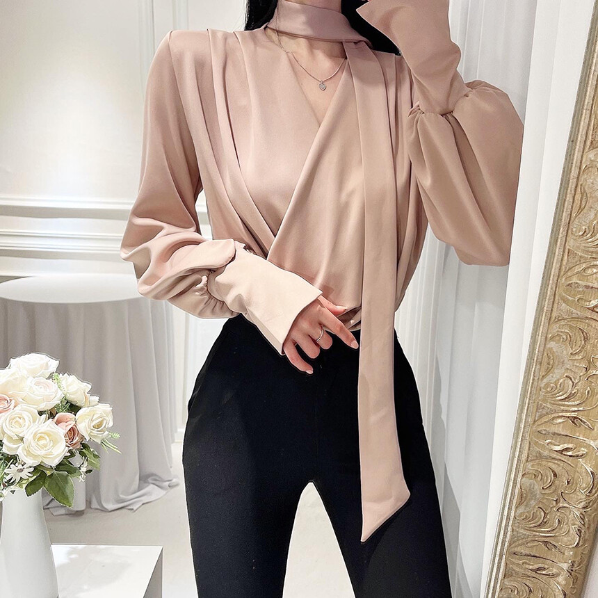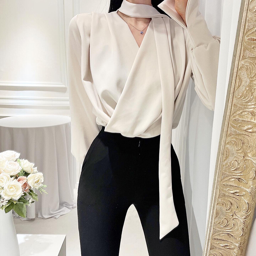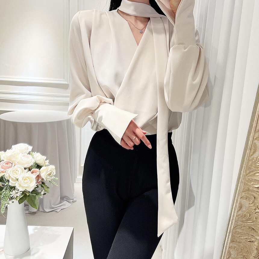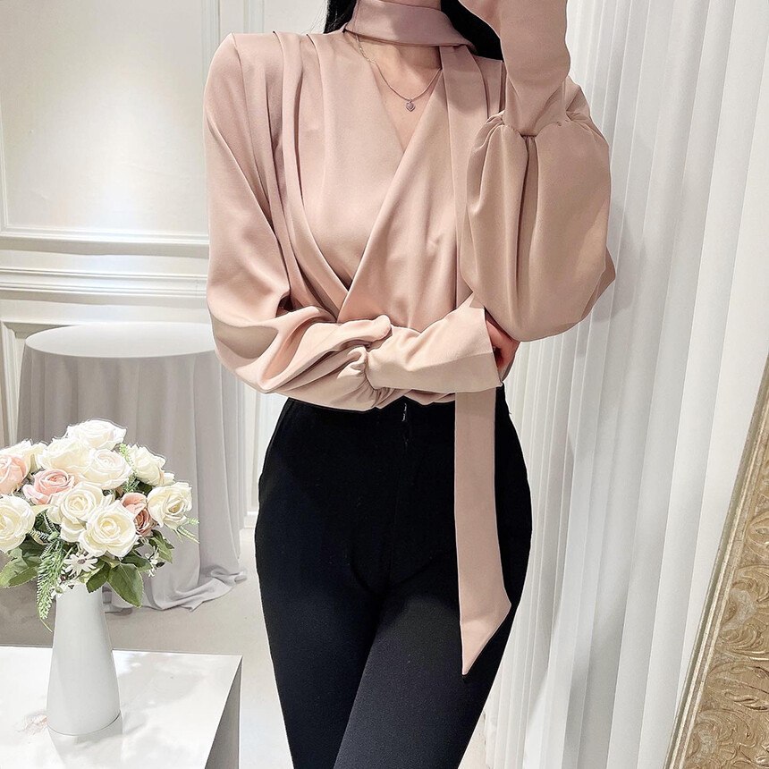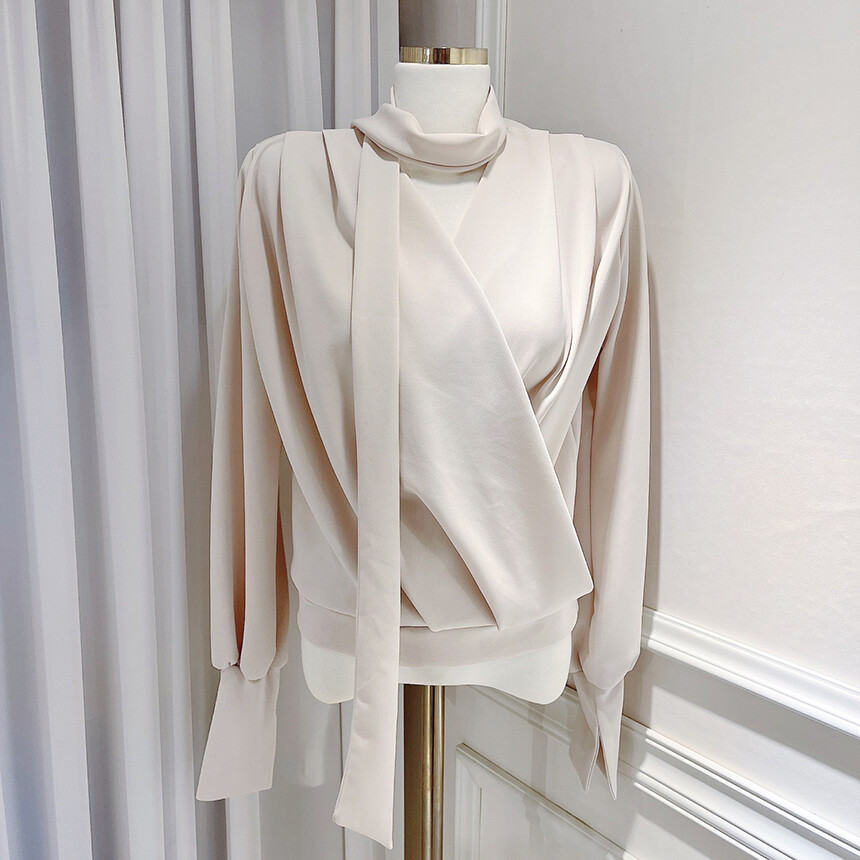 랩스타일 스카프 타이 셔링 드레이프 주름 스판 져지 블라우스 (하객룩 데이트룩 모임룩)