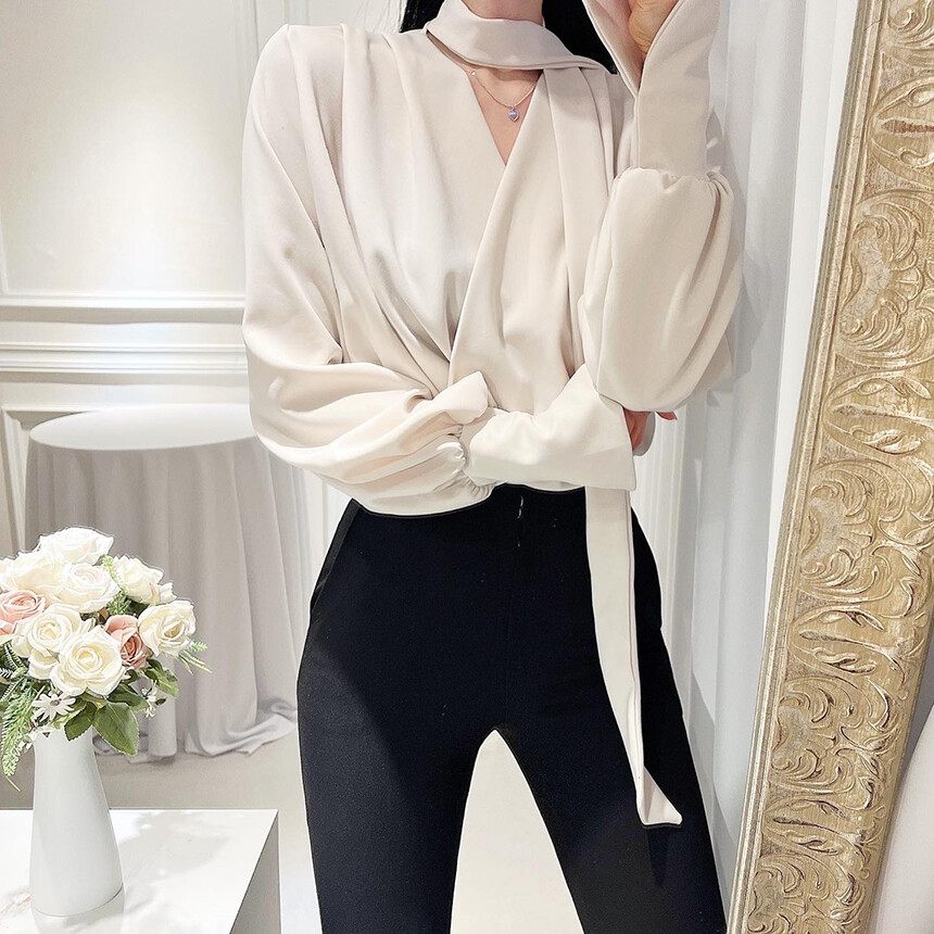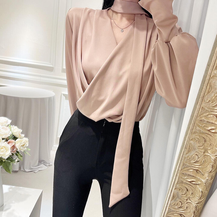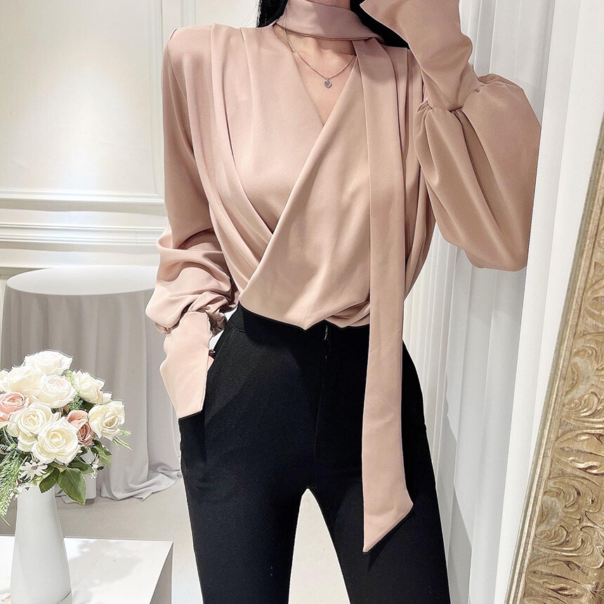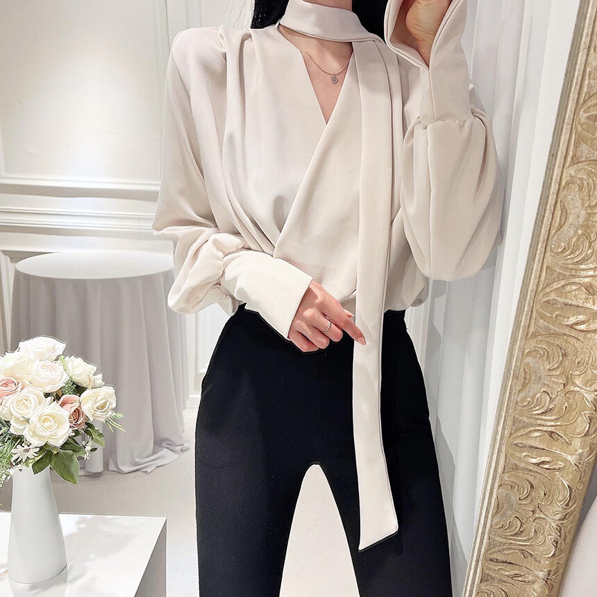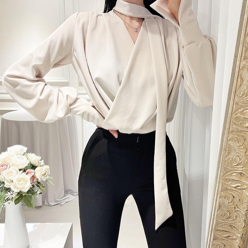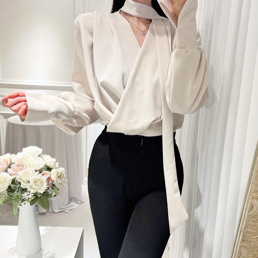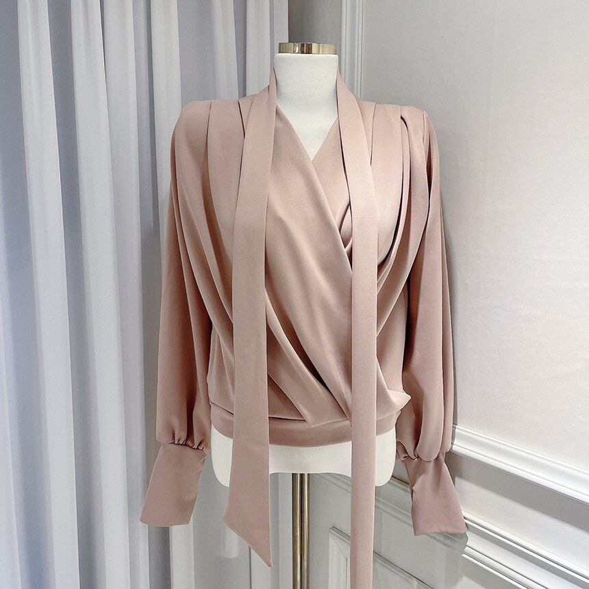 랩스타일 스카프 타이 셔링 드레이프 주름 스판 져지 블라우스 (하객룩 데이트룩 모임룩)
