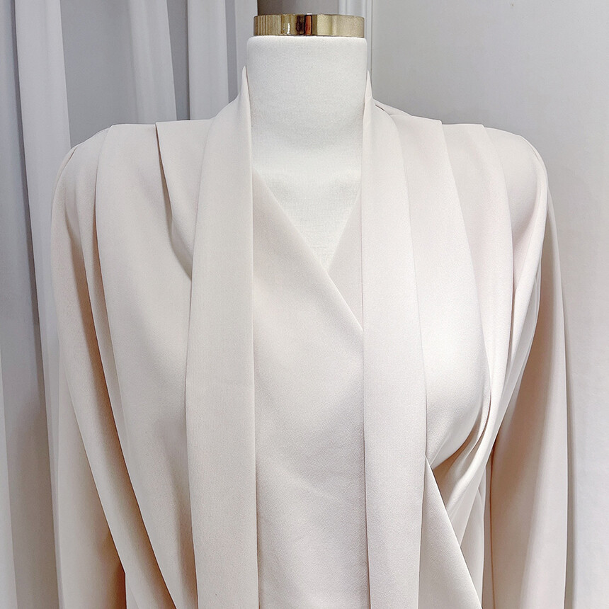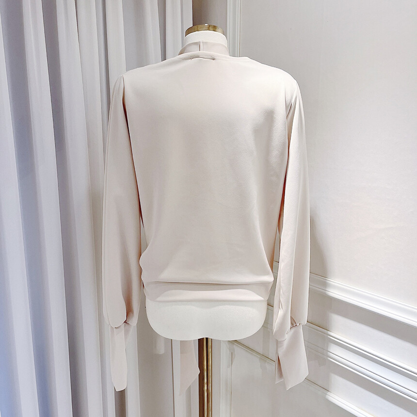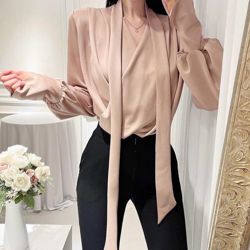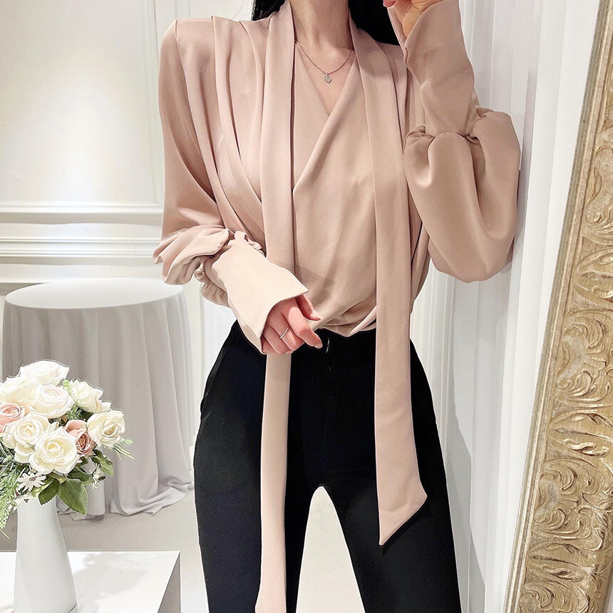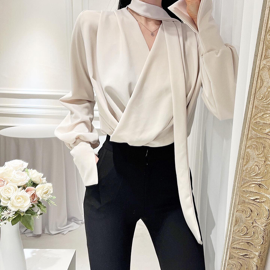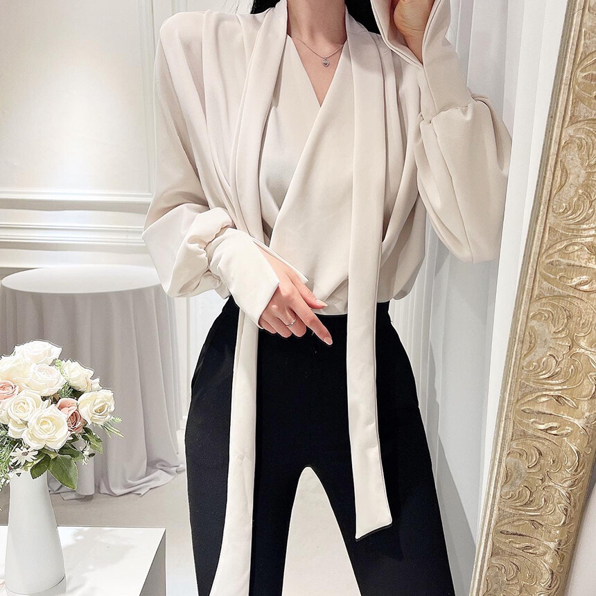 랩스타일 스카프 타이 셔링 드레이프 주름 스판 져지 블라우스 (하객룩 데이트룩 모임룩)