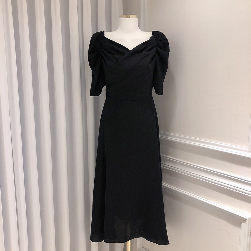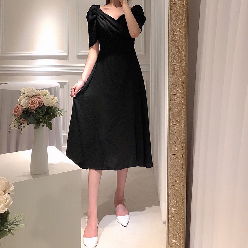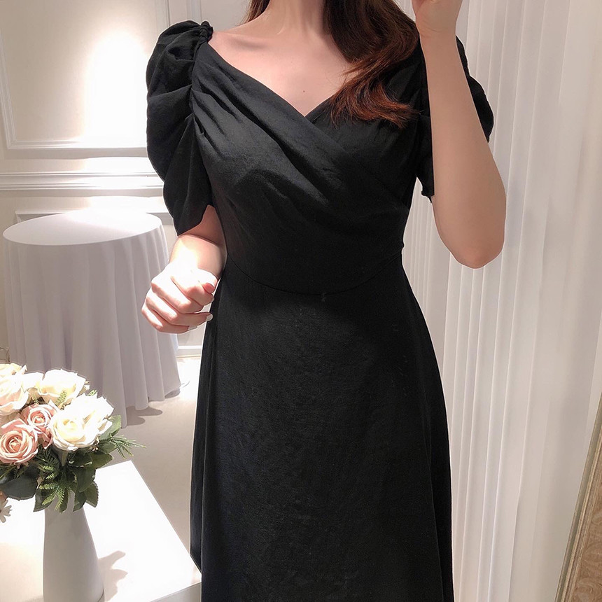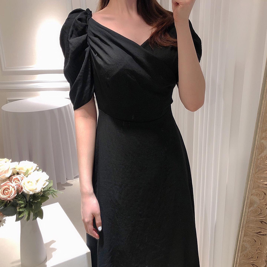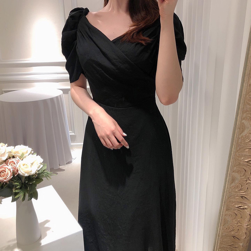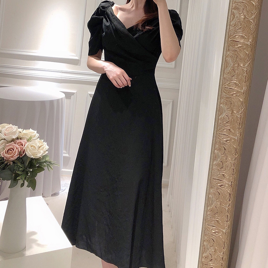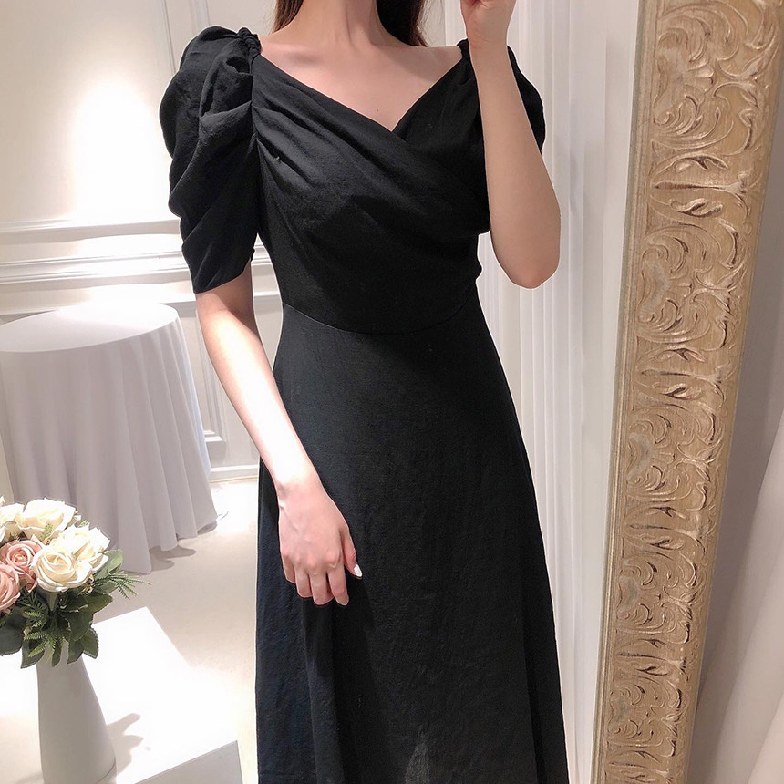 [원가이하 세일*당일출고] 어깨밴딩 퍼프 소매 에이라인 플레어 롱원피스 (하객룩 데이트룩 럭셔리룩)